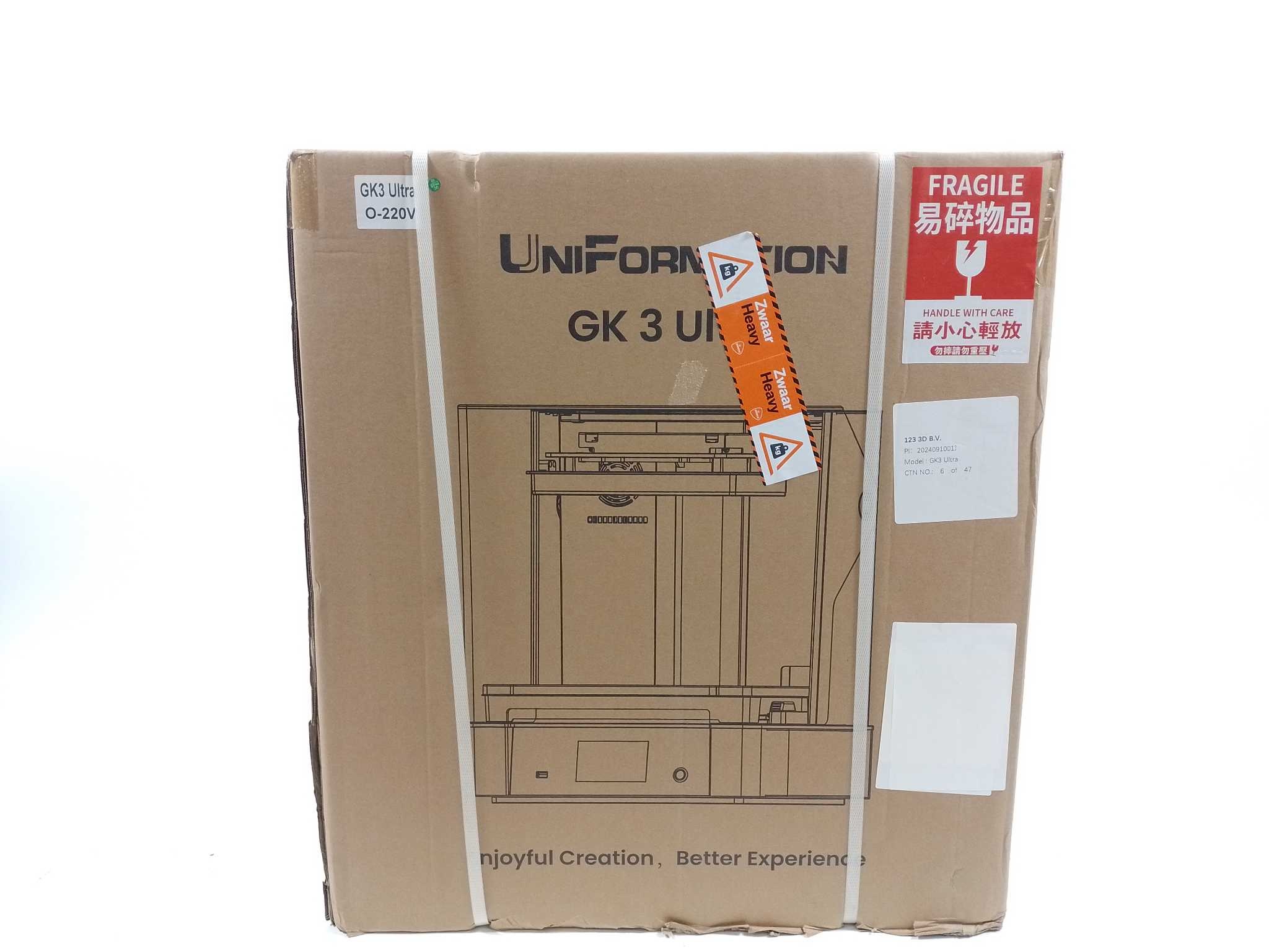 Uniformation 3D-Printer Resin GK3 Ultra - DKI00289. Uniformation GK3 Ultra 16K is een professionele resin 3D-printer met groot bouwvolume (300×160×300 mm) en haarscherpe 16K-resolutie (20×26 µm pixels). Het robuuste, trillingsarme railsysteem en automatis