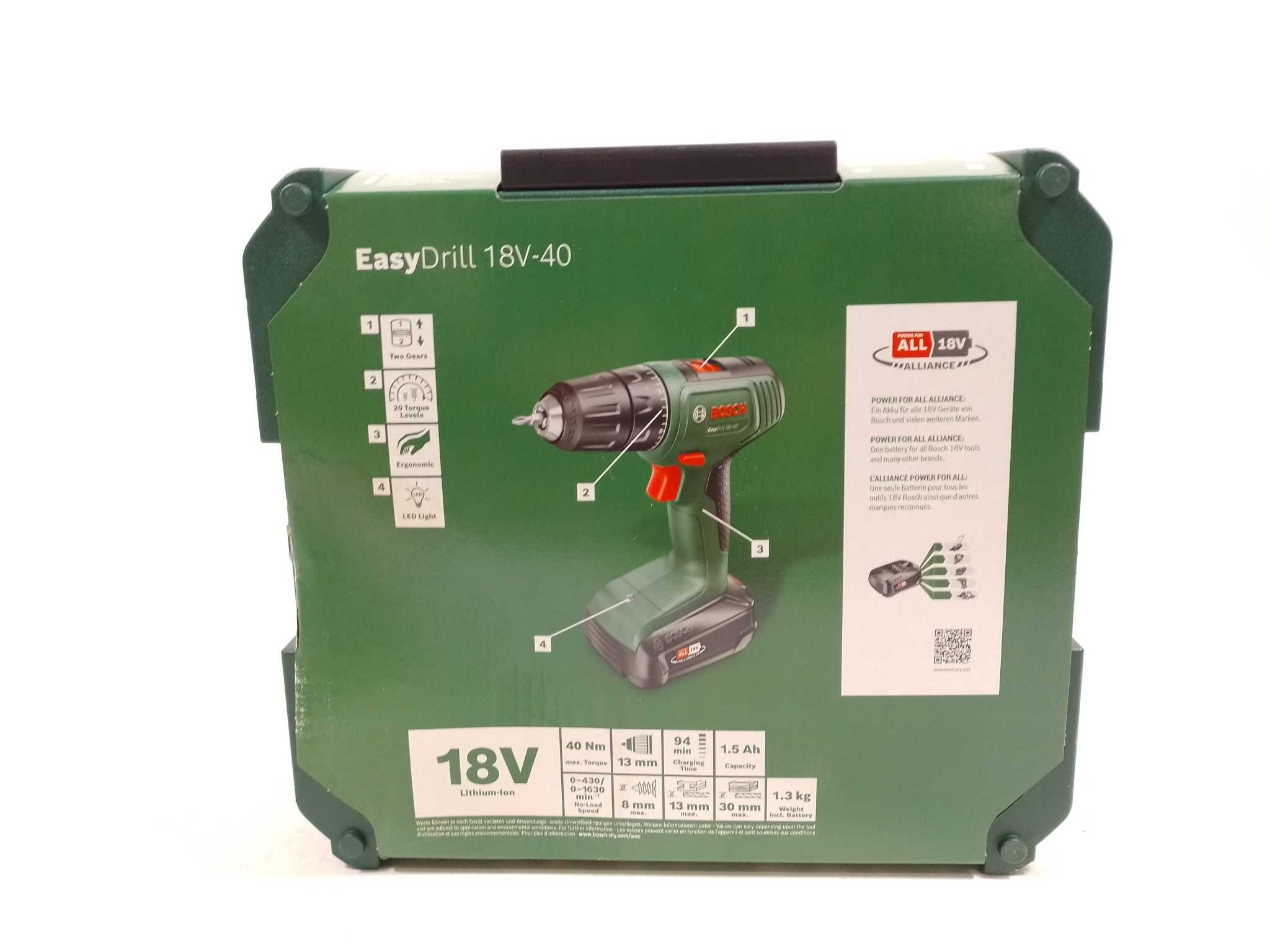 Bosch Accu Schroefboormachine - EasyDrill 18V-40 - met Accessoireset. De Bosch EasyDrill 18V-40 is de compacte accu schroefboormachine voor klussen in hout, metaal en kunststof. Met 2 versnellingen, 20 koppelstanden, 13-mm snelspanboorkop en maximaal 40 Nm werk je nauwkeurig en krachtig. Het LED-licht geeft zicht in donkere hoeken. Onderdeel van het 18V Power for All-systeem. Meegeleverd: 1,5 Ah accu, AL 1810 CV-lader, 241-delige accessoireset en SystemBox. Ideaal voor montage, renovatie en dagelijks onderhoud; licht, ergonomisch en klaar voor elk project. Snel bitwisselen dankzij eenhandige 13-mm boorkop.