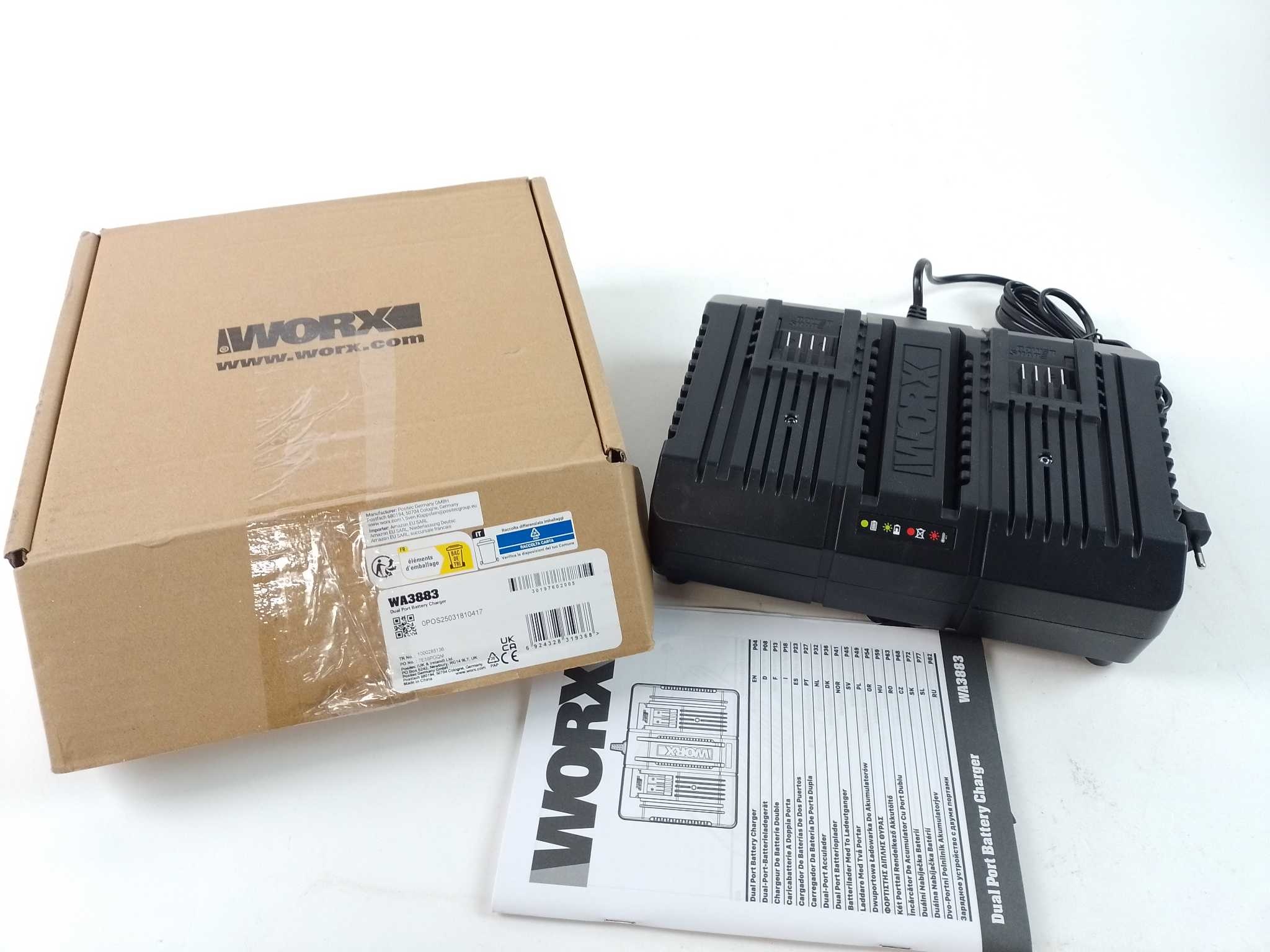 Worx Acculader Dual WA3883. Laad jouw Worx PowerShare gereedschap sneller op met de Worx WA3883 dubbele oplader. Deze 20V snellader levert tot 4 A laadstroom en kan twee accu’s gelijktijdig of afzonderlijk laden. Duidelijke LED-indicatoren tonen de laadto