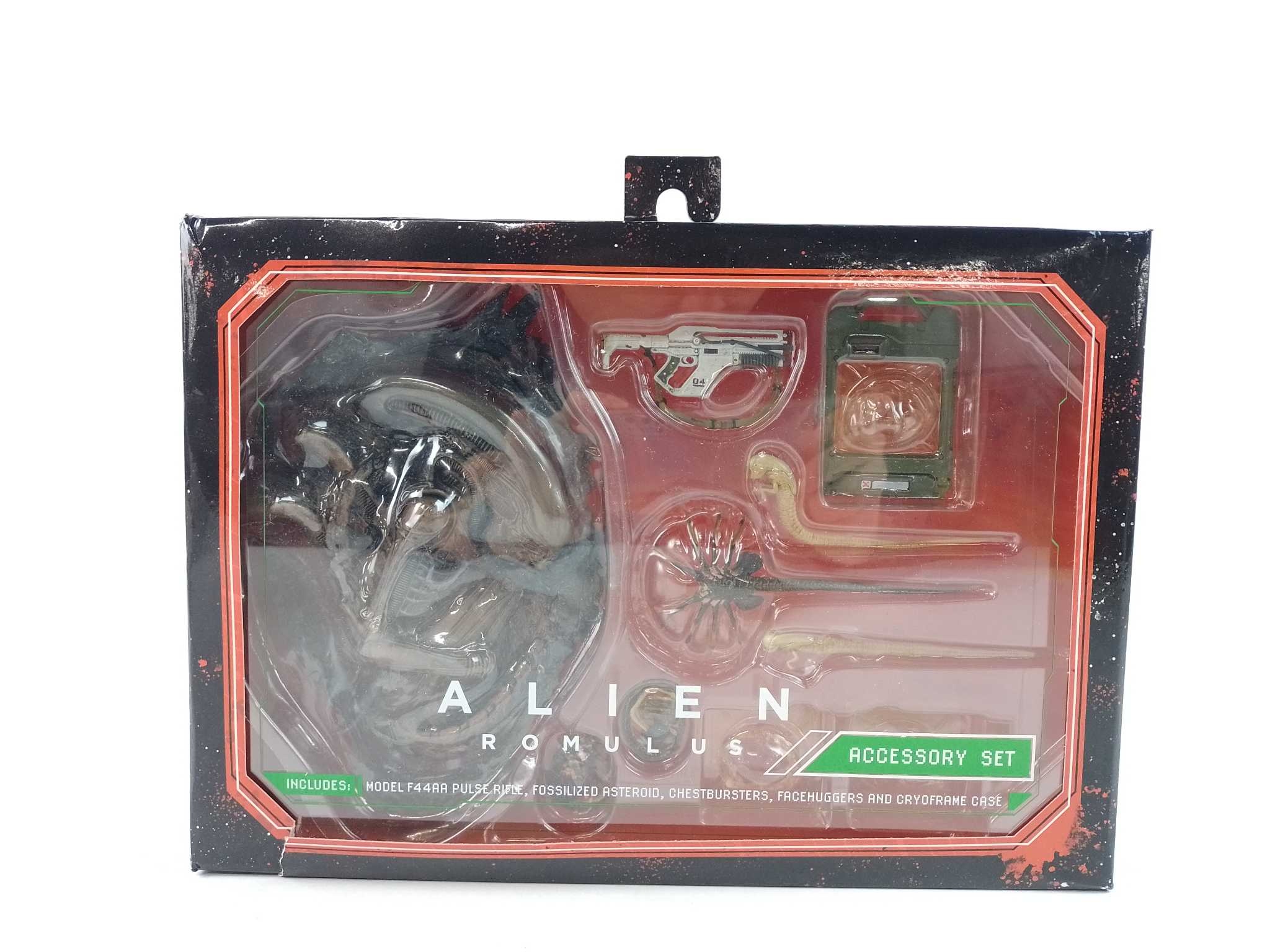 Neca Actiefiguur Alien Romulus - Accessoires Set. Breid je Alien-collectie uit met de NECA Alien: Romulus Accessory Set op 7-inch schaal. Deze set bevat een model F44AA Pulse Rifle, asteroid-basis met gefossiliseerde Xenomorph XX121, facehugger en twee ch