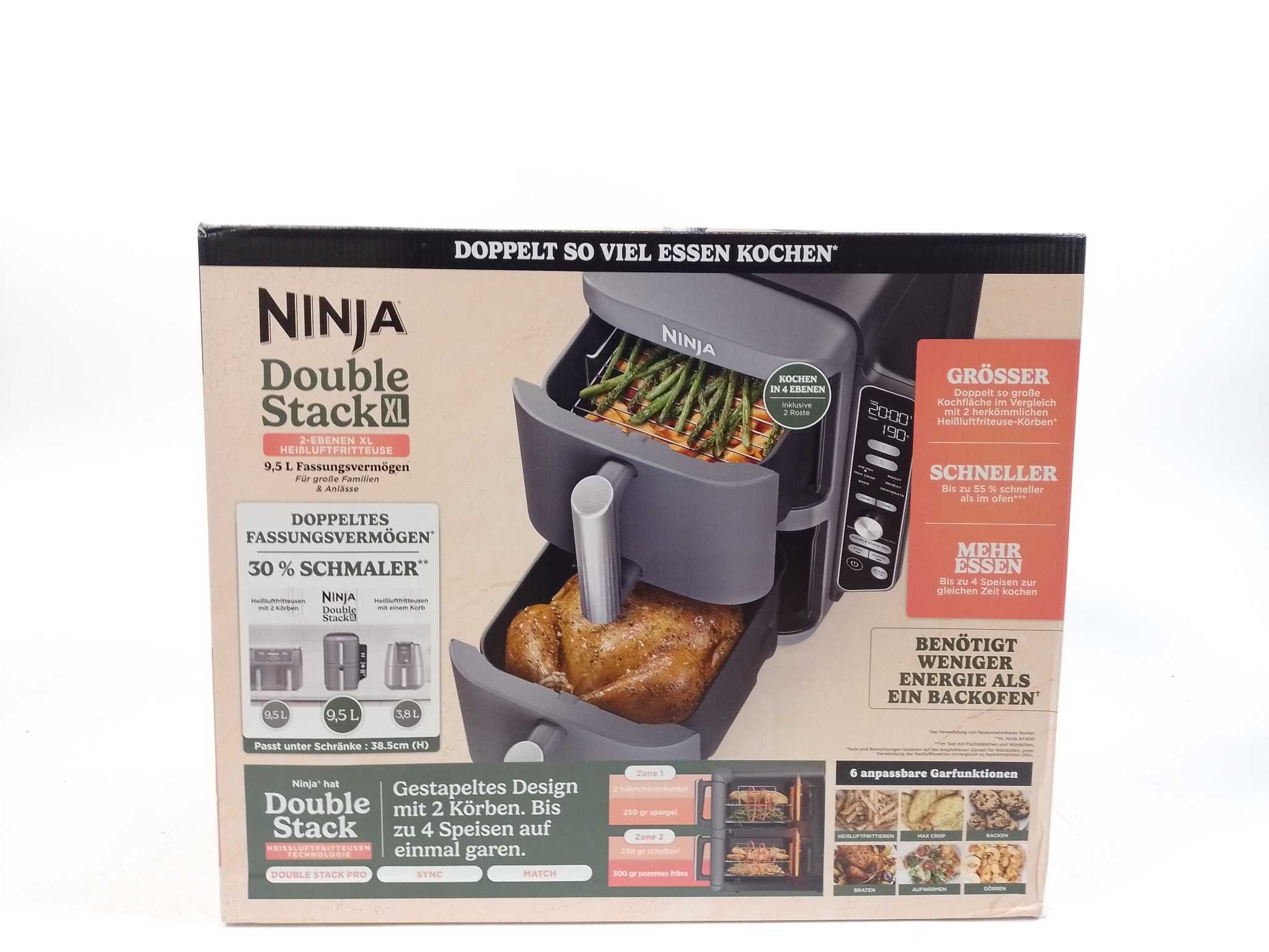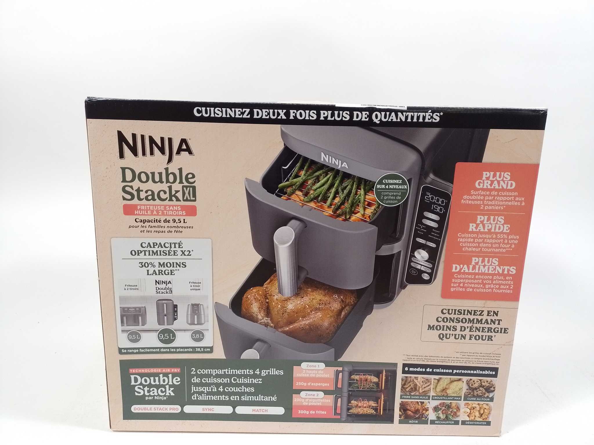 Ninja Airfryer XXL Double Stack - SL400EU. De Ninja Double Stack XL Air Fryer biedt 9,5 liter capaciteit voor het bereiden van grotere maaltijden. Met 2470W vermogen bereid je gerechten snel en gelijkmatig. De twee aparte kookcompartimenten maken het moge