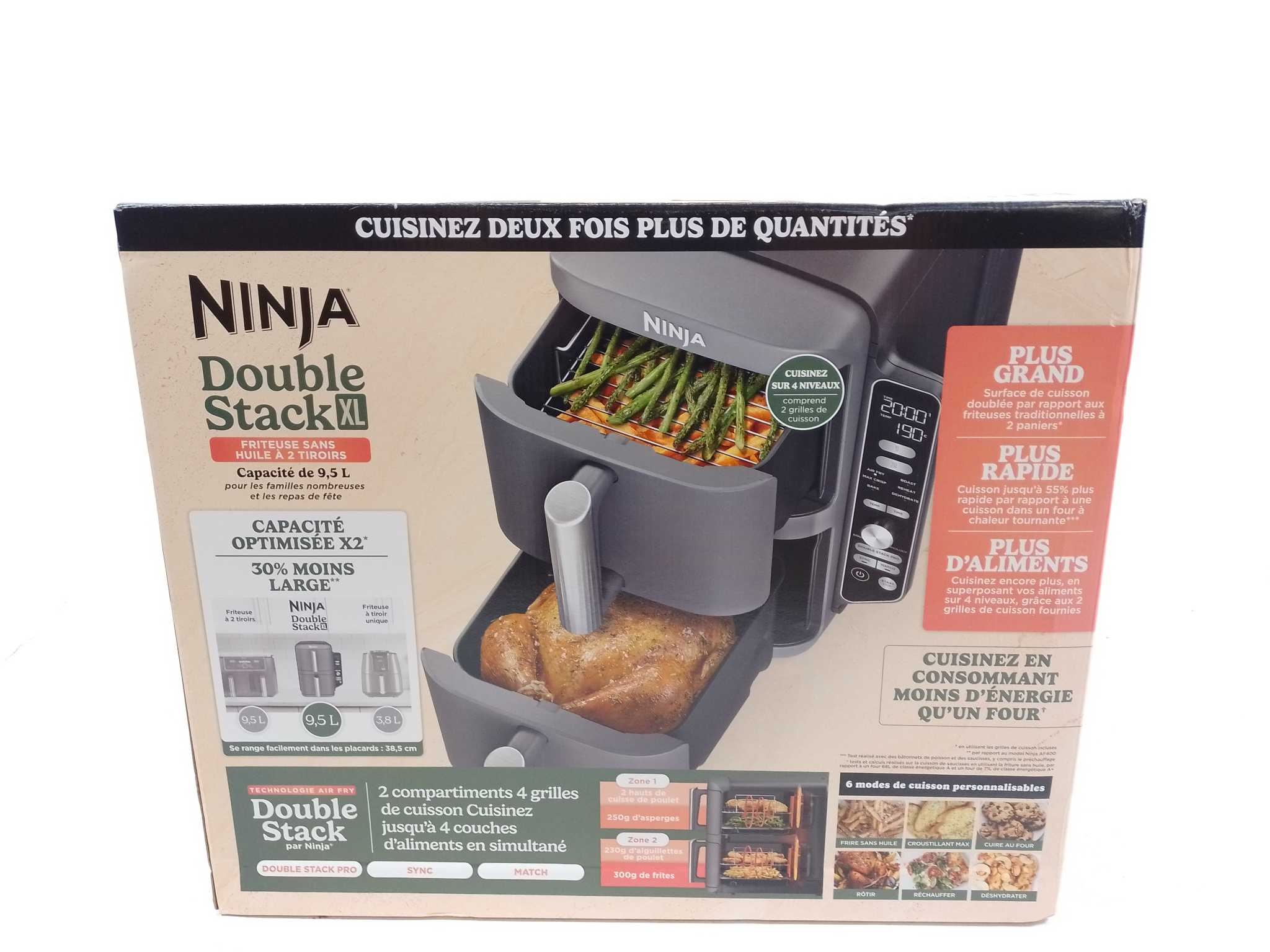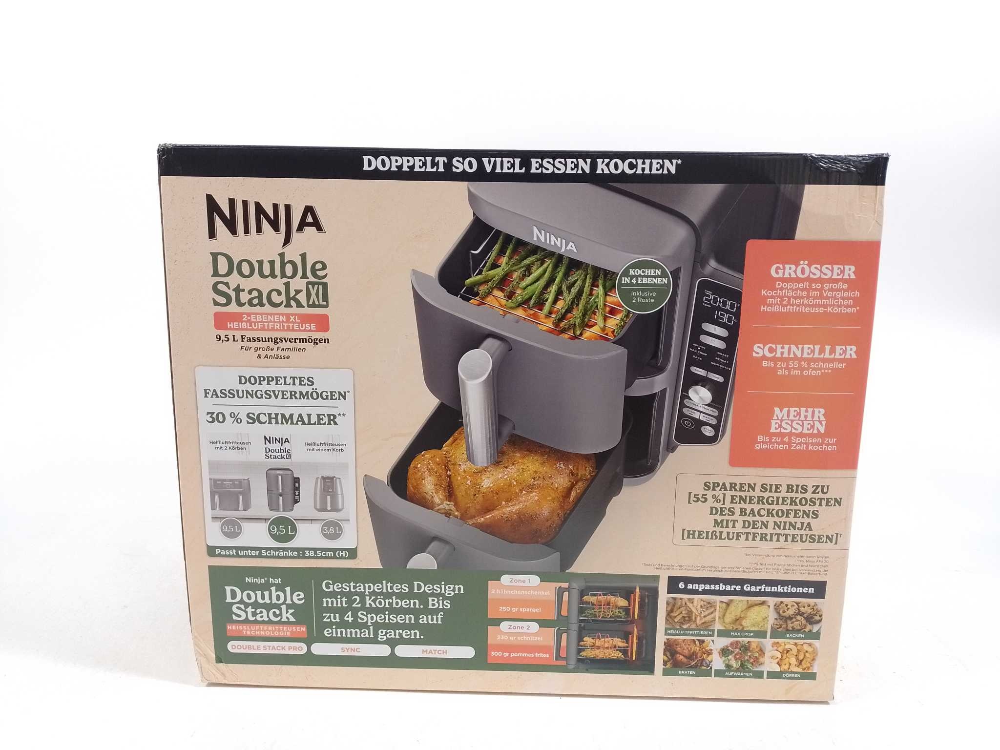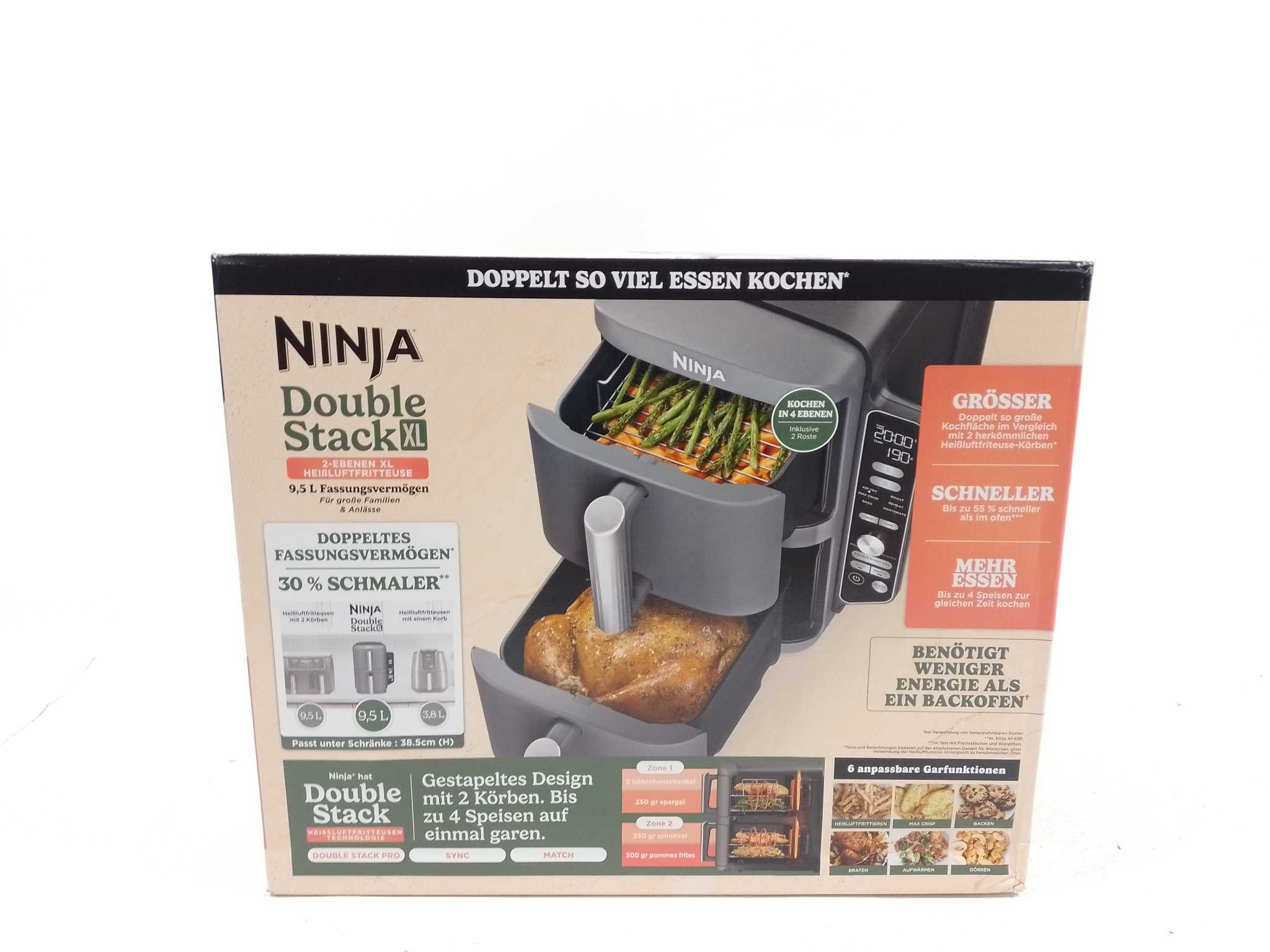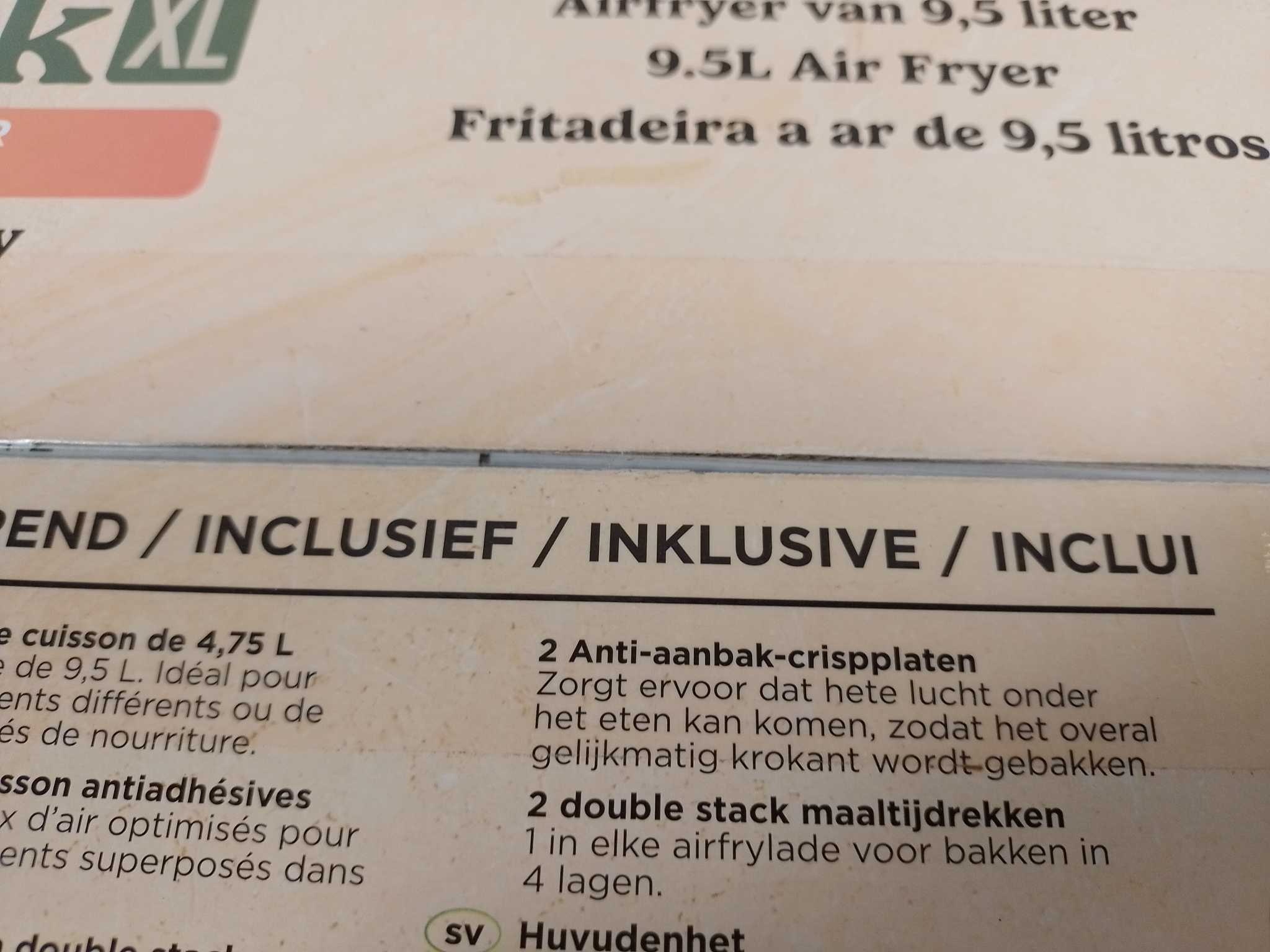 Ninja Airfryer XXL Double Stack - SL400EU. De Ninja Double Stack XL Air Fryer biedt 9,5 liter capaciteit voor het bereiden van grotere maaltijden. Met 2470W vermogen bereid je gerechten snel en gelijkmatig. De twee aparte kookcompartimenten maken het moge