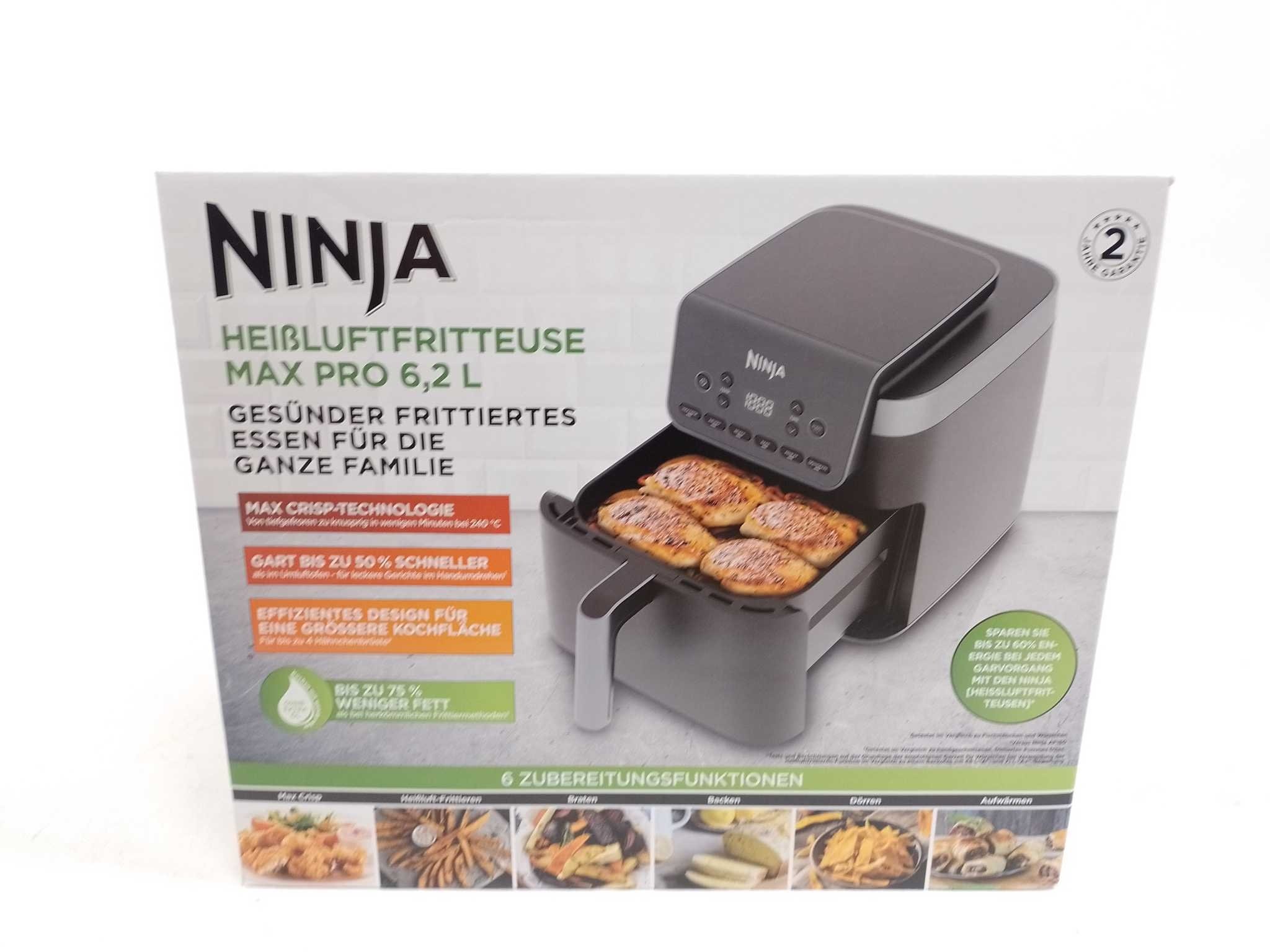 Ninja Airfryer XXL - Max Pro - AF180EU. De Ninja AF180EU Max Pro airfryer biedt een royale capaciteit van 6,2 liter en een vermogen van 2.000 W. Deze veelzijdige airfryer heeft 6 automatische functies: Max Crisp, Air Fry, Roast, Bake, Warm en Dehydrate. D