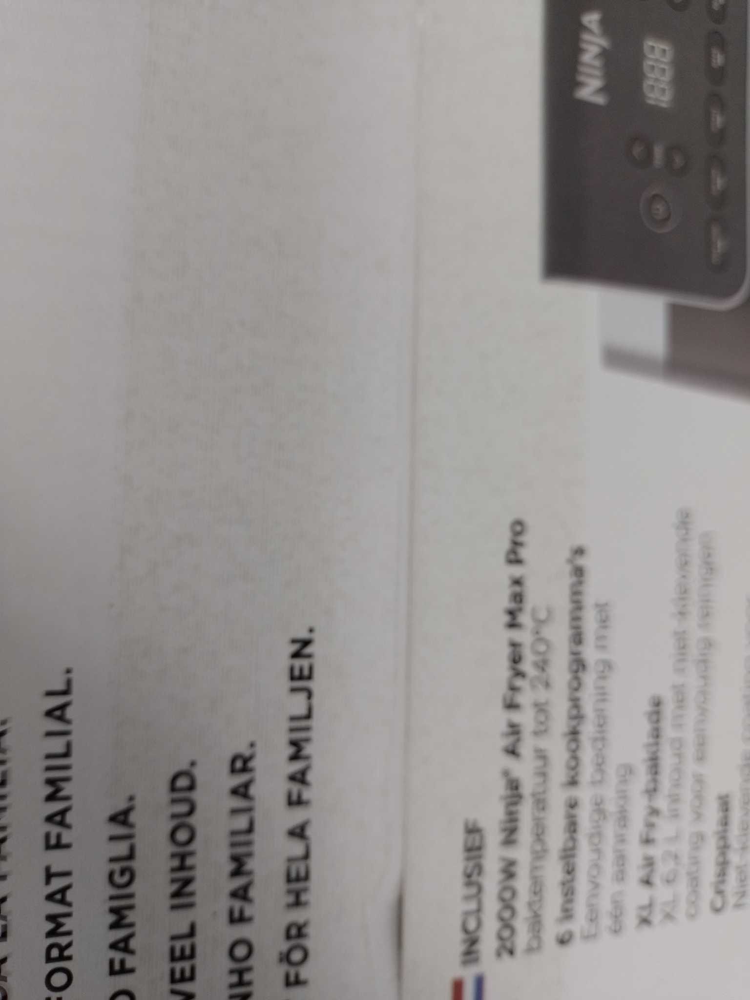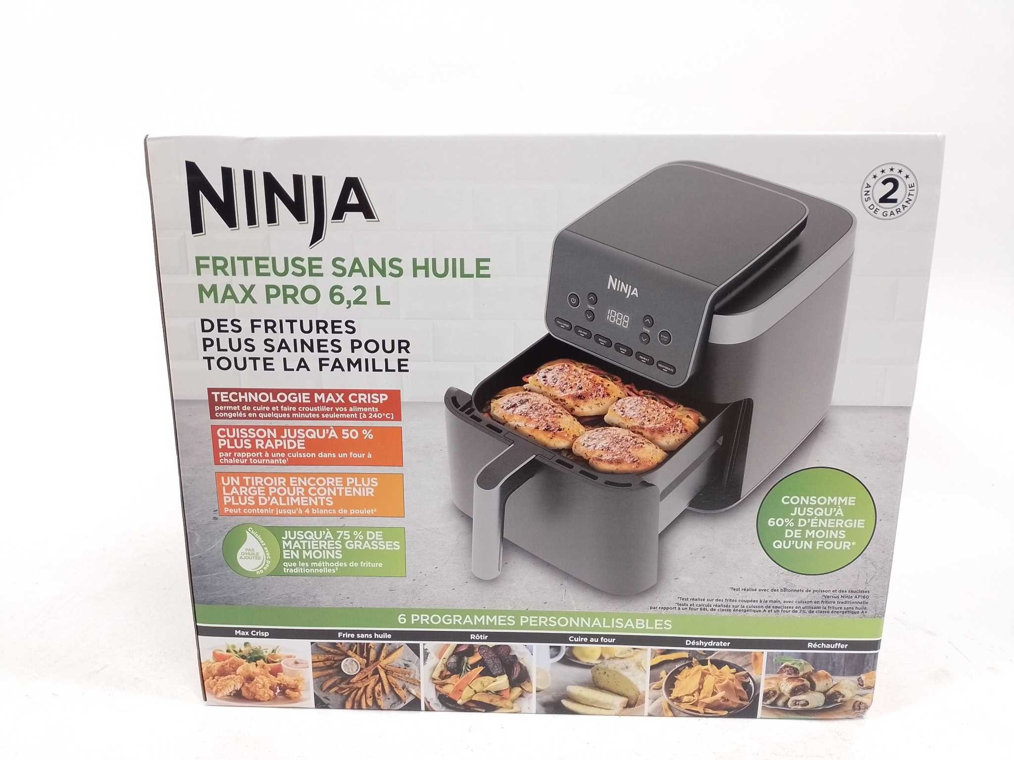 Ninja Airfryer XXL - Max Pro - AF180EU. De Ninja AF180EU Max Pro airfryer biedt een royale capaciteit van 6,2 liter en een vermogen van 2.000 W. Deze veelzijdige airfryer heeft 6 automatische functies: Max Crisp, Air Fry, Roast, Bake, Warm en Dehydrate. Dankzij de efficiënte luchtcirculatie behaalt hij knapperige resultaten met weinig olie en bespaart tot 60 % energie vergeleken met een conventionele oven. De uitneembare onderdelen zijn anti-aanbak en vaatwasmachinebestendig. Ideaal voor gezinnen die snel en gezond willen koken.