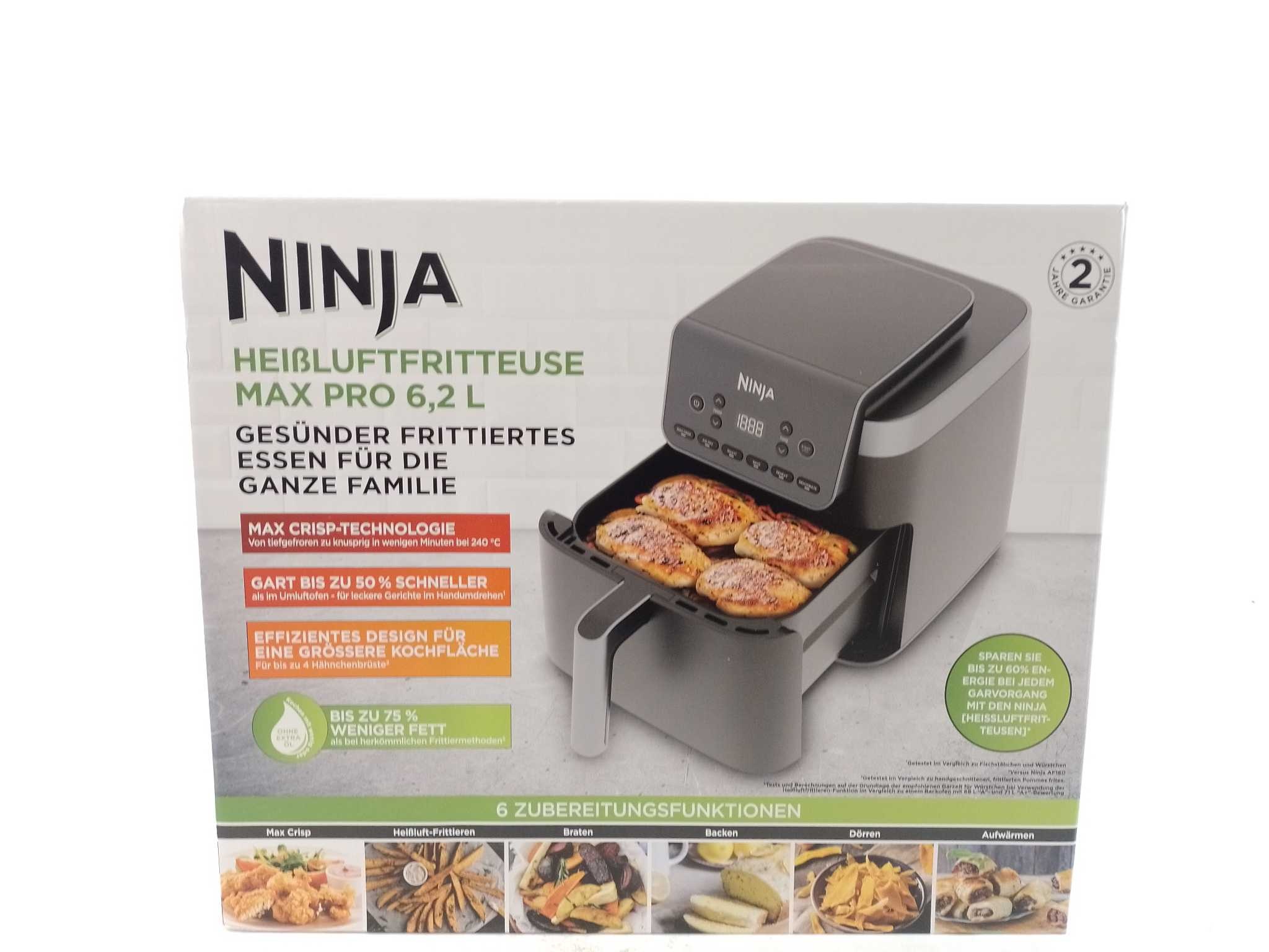 Ninja Airfryer XXL - Max Pro - AF180EU. De Ninja AF180EU Max Pro airfryer biedt een royale capaciteit van 6,2 liter en een vermogen van 2.000 W. Deze veelzijdige airfryer heeft 6 automatische functies: Max Crisp, Air Fry, Roast, Bake, Warm en Dehydrate. D