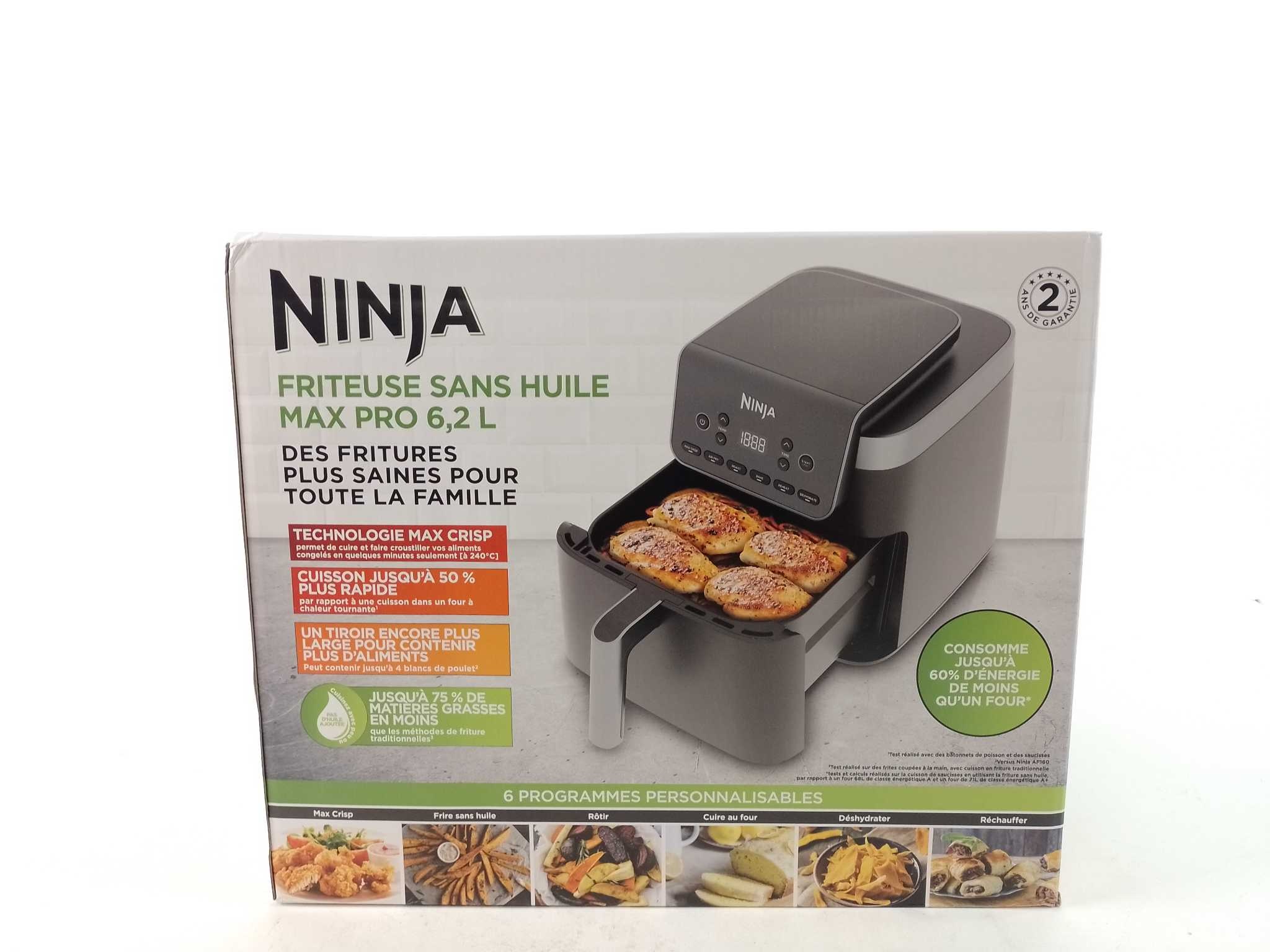 Ninja Airfryer XXL - Max Pro - AF180EU. De Ninja AF180EU Max Pro airfryer biedt een royale capaciteit van 6,2 liter en een vermogen van 2.000 W. Deze veelzijdige airfryer heeft 6 automatische functies: Max Crisp, Air Fry, Roast, Bake, Warm en Dehydrate. Dankzij de efficiënte luchtcirculatie behaalt hij knapperige resultaten met weinig olie en bespaart tot 60 % energie vergeleken met een conventionele oven. De uitneembare onderdelen zijn anti-aanbak en vaatwasmachinebestendig. Ideaal voor gezinnen die snel en gezond willen koken.