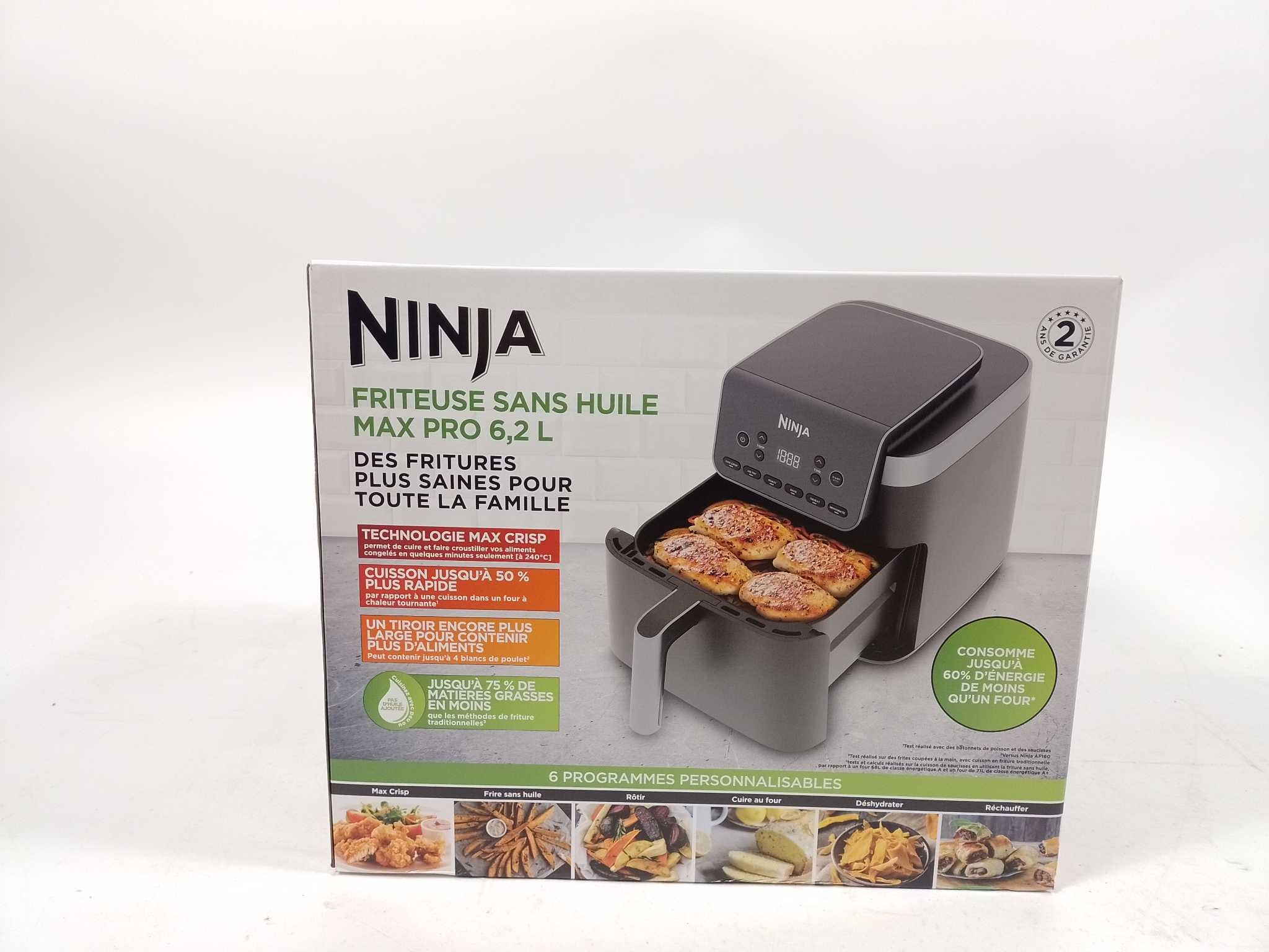 Ninja Airfryer XXL - Max Pro - AF180EU. De Ninja AF180EU Max Pro airfryer biedt een royale capaciteit van 6,2 liter en een vermogen van 2.000 W. Deze veelzijdige airfryer heeft 6 automatische functies: Max Crisp, Air Fry, Roast, Bake, Warm en Dehydrate. Dankzij de efficiënte luchtcirculatie behaalt hij knapperige resultaten met weinig olie en bespaart tot 60 % energie vergeleken met een conventionele oven. De uitneembare onderdelen zijn anti-aanbak en vaatwasmachinebestendig. Ideaal voor gezinnen die snel en gezond willen koken.