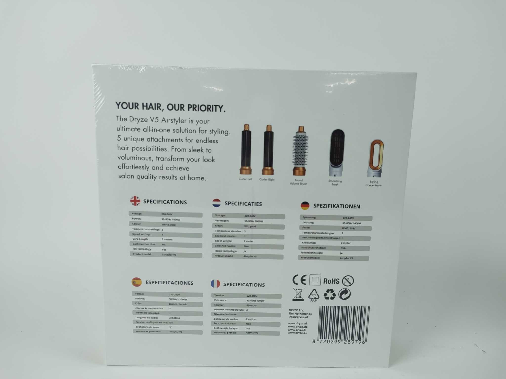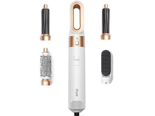 Dryze Airstyler 5-in-1 - Wit. Deze multifunctionele Dryze 5‑in‑1 airstyler combineert föhnen, steilen, krullen en volume met één apparaat. Dankzij keramische coating, ionentechnologie en vijf hitte‑opzetstukken creëer je moeiteloos diverse kapsels zonder hittebeschadiging. De temperatuurregelaar (50–150 °C) en snelle opwarmtijd (5 s) maken styling efficiënt en veilig voor alle haartypes. Onze airstyler wordt geleverd met brosseborstel, steilvinger, linker- en rechterkruller, en droogföhn‑mondstuk – ideaal voor salonresultaat thuis, met rijke glans en souplesse.