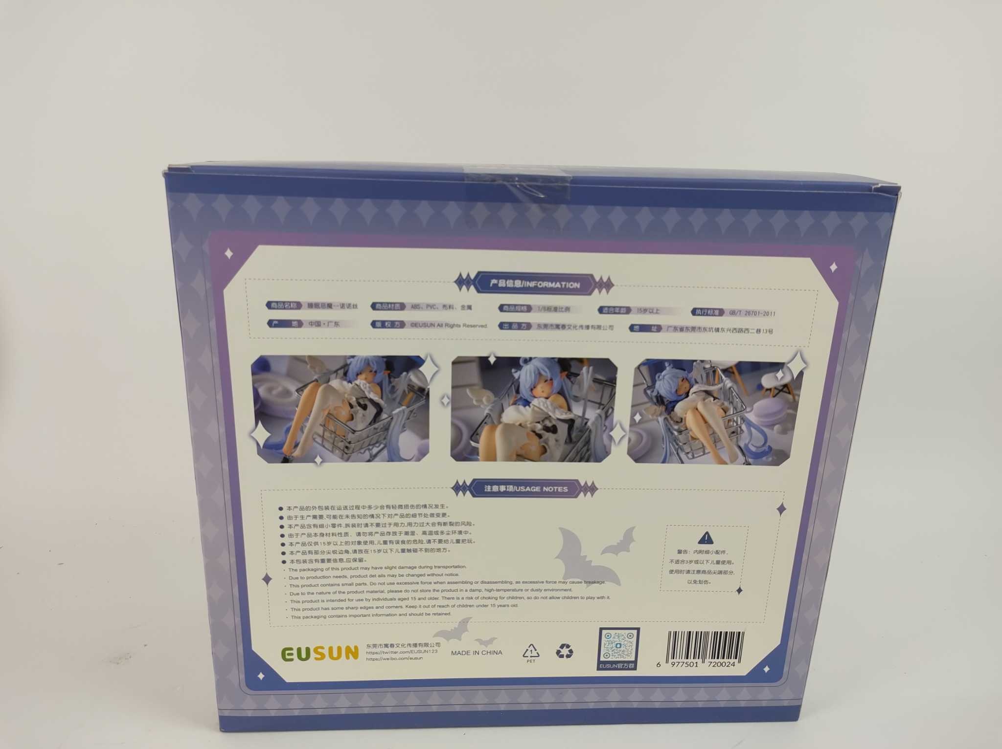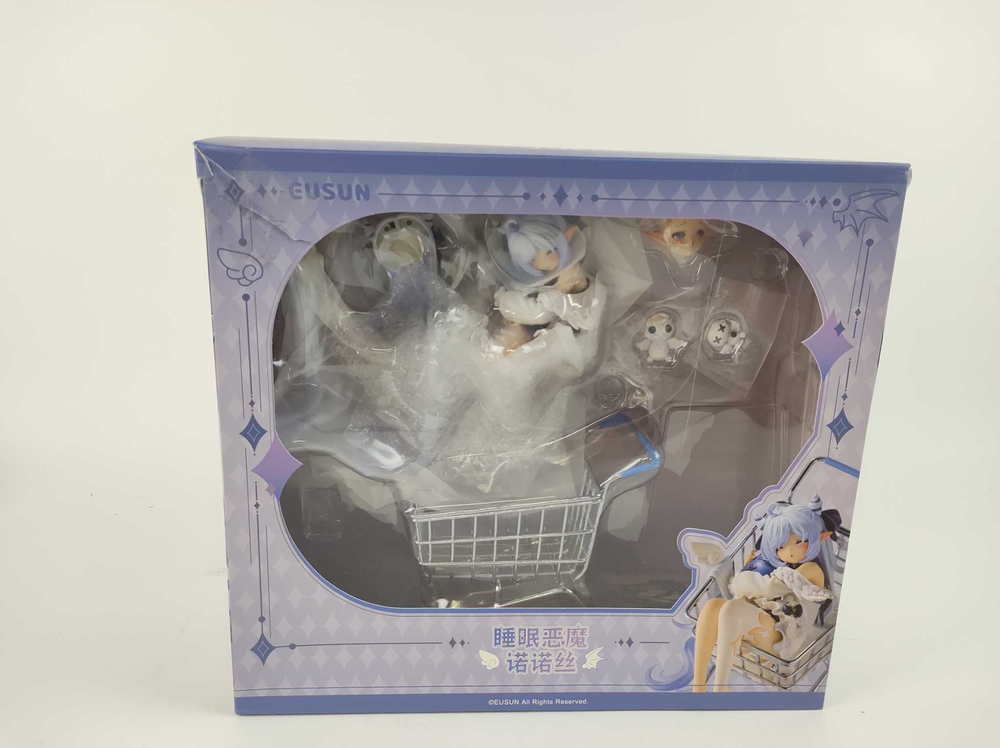 Eusun Anime Figuur Sleep Devil Nonos 1/6 - Deluxe Edition. De EUSUN Sleep Devil Nonos Deluxe Edition is een 1/6 schaalfiguur van circa 12 cm met fijne details in ABS en PVC. De Deluxe-set bevat een karretje waarin Nonos past en een schattige knuffel als e