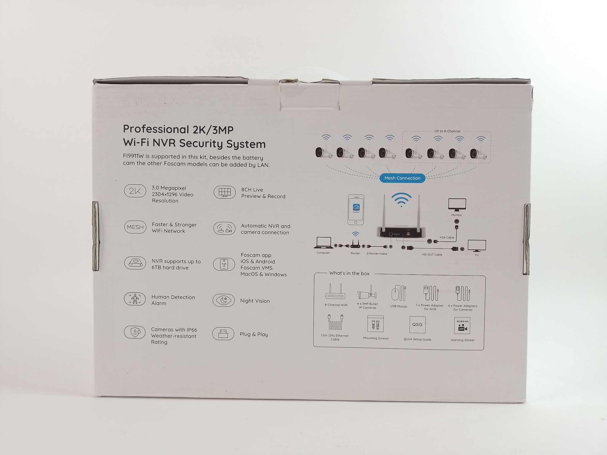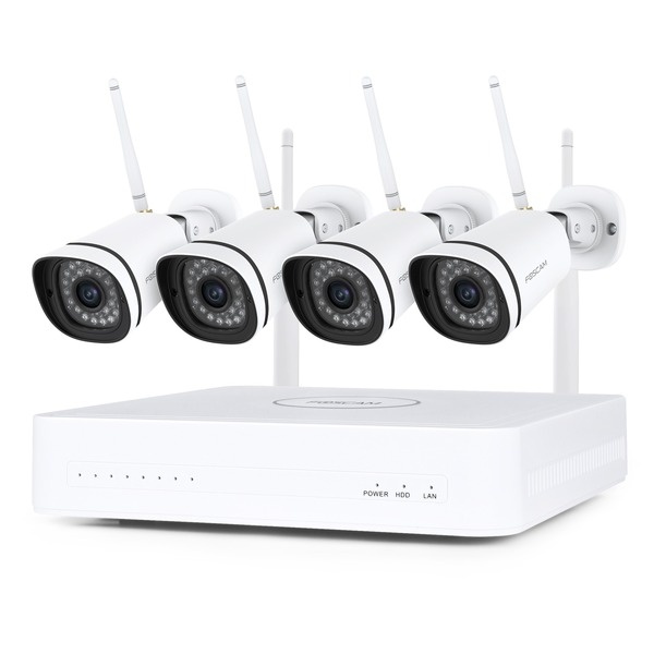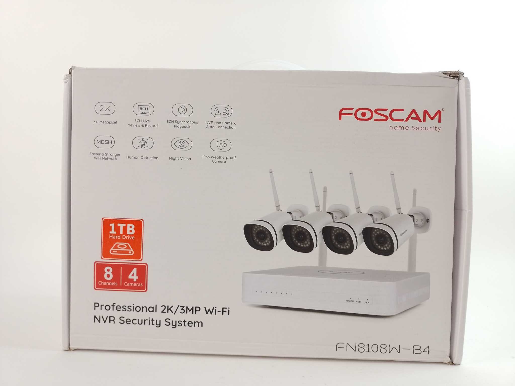 Foscam Beveiligingscamera Set - 4 Stuks - FN8108W-B4-1T Kit. De Foscam FN8108W-B4-1T is een complete 8-kanaals WiFi-beveiligingsset met vier 3MP-camera's en een NVR met 1TB opslag. Dankzij mesh-technologie bieden de camera's een stabiele verbinding tot 30