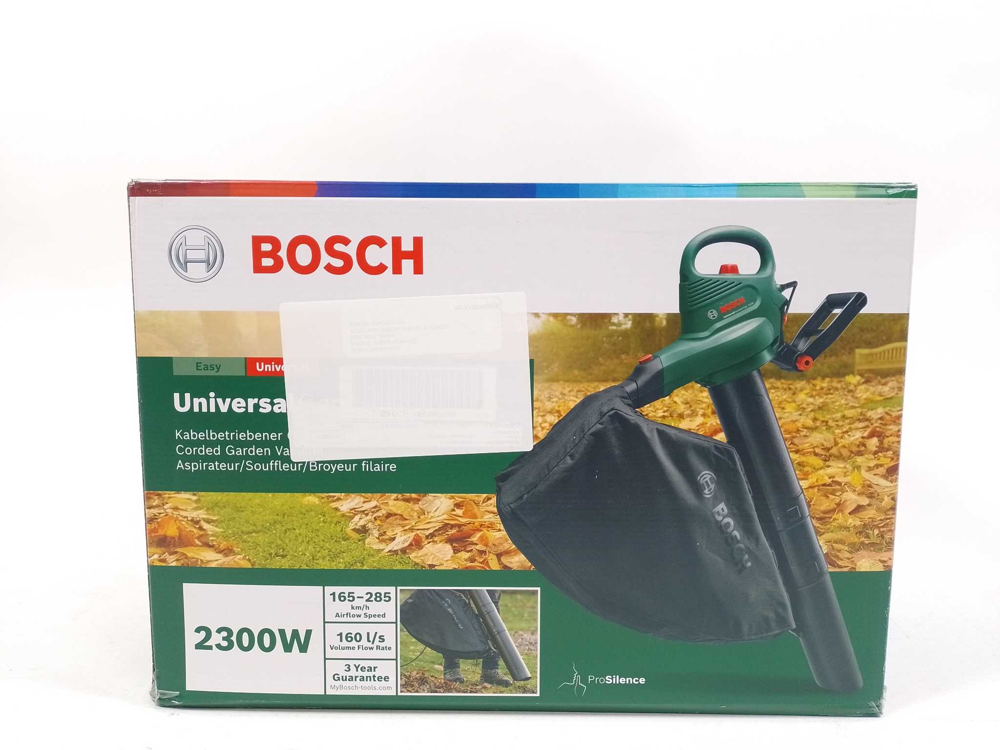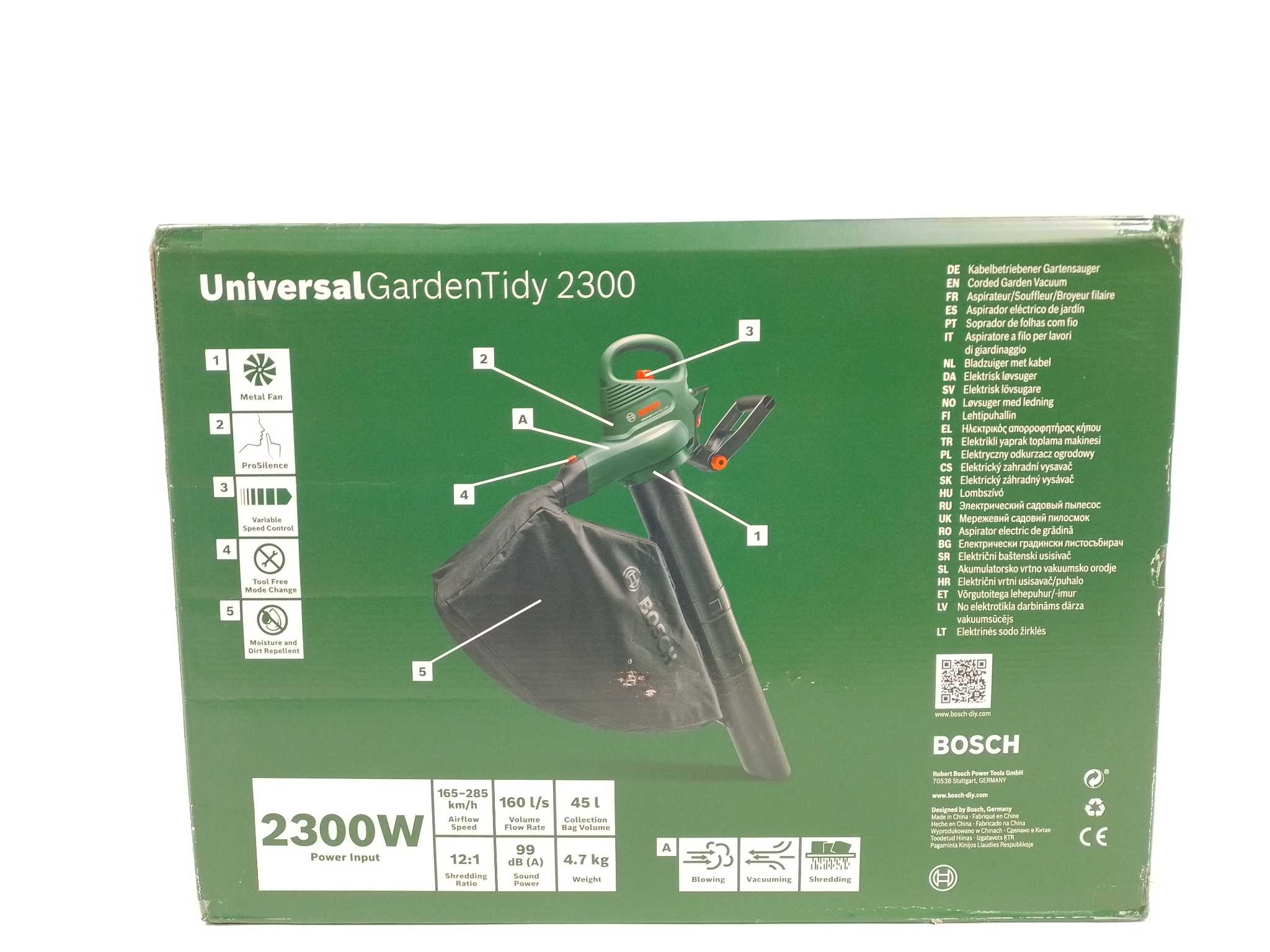 Bosch Bladblazer Universal Gardentidy 2300. De Bosch UniversalGardenTidy 2300 Bladblazer is een krachtige 2300 W bladblazer met een hoge luchtstroomsnelheid van 300 km/u, ideaal voor het opruimen van bladeren en tuinafval. Het lichte ontwerp en de ergonomische handgreep zorgen voor extra comfort. Met een snoerlengte van 12 meter kun je grote oppervlakken efficiënt en snel schoonmaken. Elektrische Bladblazer. Vermogen 2300 W. Zuigcapaciteit: 9,6 m³/min. Maximale luchtsnelheid: 285 km/h. Met opvangzak. Gewicht: 4,7 kg.