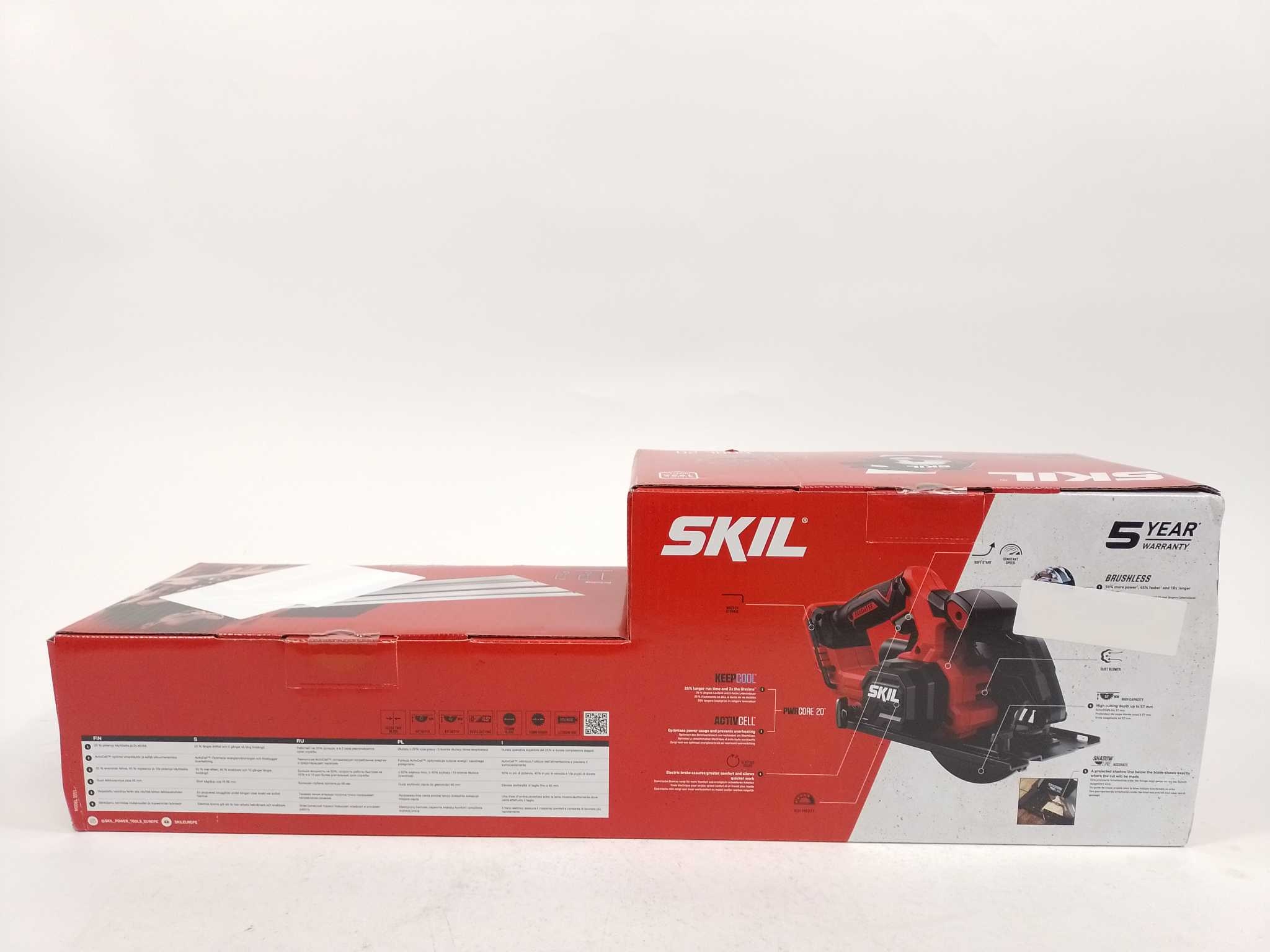 Skil Cirkelzaag 3551CB - met Geleiderails. Zaag strak en snel met de SKIL 20V borstelloze accucirkelzaag 3551CB. De digitale brushless motor levert meer vermogen en gaat langer mee. Met 57 mm zaagdiepte bij 90° en 41 mm bij 45° is hij ideaal voor plaatmat