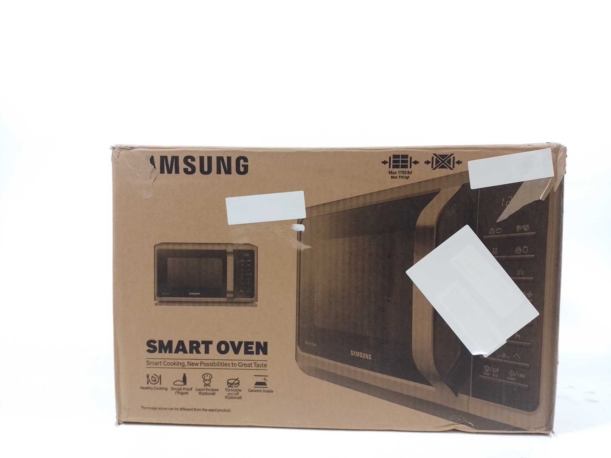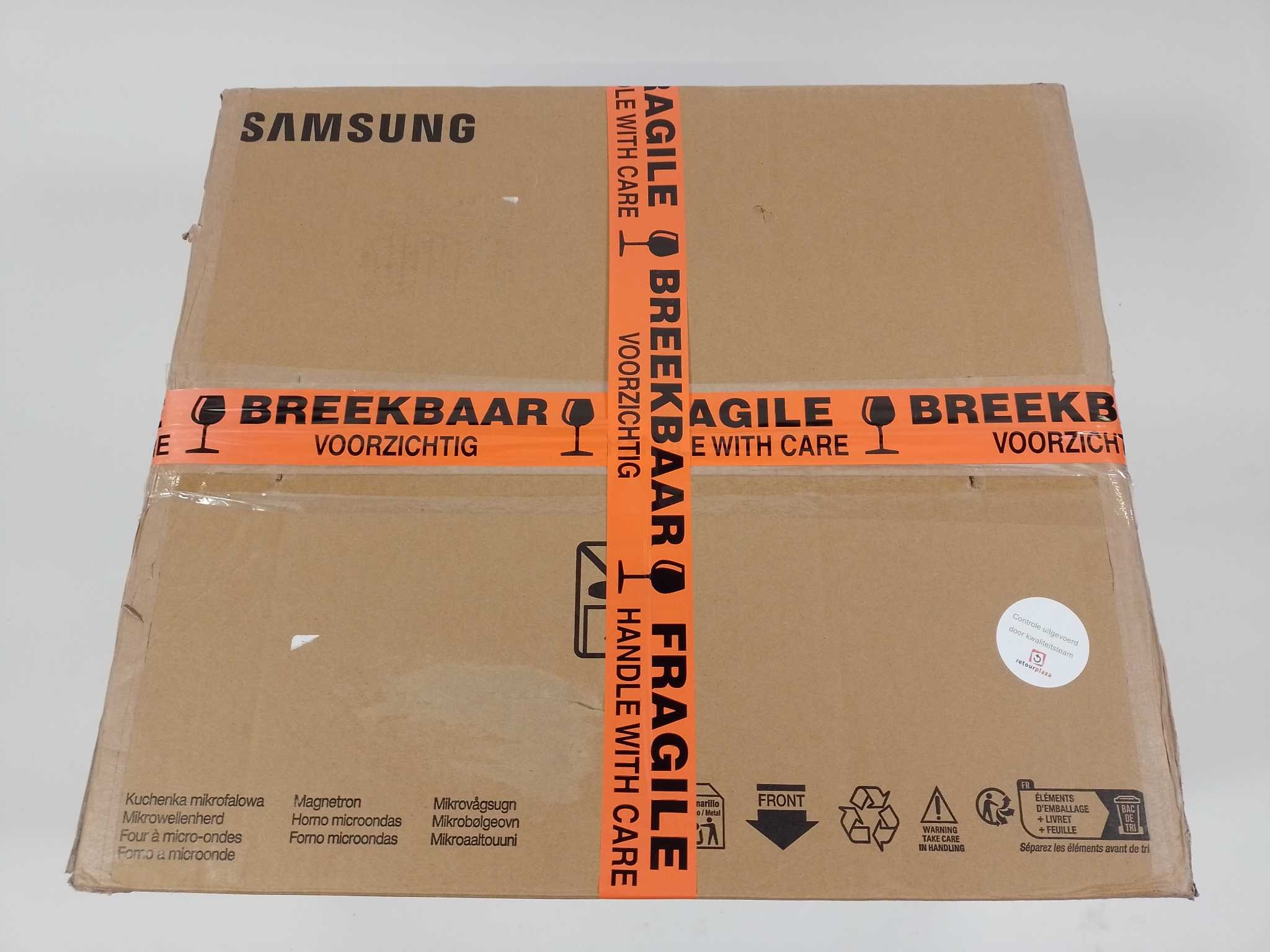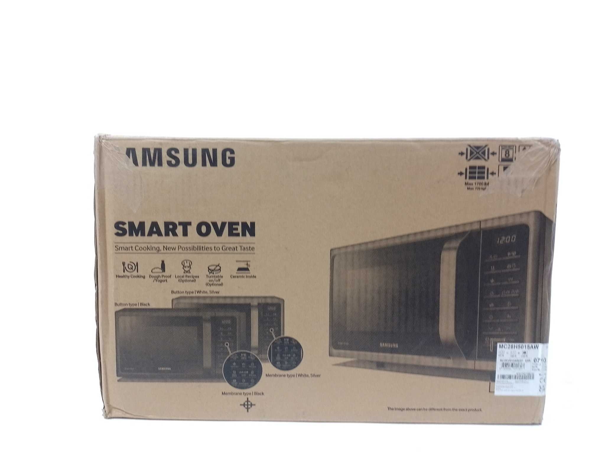 Samsung Combimagnetron Vrijstaand - MC28H5015AW. De Samsung MC28H5015AW is een veelzijdige combimagnetron met een inhoud van 28 liter, ideaal voor bakken, grillen en heteluchtkoken. Met 15 automatische programma's, een gistfunctie voor yoghurt en deeg, en een uitschakelbaar draaiplateau biedt deze magnetron flexibiliteit voor diverse gerechten. De geurverwijderingsfunctie houdt de oven fris, terwijl de kinderbeveiliging zorgt voor veilig gebruik. Met een vermogen van 900W (magnetron) en 1500W (grill) is dit een krachtige en praktische toevoeging aan elke keuken. Kastontwerp: Aanrechtblad. Inhoud (binnenkant): 28 L. Magnetronvermogen: 900 W. Netbelasting: 1400 W. Breedte: 517 mm. Diepte: 474,8 mm. Hoogte: 310 mm. Gewicht: 17,5 kg.