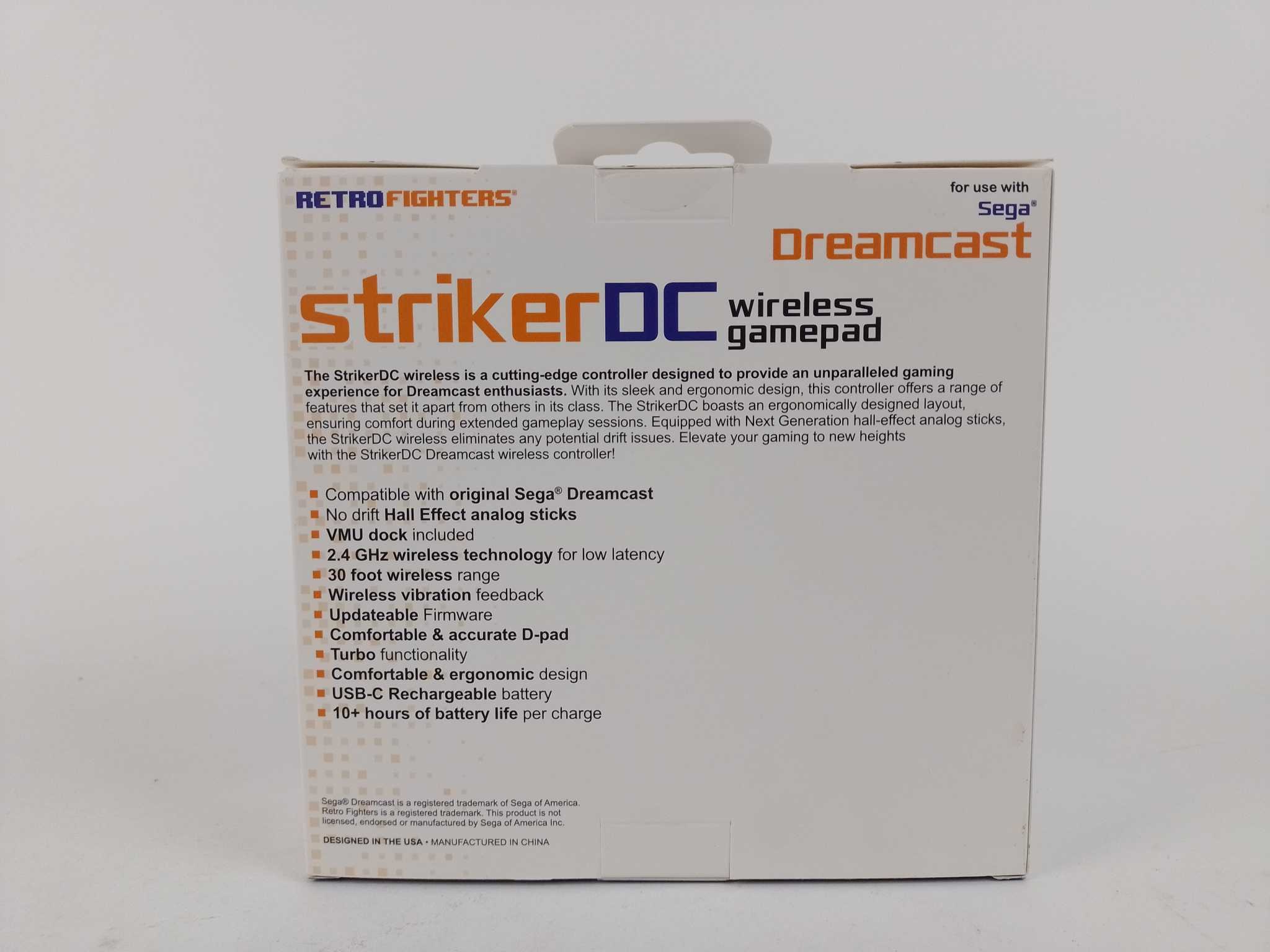 Retro Fighters Controller voor Dreamcast - Wit. De Retro Fighters Striker DC draadloze controller voor Sega Dreamcast geeft je moderne comfort bij klassiek gamen. Via 2,4 GHz speel je met lage vertraging tot 9 meter afstand. Hall-effect analoge sticks voorkomen drift en de ergonomische vorm met nauwkeurige D-pad ligt stevig in de hand. Geniet van draadloze trilfunctie, turbo-stand en updatebare firmware. Opladen gaat eenvoudig via USB-C en één lading houdt meer dan 10 uur. Inclusief VMU draadloze dongle. Perfect voor shooters, fighters en platformers, thuis of onderweg.
