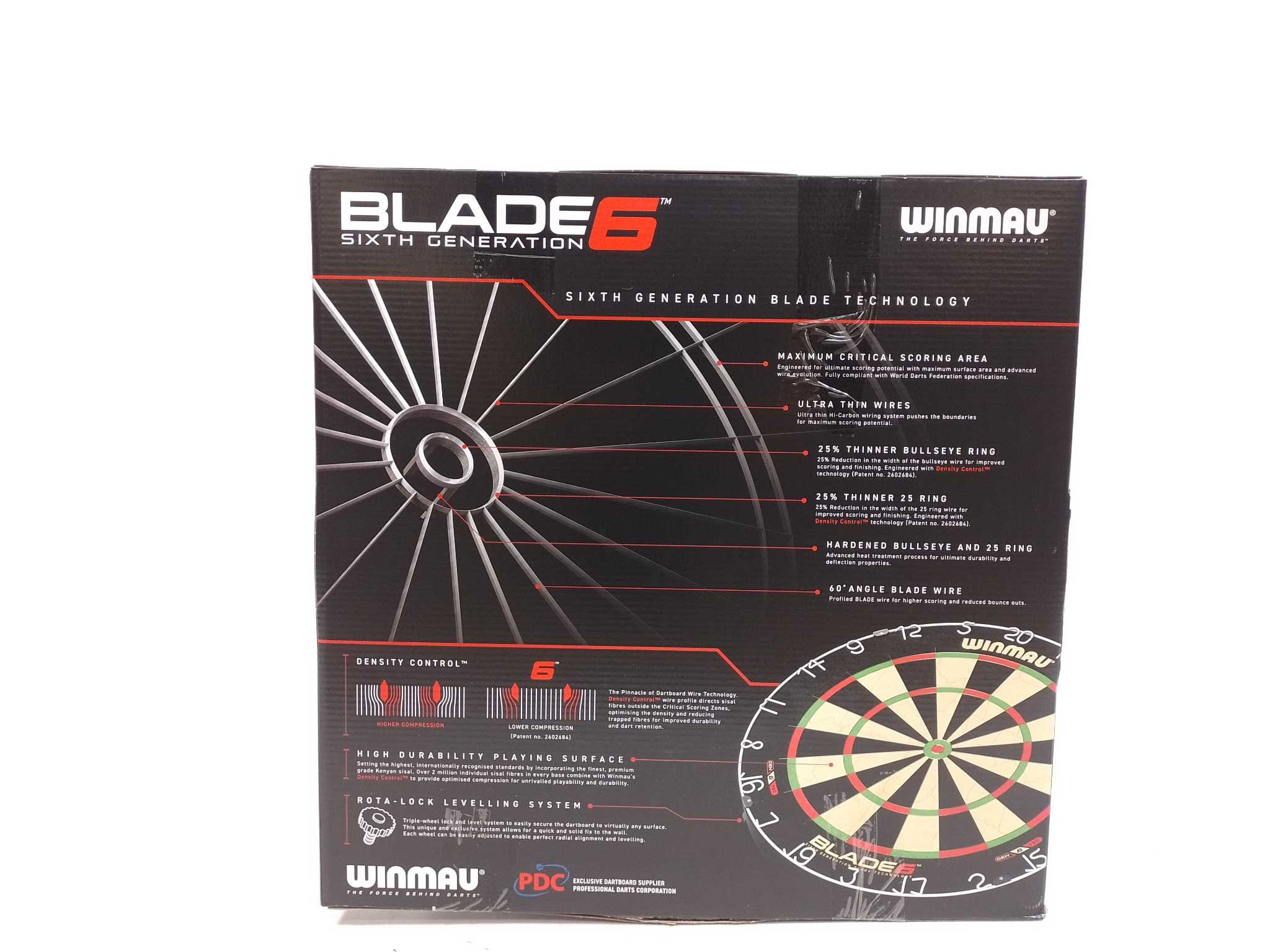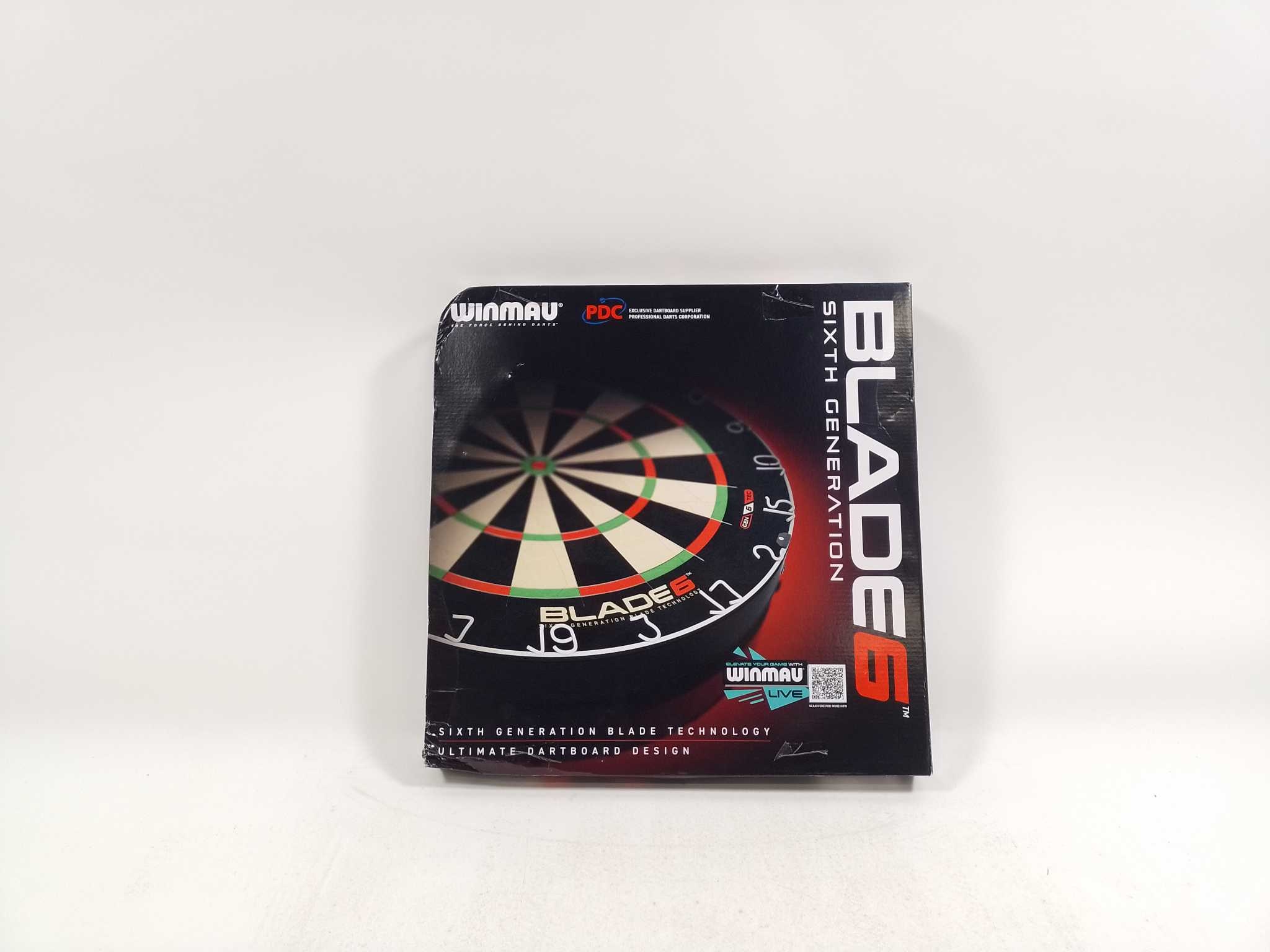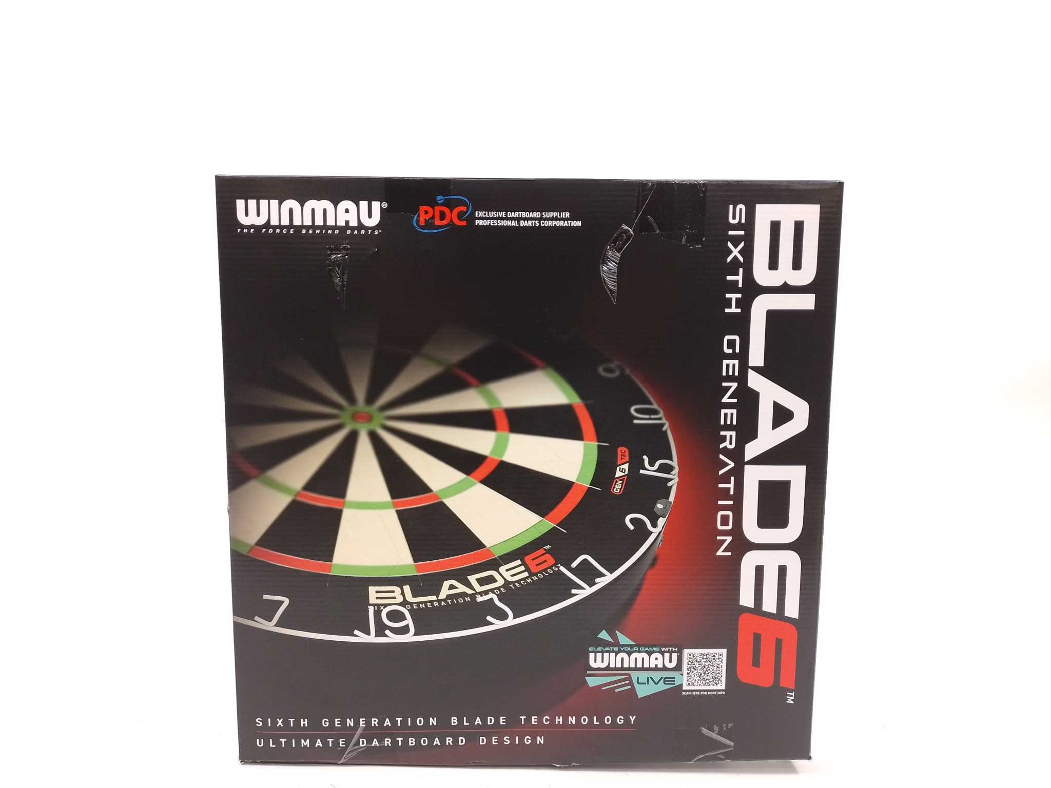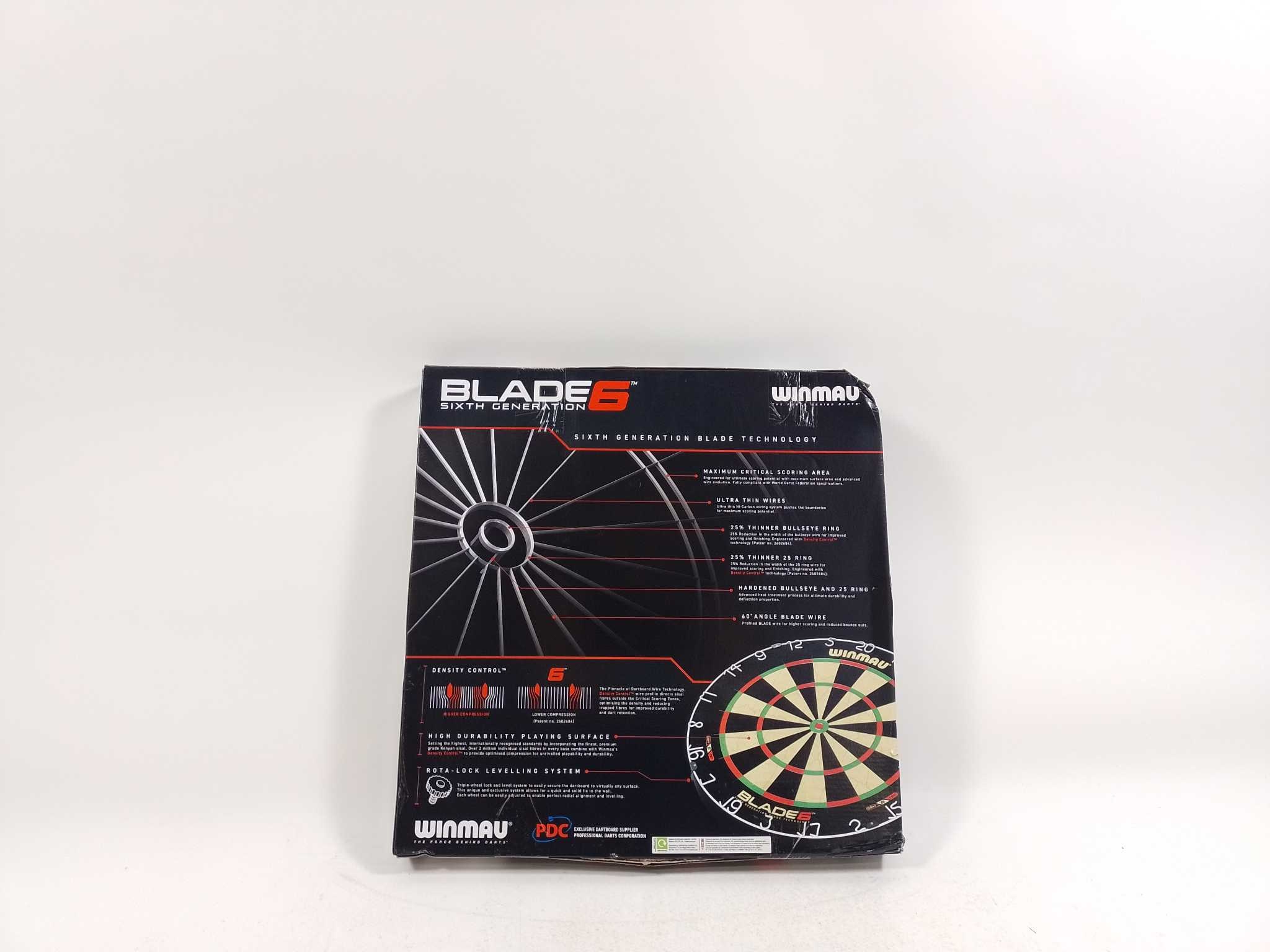 Winmau Dartbord Blade 6. De Winmau Blade 6 is een professioneel sisal dartbord voor intensief gebruik. Zesde generatie Blade-technologie, ultradunne 60° bedrading en Density Control™ vergroten scoringsoppervlak en dartretentie. Gemaakt van premium Oost-Af