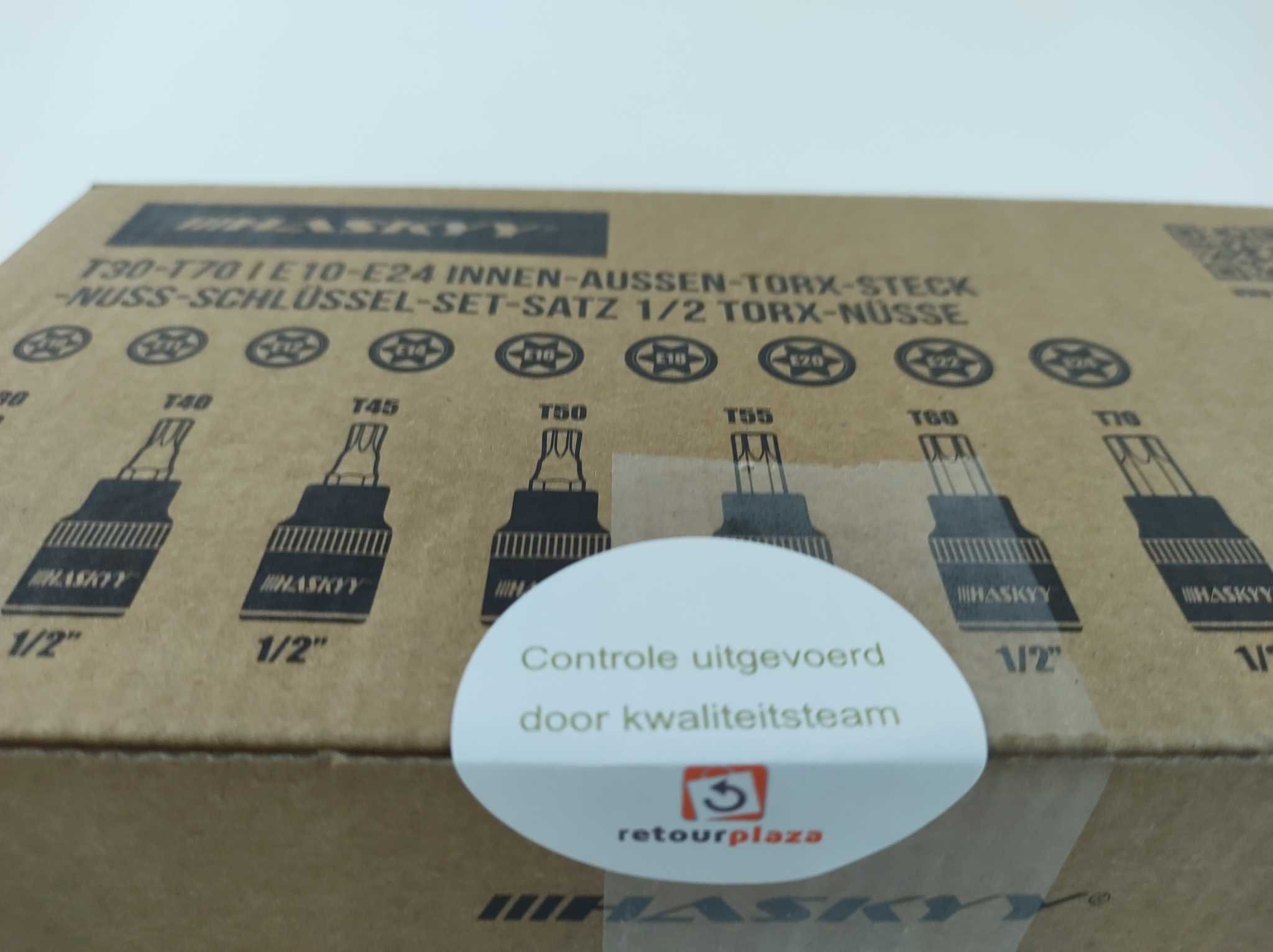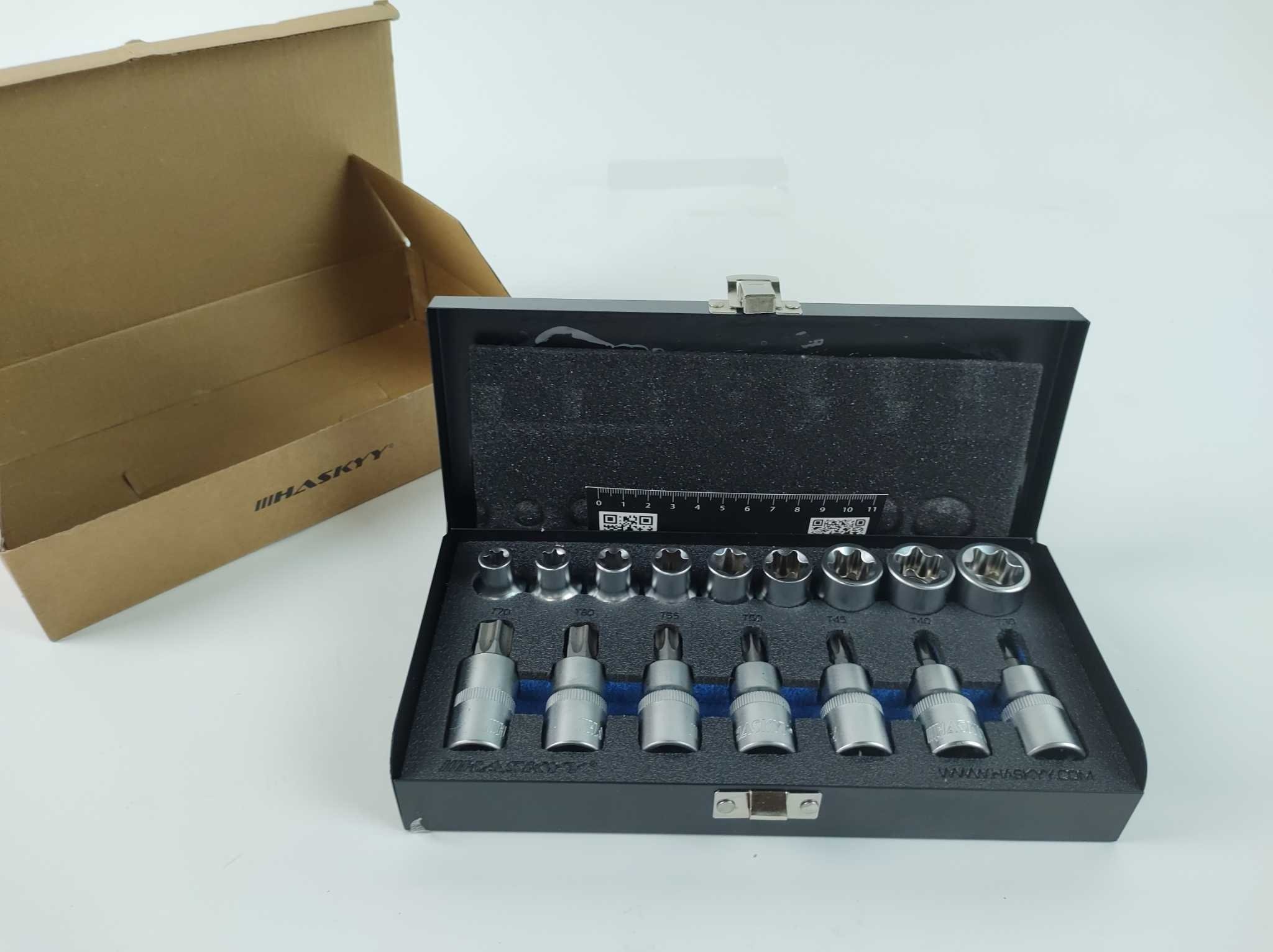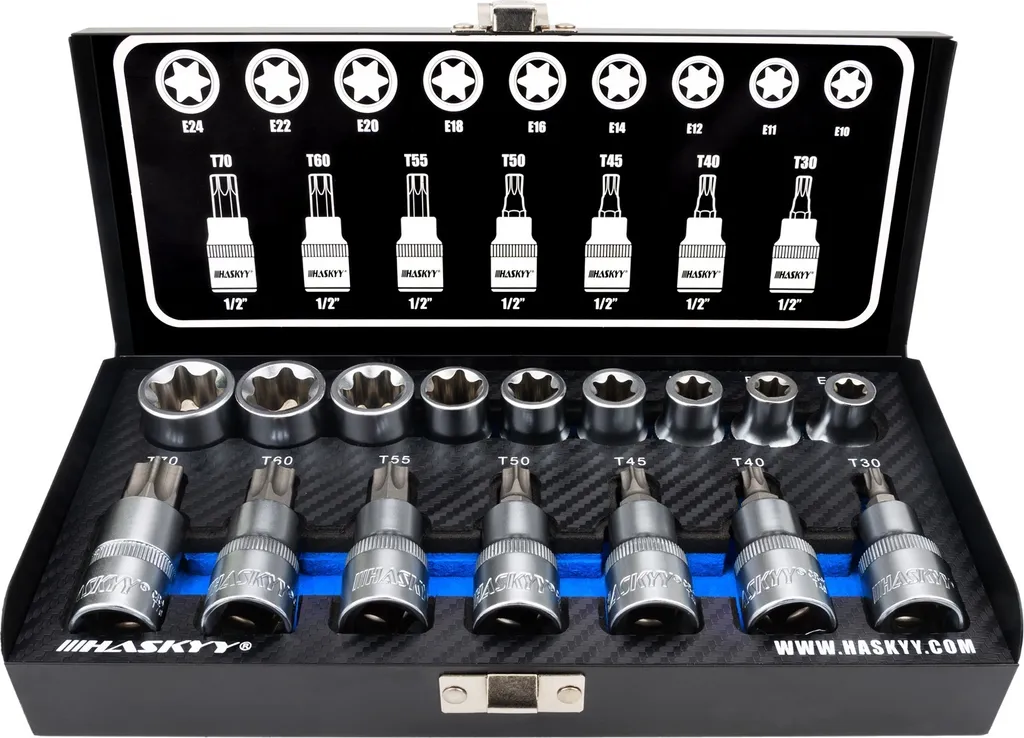HASKYY Doppenset Torx - 16-delig. De Haskyy 16-delige Torx doppenset 1/2 inch is een robuuste keuze voor auto, motor en werkplaats. Deze set bevat zowel binnen-Torx bits T30 tot T70 als buiten-Torx doppen E10 tot E24, ideaal voor uiteenlopende montage- en