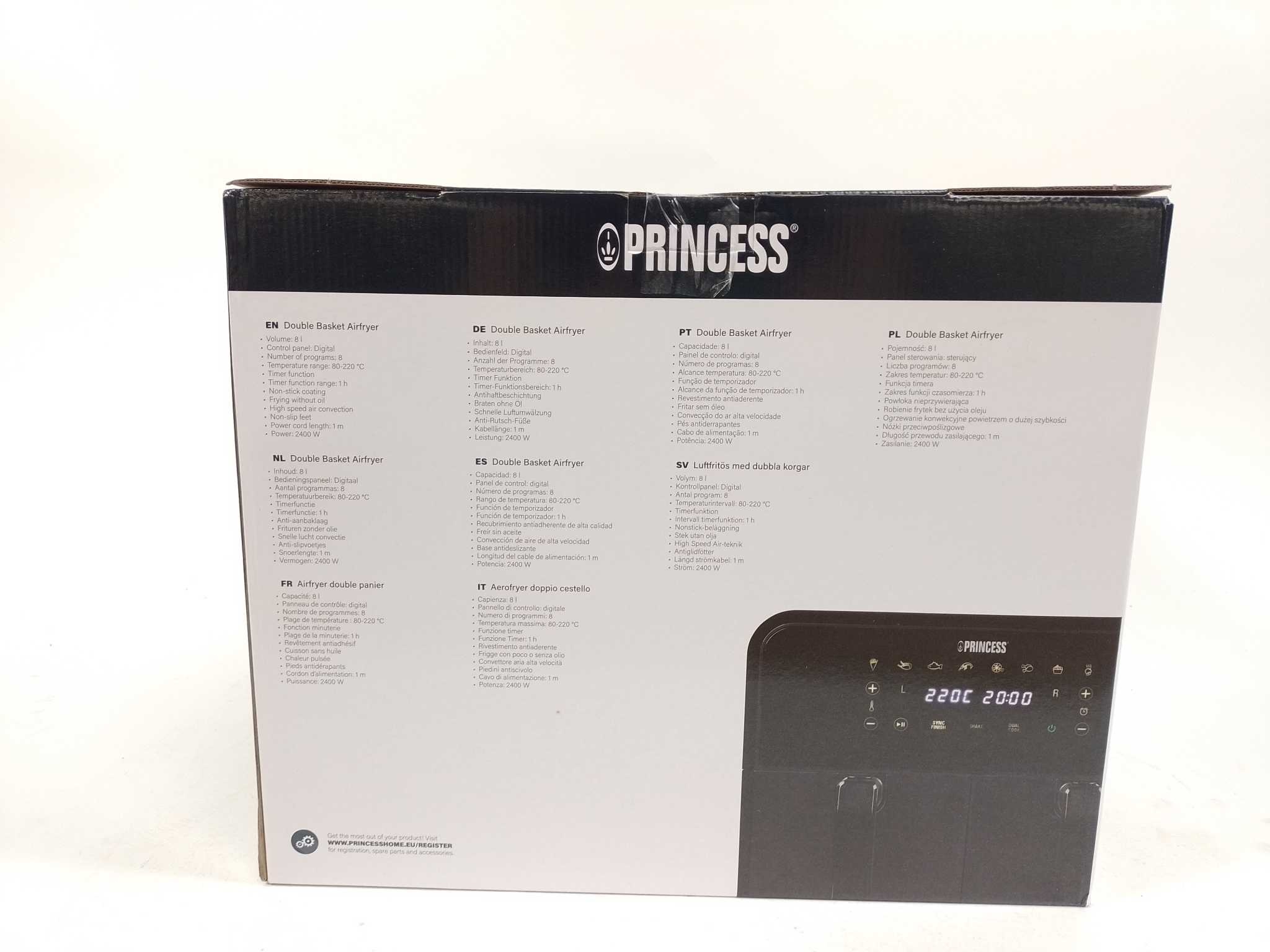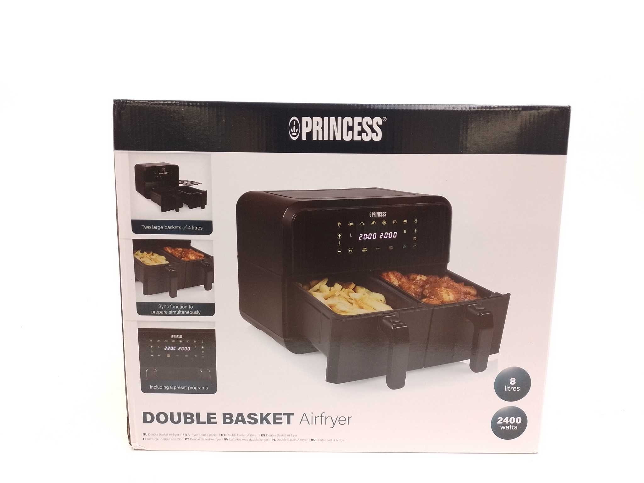 Princess Double Basket Airfryer - 182068. Bereid complete maaltijden in één keer met de Princess Double Basket airfryer. Deze dubbele heteluchtfriteuse heeft twee manden van 4 liter (totaal 8 liter) zodat je friet en groente tegelijk maakt, zonder smaakoverdracht. Met 2400 watt, 8 automatische programma’s, instelbare temperatuur tot 220 °C en een handige sync-functie is alles gelijktijdig klaar. Het touchscreen met timer is eenvoudig. Antiaanbak en vaatwasserbestendige onderdelen maken schoonmaken snel. Inclusief linkermand, rechtermand, roosterplaten en handleiding. Ideaal voor gezinnen en snelle snacks met minder vet.