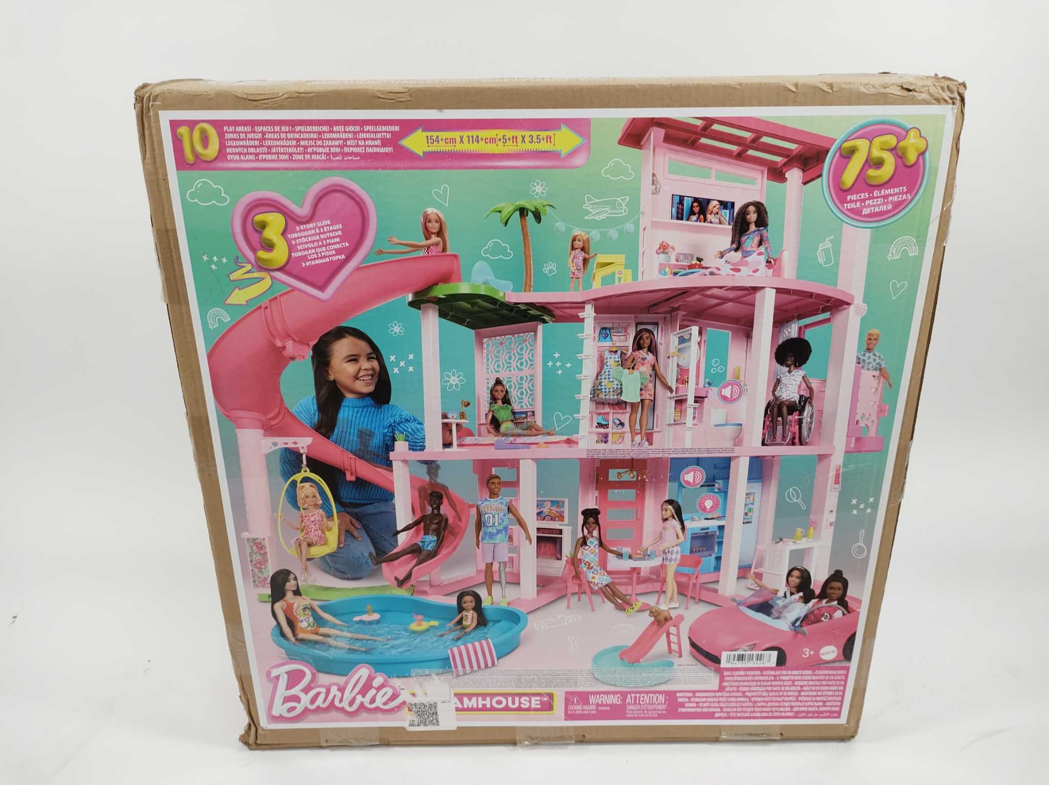 Barbie Droomhuis Speelset Pool Party - 114 cm. Barbie Droomhuis Pool Party (HMX10) maakt fantasierijk spelen groots. Het 114 cm hoge huis biedt 3 verdiepingen, 10 leefruimtes en de hoogste spiraalglijbaan naar het zwembad. Met rolstoeltoegankelijke lift, balkon en logeertransformatie slaapt het huis tot vier poppen. Inclusief 75+ accessoires zoals meubels, kook- en badkameritems, decor en puppy-speelsets; licht- en geluidseffecten zorgen voor extra beleving (3× AA, niet inbegrepen). Perfect als centerpiece voor Barbie-fans vanaf 3 jaar; 360° speelplezier, stevig en eenvoudig te monteren. Inclusief zwembad, glijbaan en puppy-lift.