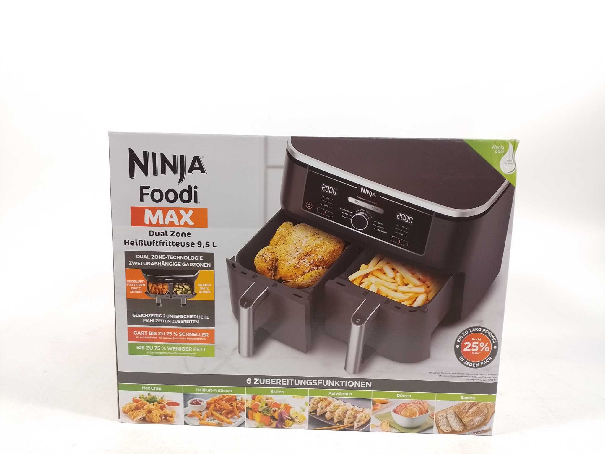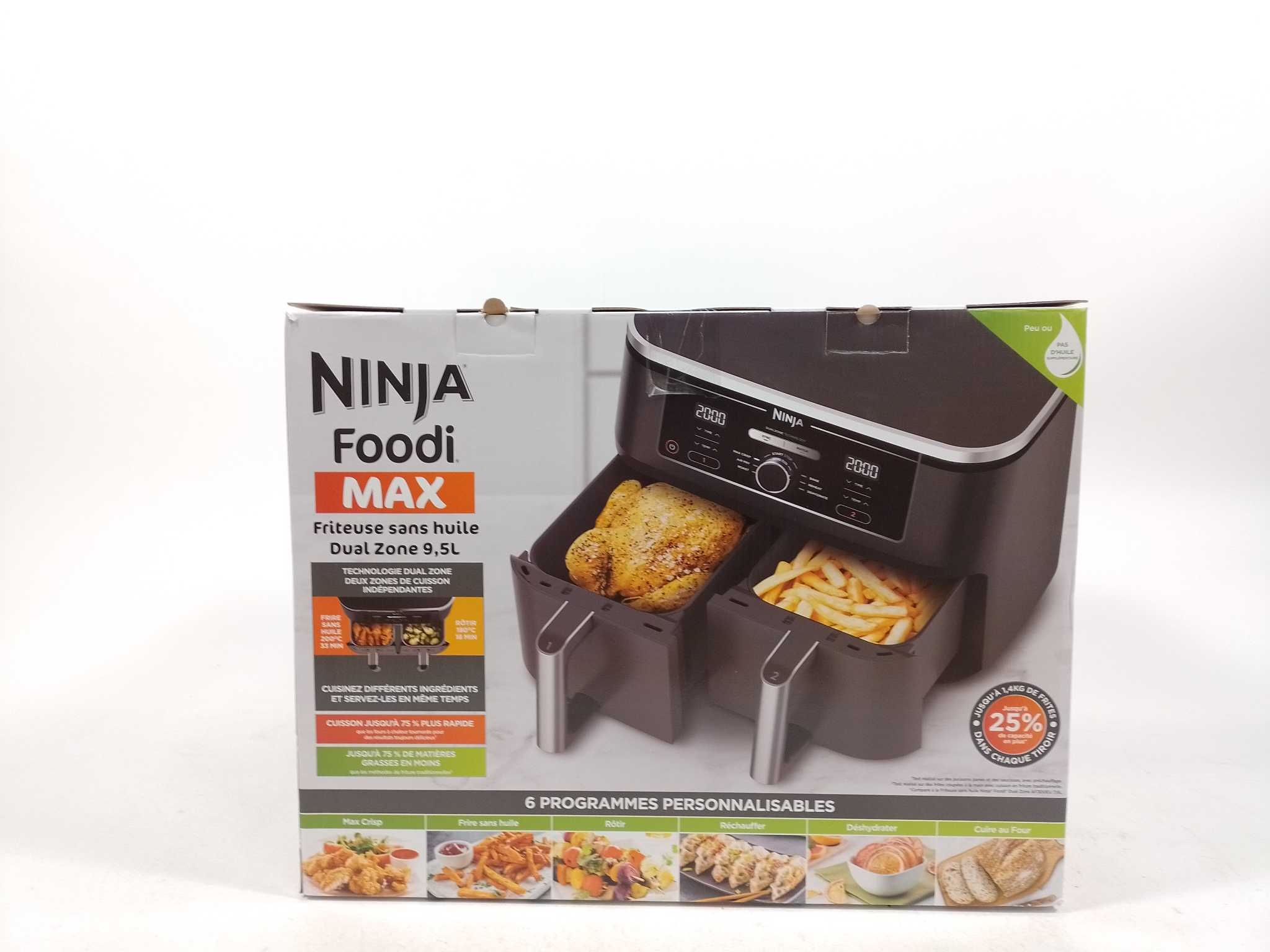 Ninja Dubbele Airfryer XXL Foodi MAX AF400EU. De Ninja Foodi AF400EU Dubbele Airfryer XXL heeft twee kookvakken van elk 4,75 liter, samen 9,5 liter. Met Dual Zone Technologie kun je twee gerechten tegelijk bereiden met verschillende temperaturen en kooktijden. De airfryer heeft zes kookfuncties: airfryen, Max Crisp, grillen, bakken, opwarmen en drogen. Het apparaat is tot 75% sneller dan traditionele ovens en gebruikt tot 75% minder vet dan traditionele frituurmethoden. Ideaal voor grote gezinnen of groepskoken. Maximale temperatuur: 240 °C. Aantal programma's: 6. Vermogen: 2470 Watt. Bodem met antislip: Ja. Kleur: Zwart. Cool touch handgreep: Ja. Cool wall: Ja. Automatisch kookprogramma: Ja. Automatische uitschakeling: Ja.