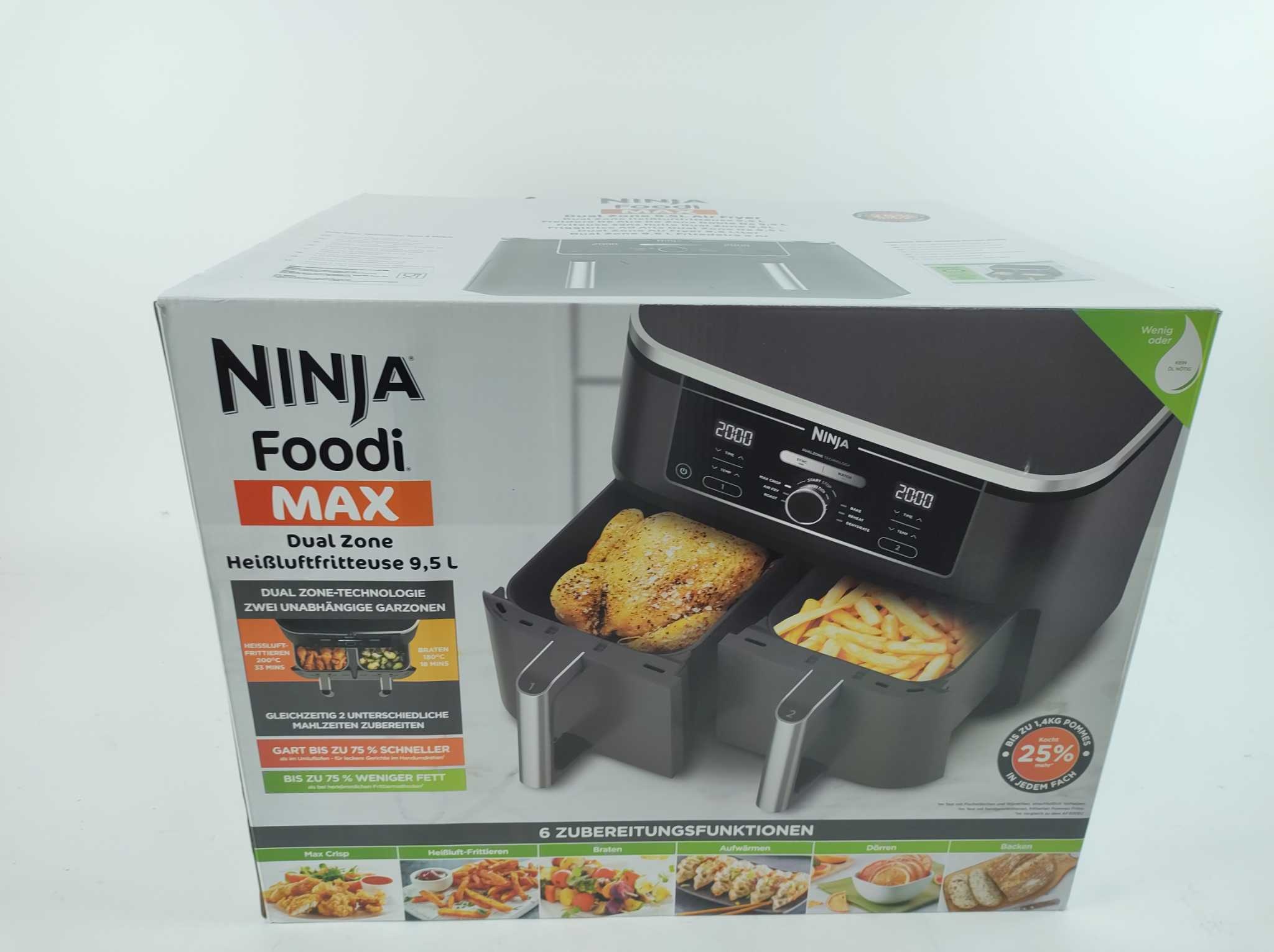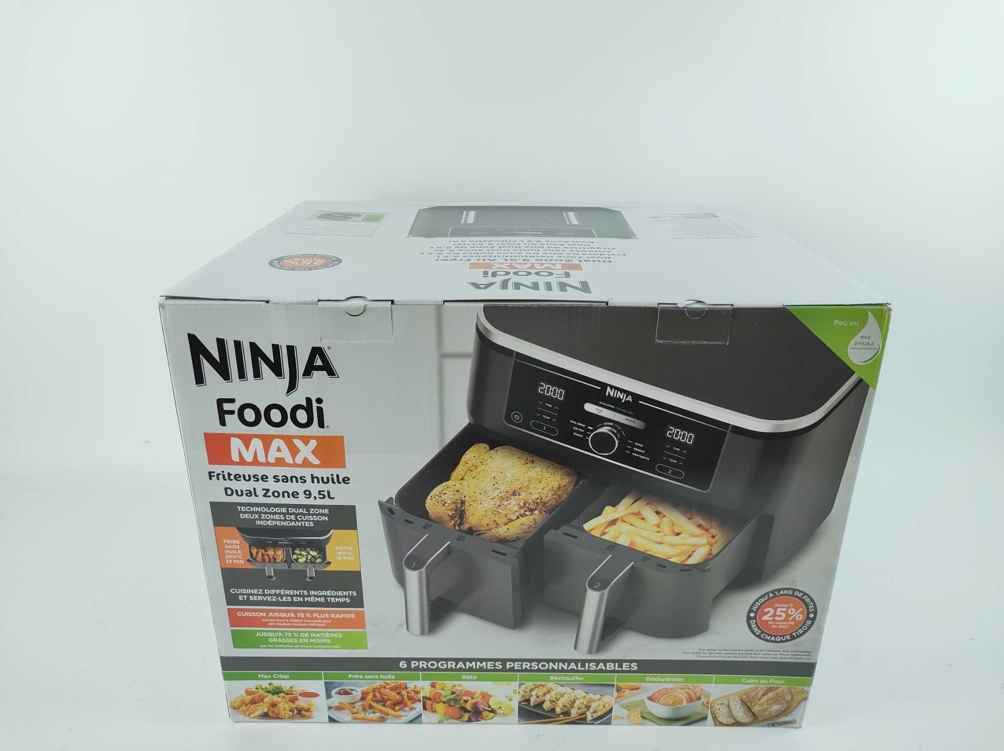 Ninja Dubbele Airfryer XXL Foodi MAX AF400EU. De Ninja Foodi AF400EU Dubbele Airfryer XXL heeft twee kookvakken van elk 4,75 liter, samen 9,5 liter. Met Dual Zone Technologie kun je twee gerechten tegelijk bereiden met verschillende temperaturen en kooktijden. De airfryer heeft zes kookfuncties: airfryen, Max Crisp, grillen, bakken, opwarmen en drogen. Het apparaat is tot 75% sneller dan traditionele ovens en gebruikt tot 75% minder vet dan traditionele frituurmethoden. Ideaal voor grote gezinnen of groepskoken. Maximale temperatuur: 240 °C. Aantal programma's: 6. Vermogen: 2470 Watt. Bodem met antislip: Ja. Kleur: Zwart. Cool touch handgreep: Ja. Cool wall: Ja. Automatisch kookprogramma: Ja. Automatische uitschakeling: Ja.