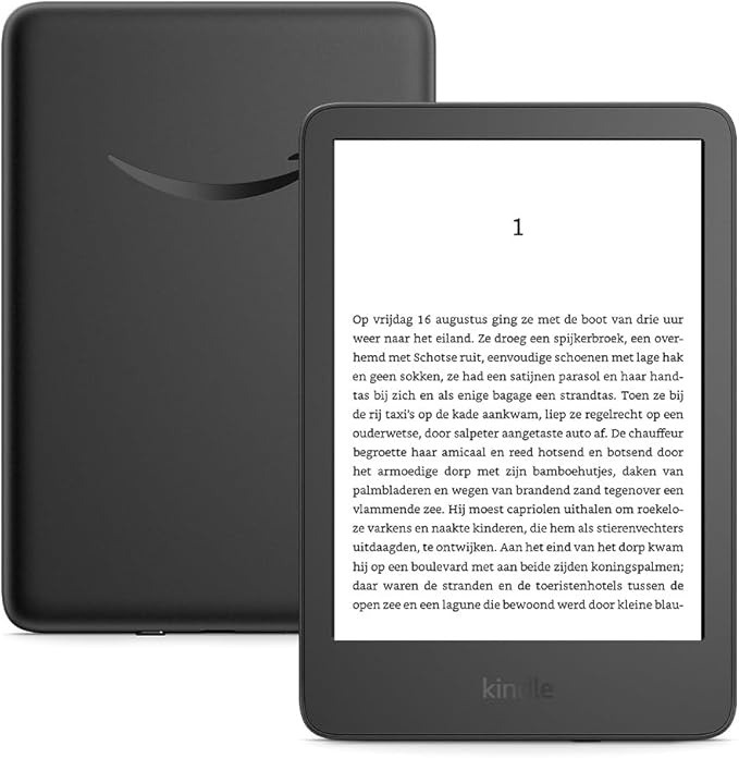 Amazon E-Reader Kindle - 6 Inch - 16GB - Zwart. De nieuwste Amazon Kindle (16GB) is licht en compact met een 6-inch 300 ppi scherm dat papierachtig en spiegelvrij leest. Snellere paginawissels, verstelbare frontlight en weken accuduur zorgen voor ultiem leescomfort, binnen en buiten. Met Wi-Fi, USB-C laden en Bluetooth voor Audible-luisteren via koptelefoon. Ondersteunt o.a. EPUB, PDF en MOBI. Inclusief USB-C kabel en documentatie. Perfect voor reizen en dagelijks gebruik: honderden boeken, aanpasbare lettertypes, donkerstand en woordenboek binnen handbereik. Compacte behuizing, krasbestendig scherm en eenvoudige setup via app ondersteuning.