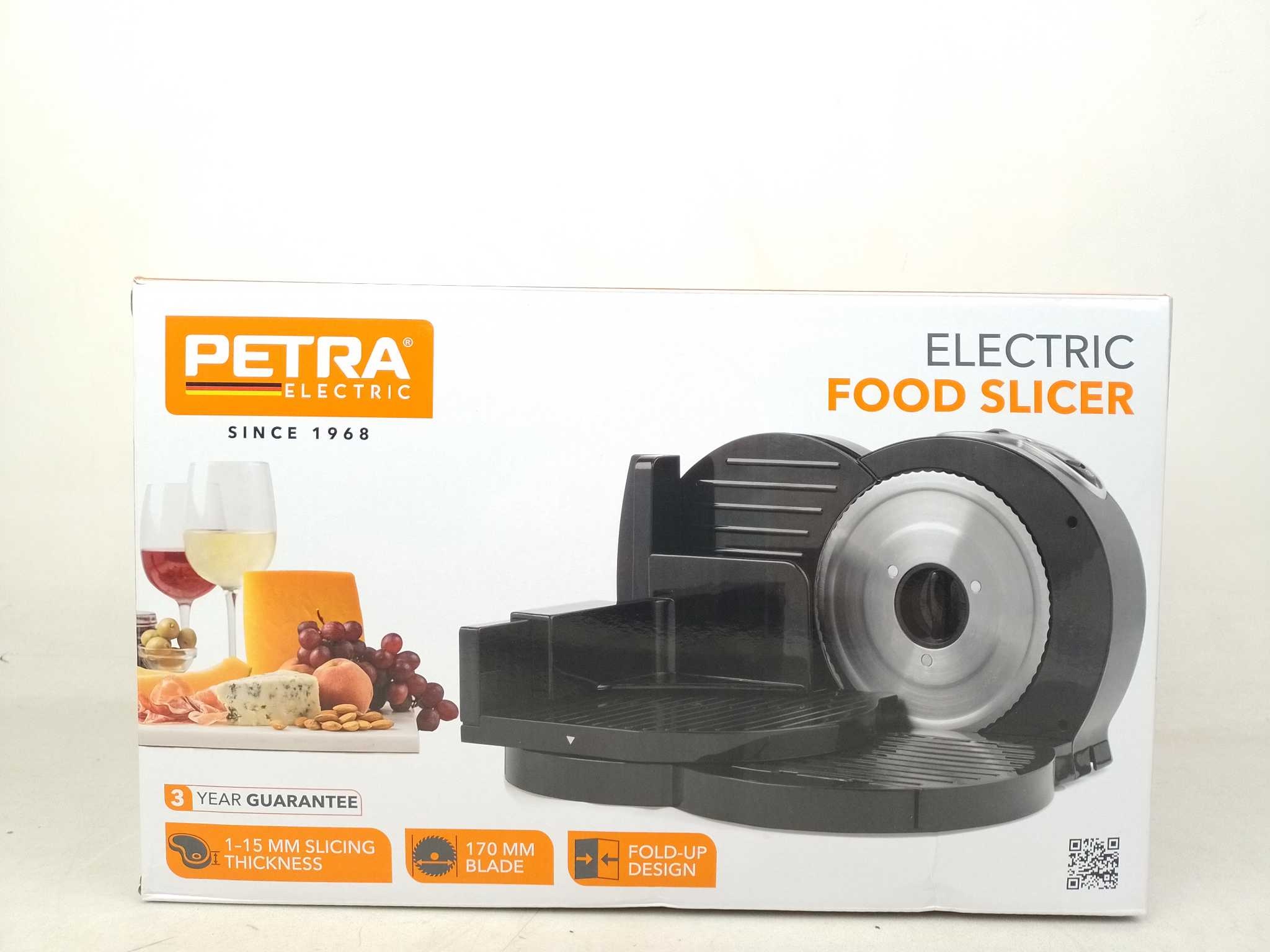 Petra Elektrische Snijmachine - PT3683VDEEU10. Met de Petra elektrische vleessnijmachine snijd je vleeswaren, kaas en brood in deli-kwaliteit. De 150W motor en het 170 mm roestvrijstalen mes leveren strakke plakken, terwijl je met de dikte-instelling van 1 tot 15 mm precies kiest. Drie snelheden zorgen voor controle bij zachte én stevige producten. De veiligheidsduimplaat/vingerbeschermer verhoogt veiligheid. Na gebruik klap je hem compact in. Inclusief vleessnijmachine en veiligheidsbeschermer. Perfect voor sandwiches, tapas en charcuterie; het gladde mes is eenvoudig te reinigen en staat stabiel op antislipvoetjes.