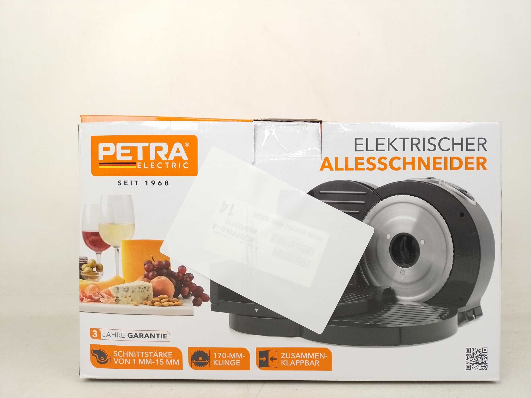 Petra Elektrische Snijmachine - PT3683VDEEU10. Met de Petra elektrische vleessnijmachine snijd je vleeswaren, kaas en brood in deli-kwaliteit. De 150W motor en het 170 mm roestvrijstalen mes leveren strakke plakken, terwijl je met de dikte-instelling van