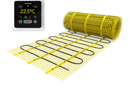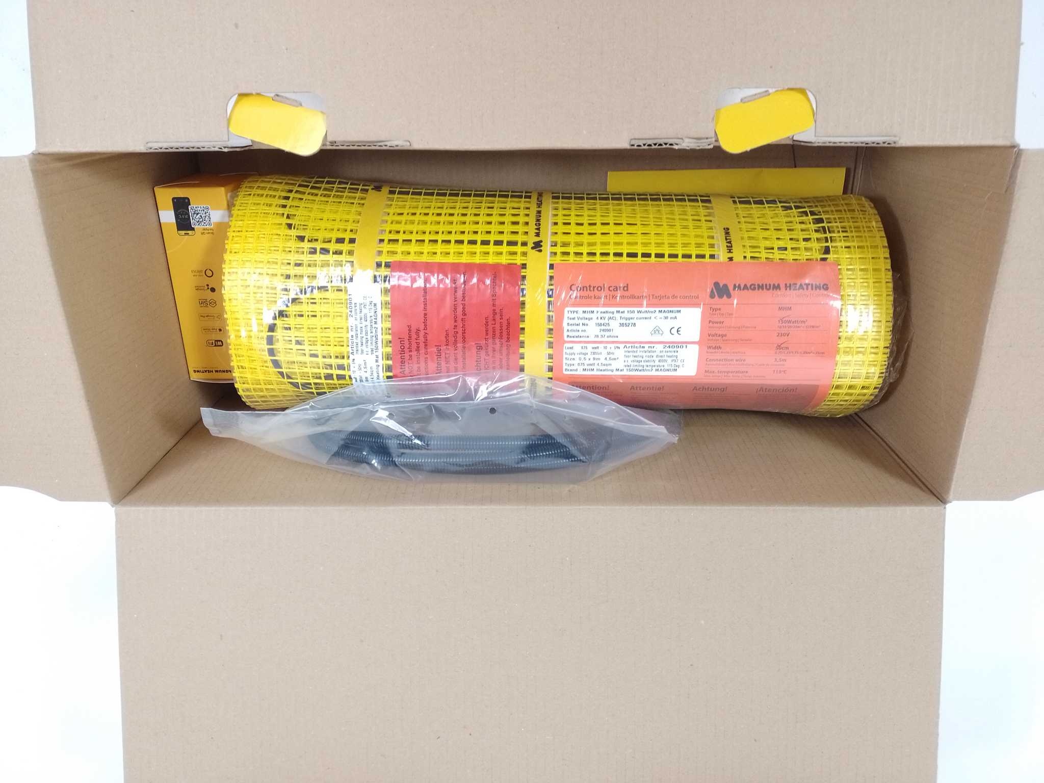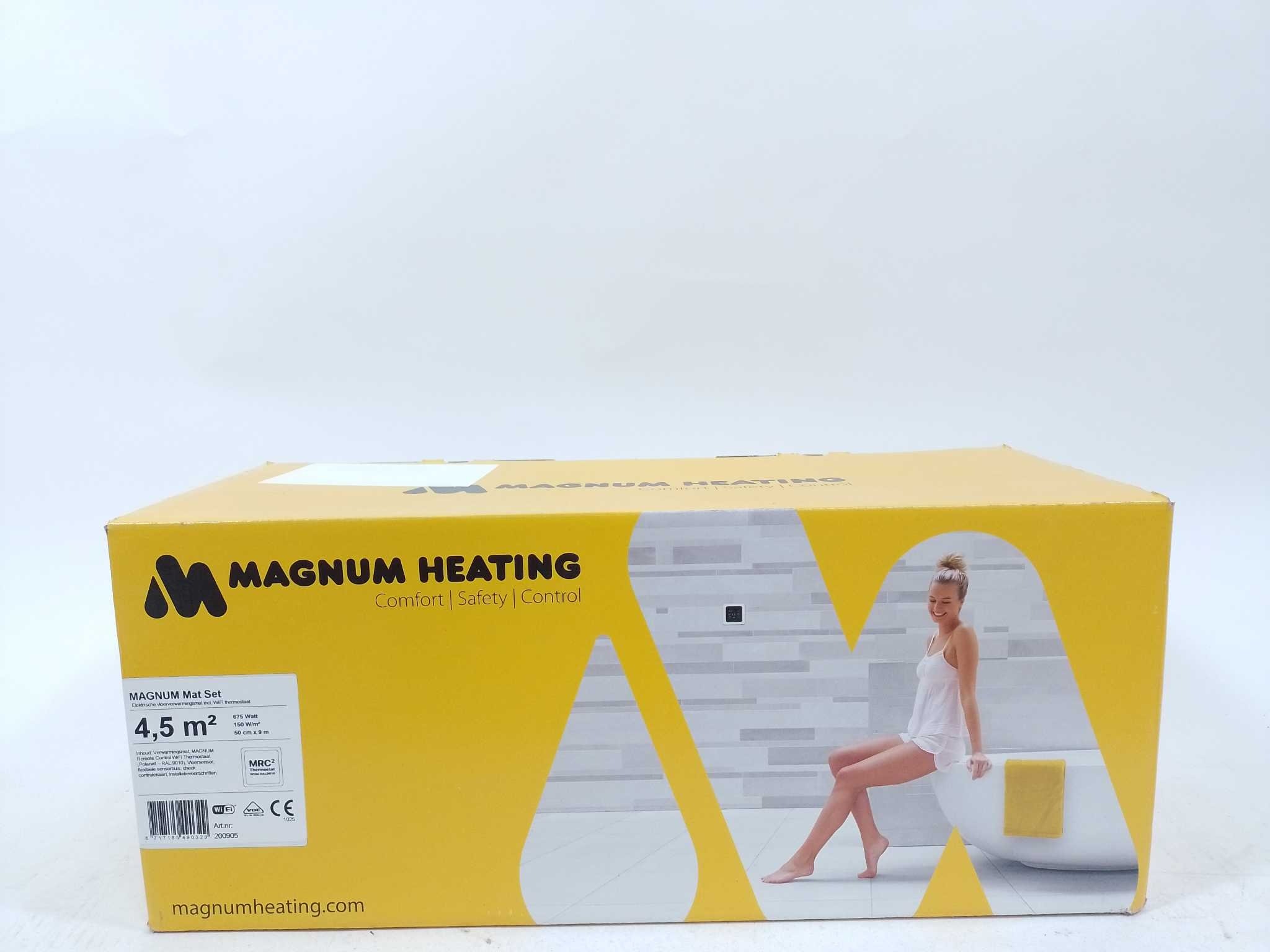 Magnum Elektrische Vloerverwarming Set - 4,5 m² - 675W - met MRC-thermostaat. De Magnum elektrische vloerverwarming set 4,5 m² biedt comfortabele, snelle en gelijkmatige bijverwarming voor badkamer, keuken of woonkamer. Deze 4 mm dunne verwarmingsmat van 675 watt is eenvoudig te verwerken onder tegels en geschikt voor vochtige ruimtes. Dankzij de duurzame, waterdichte opbouw en het vermogen van 150 W per m² geniet je van betrouwbare warmteprestaties. Inclusief witte WiFi thermostaat en vloertemperatuursensor, zodat je de temperatuur nauwkeurig en slim regelt voor extra comfort en efficiënt energieverbruik zonder gedoe.