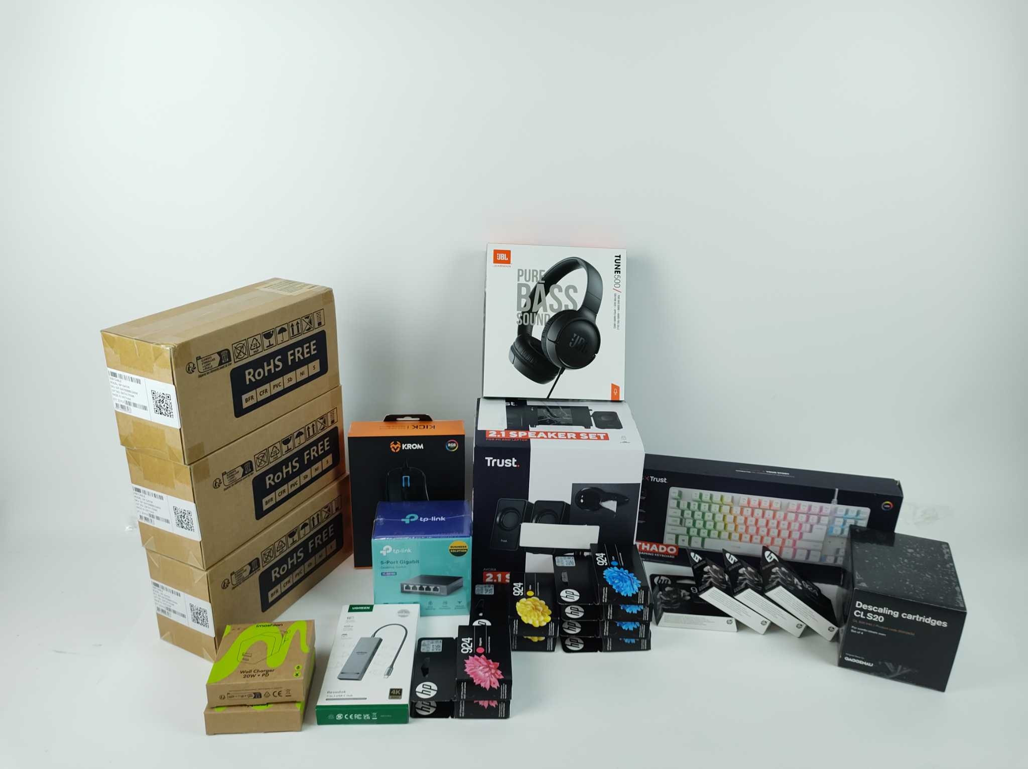 Voordeelbox Elektronica & Accessoires #2. Deze Elektronica voordeelbox bevat 24 artikelen (13 uniek) met o.a. UGREEN USB-C hub, TP-Link switch, JBL Tune500 koptelefoon, Trust gaming toetsenbord + muis, speakerset, Samsung USB-C kabels én 12 stuks HP 924 cartridges (zwart/cyaan/geel/rood). Ook inbegrepen: Gaggenau ontkalkingscartridges. Totale winkelwaarde ca. €551,98, maar bij retourplaza scoor je ’m extra scherp. Alles is gecontroleerd en direct leverbaar; ideaal voor Marktplaats/bol.com of je eigen webshop. Op=op—bestel nu!