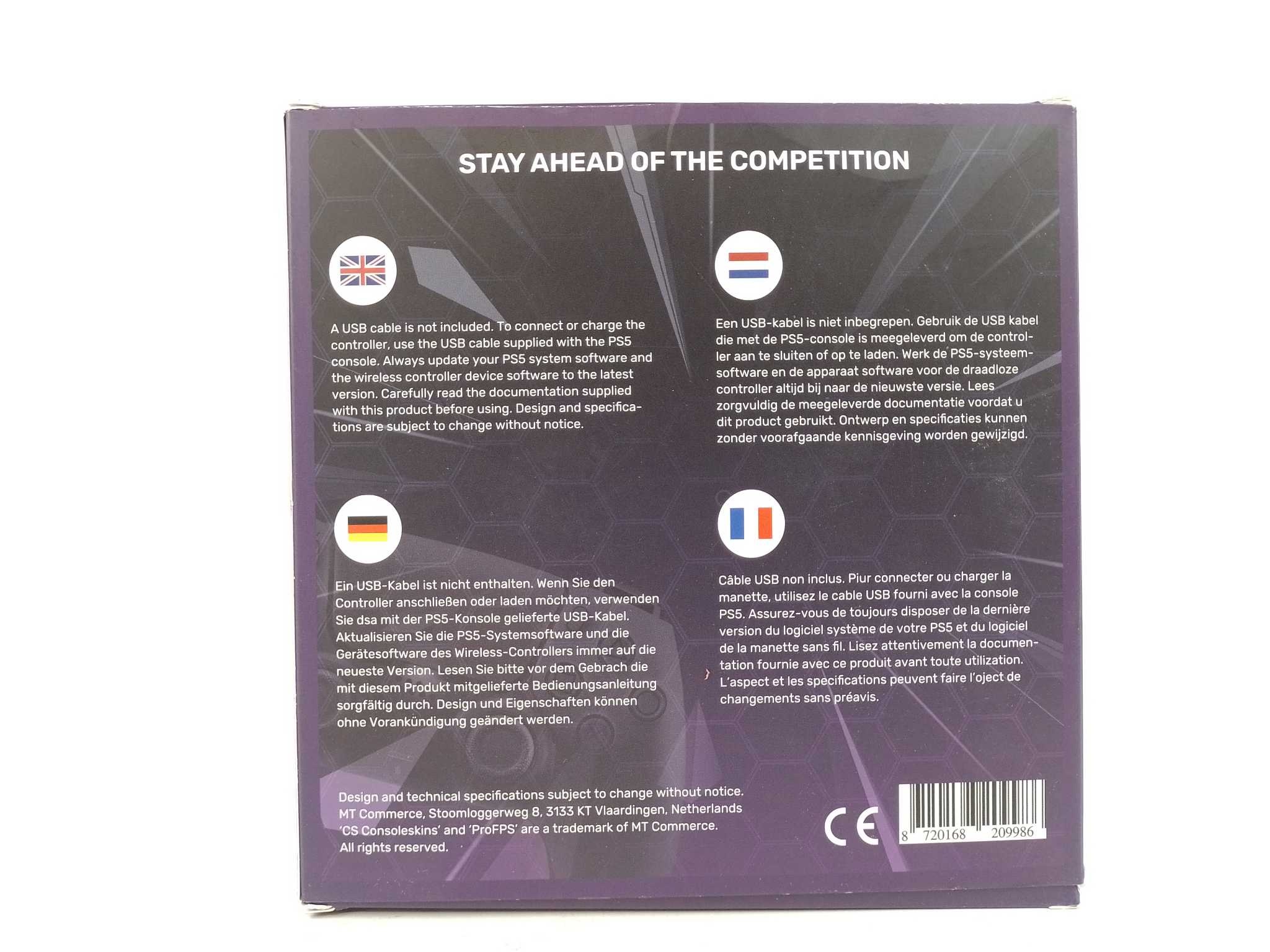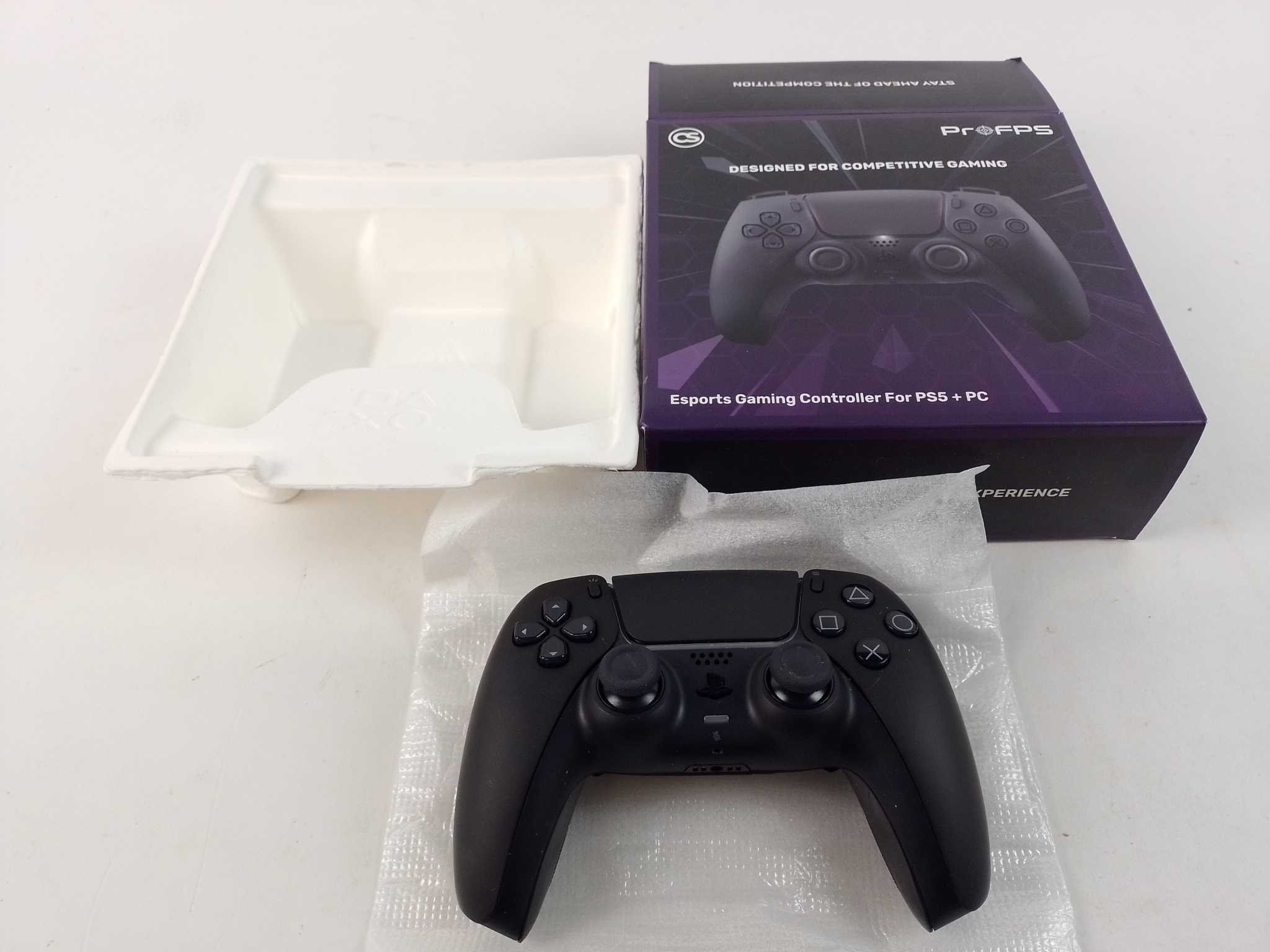 CS eSports Controller - Master Zwart. Game op topniveau met de CS eSports Master controller voor PS5 en pc. Vier programmeerbare paddles geven directe acties zonder je duimen te verplaatsen. Muiskliktriggers op L1/L2/R1/R2 zorgen voor razendsnelle respons, ideaal voor shooters. Kies jouw grip met 6 verwisselbare thumbsticks en geniet van antislip handgrepen en stevige feedback. De ergonomische vorm met speaker, touchpad en 3,5 mm headsetaansluiting houdt elke sessie comfortabel. Draadloos spelen of plug & play via kabel. Meegeleverd: 3 m USB-C oplaadkabel, thumbstick-set en handleiding.