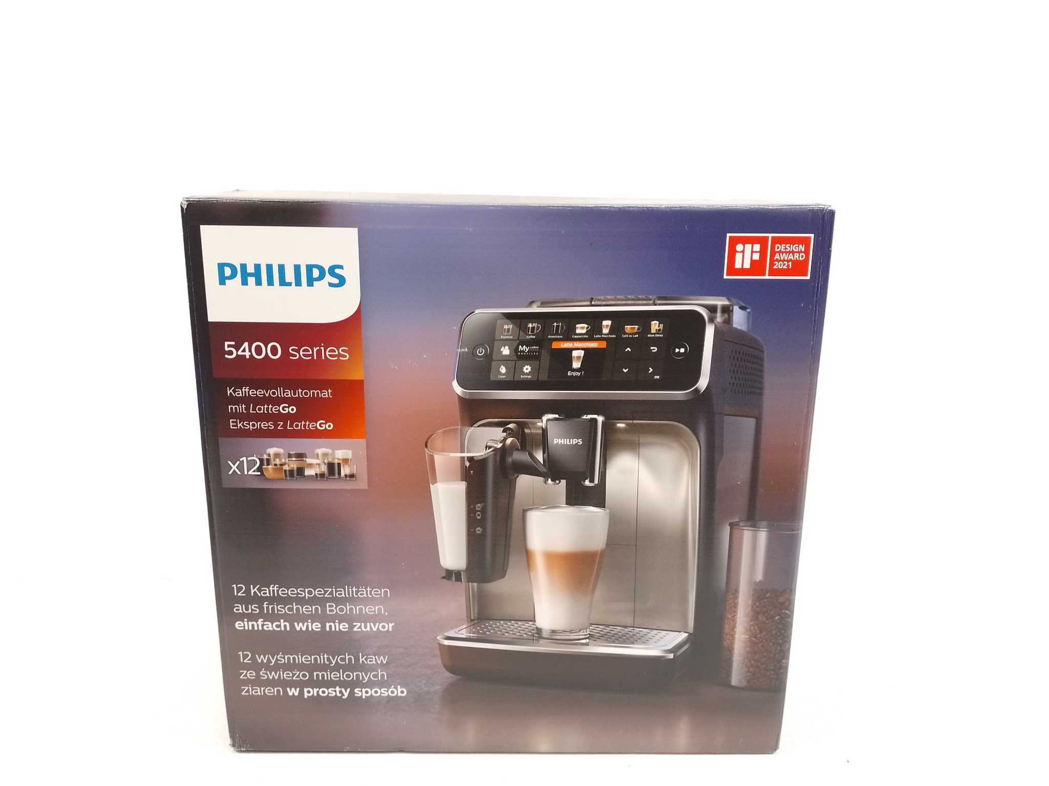 Philips Espressomachine LatteGo 5400 Series - EP5441/50 - Zwart. De Philips 5400 Series EP5441/50 is een volautomatische koffiemachine met LatteGo-melksysteem voor perfect melkschuim. Kies uit 12 koffiespecialiteiten via het kleurendisplay en pas sterkte, hoeveelheid en temperatuur aan naar wens. Het keramische maalwerk met 12 standen zorgt voor optimale smaak. Met een bonenreservoir van 275 gram en 1,8 liter watertank is hij geschikt voor dagelijks gebruik. AquaClean-filter beperkt ontkalking tot een minimum. Ideaal voor koffieliefhebbers. Type product: Espressomachine, Koffiezet apparaat type: Volledig automatisch, Capaciteit watertank: 1,8 l, Koffie invoertype: Koffiebonen, Reservoir voor gezette koffie: Beker, Capaciteit in kopjes: 12 kopjes, Ingebouwde molen. Type beeldscherm: TFT. Vermogen: 1500 W. Kleur van het product: Zwart. Gewicht: 8 kg. Afmetingen: 43 x 25 x 37 cm.