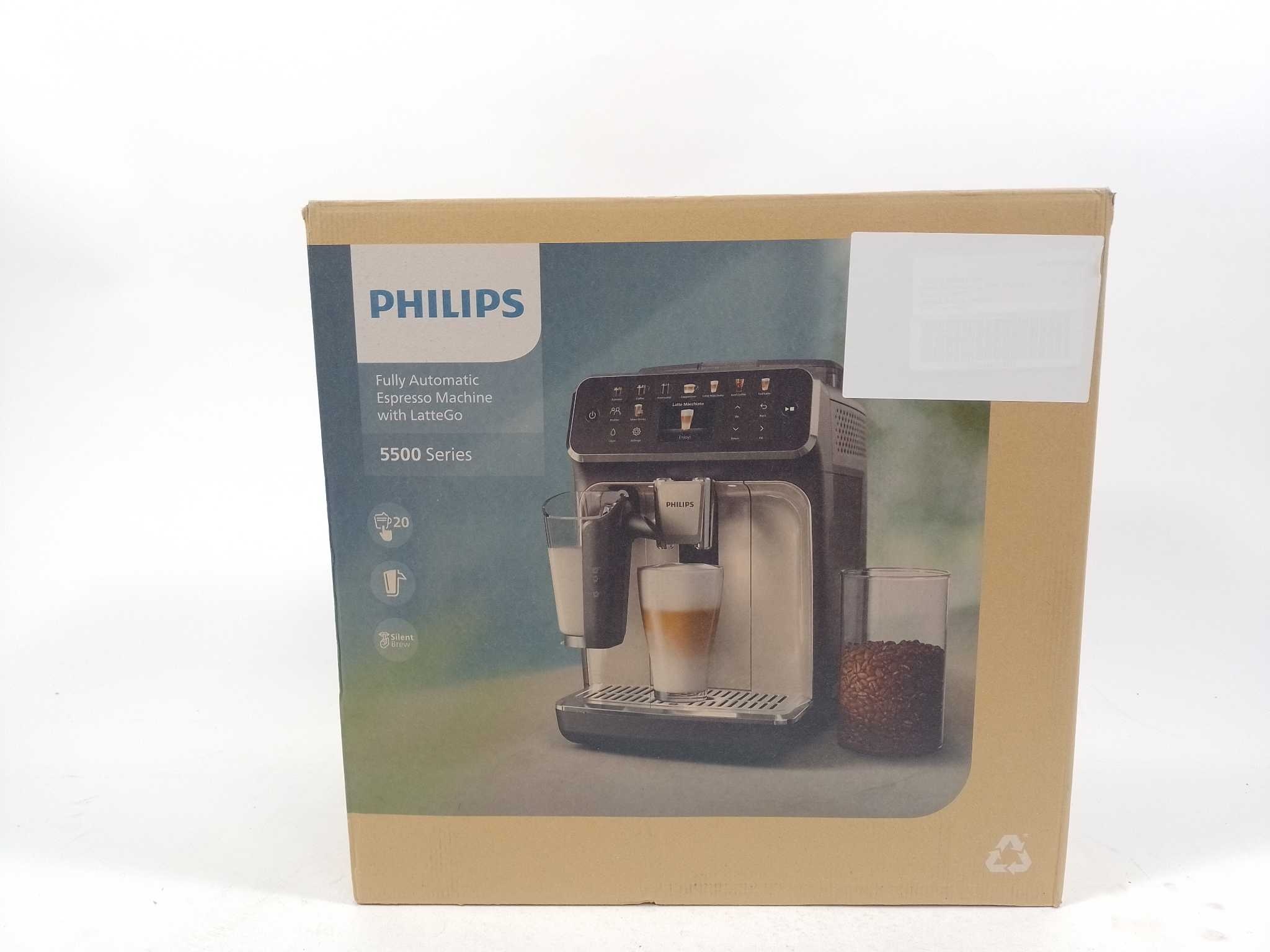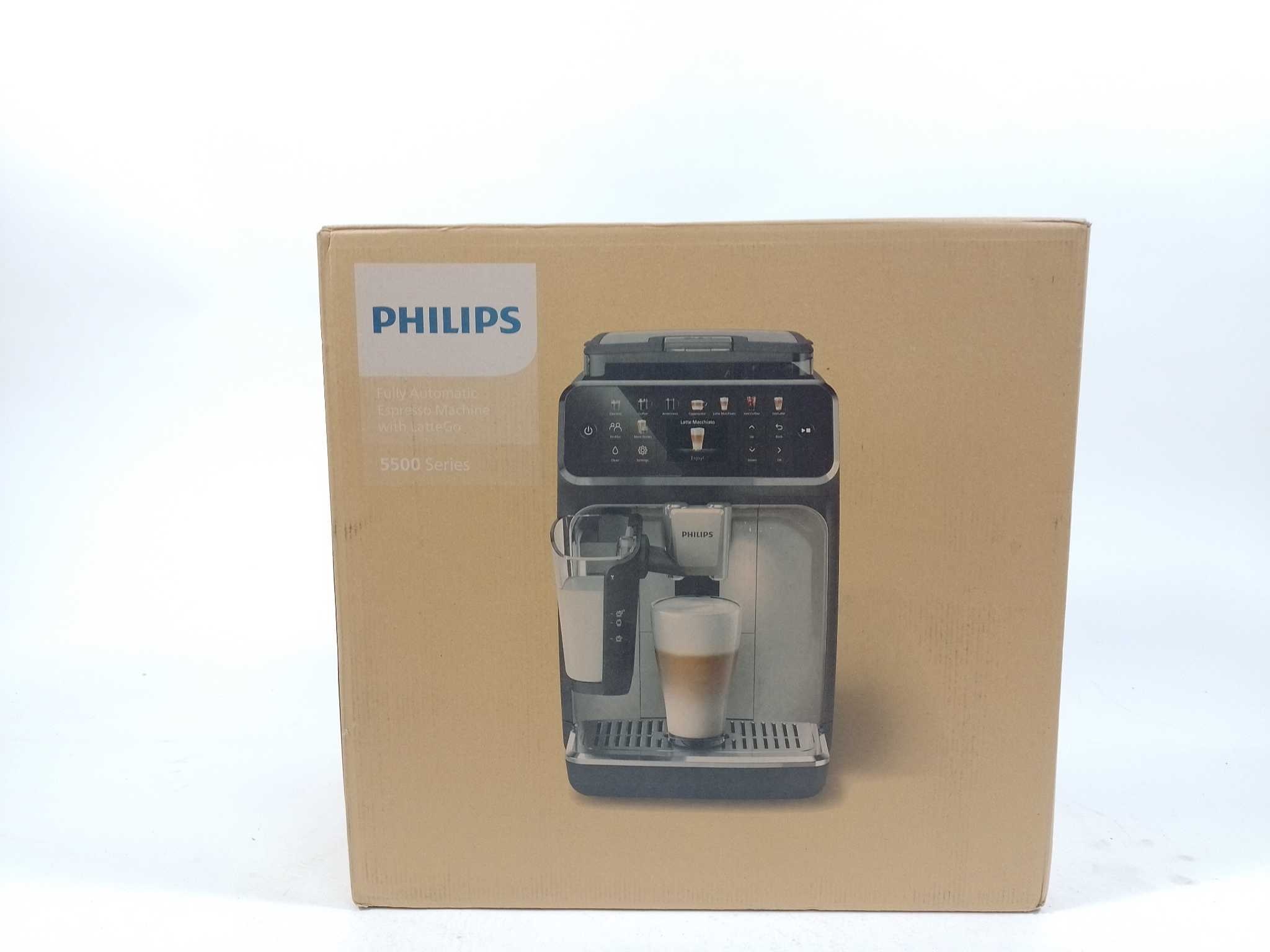Philips Espressomachine Series 5500 - EP5541/50. De Philips 5500 Series volautomatisch espressoapparaat in glanzend zwart biedt ultiem koffiegenot met keuze uit 12 verschillende dranken, waaronder espresso, cappuccino en latte macchiato. Dankzij het gebruiksvriendelijke kleurendisplay, de AquaClean-filtertechnologie en het geïntegreerde LatteGo melksysteem geniet je moeiteloos van baristakwaliteit thuis. Stijlvol, stil en volledig afgestemd op jouw koffiewensen! Type product: Espressomachine, Koffiezet apparaat type: Volledig automatisch, Capaciteit watertank: 1,8 l, Koffie invoertype: Koffiebonen, Reservoir voor gezette koffie: Beker, Capaciteit in kopjes: 2 kopjes, Ingebouwde molen. Type beeldscherm: TFT. Vermogen: 230 W. Kleur van het product: Zwart