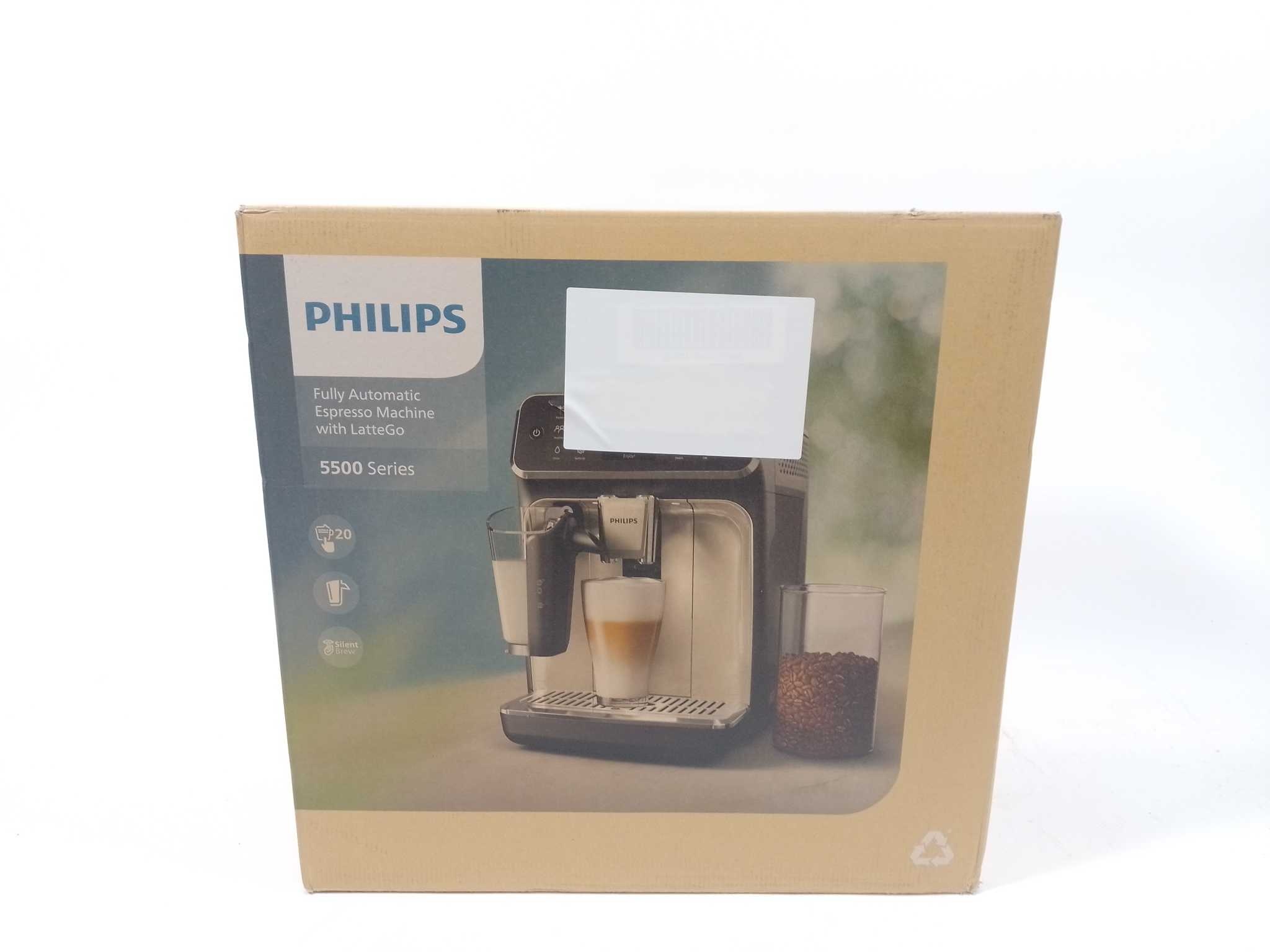 Philips Espressomachine Series 5500 - EP5541/50. De Philips 5500 Series volautomatisch espressoapparaat in glanzend zwart biedt ultiem koffiegenot met keuze uit 12 verschillende dranken, waaronder espresso, cappuccino en latte macchiato. Dankzij het gebruiksvriendelijke kleurendisplay, de AquaClean-filtertechnologie en het geïntegreerde LatteGo melksysteem geniet je moeiteloos van baristakwaliteit thuis. Stijlvol, stil en volledig afgestemd op jouw koffiewensen! Type product: Espressomachine, Koffiezet apparaat type: Volledig automatisch, Capaciteit watertank: 1,8 l, Koffie invoertype: Koffiebonen, Reservoir voor gezette koffie: Beker, Capaciteit in kopjes: 2 kopjes, Ingebouwde molen. Type beeldscherm: TFT. Vermogen: 230 W. Kleur van het product: Zwart
