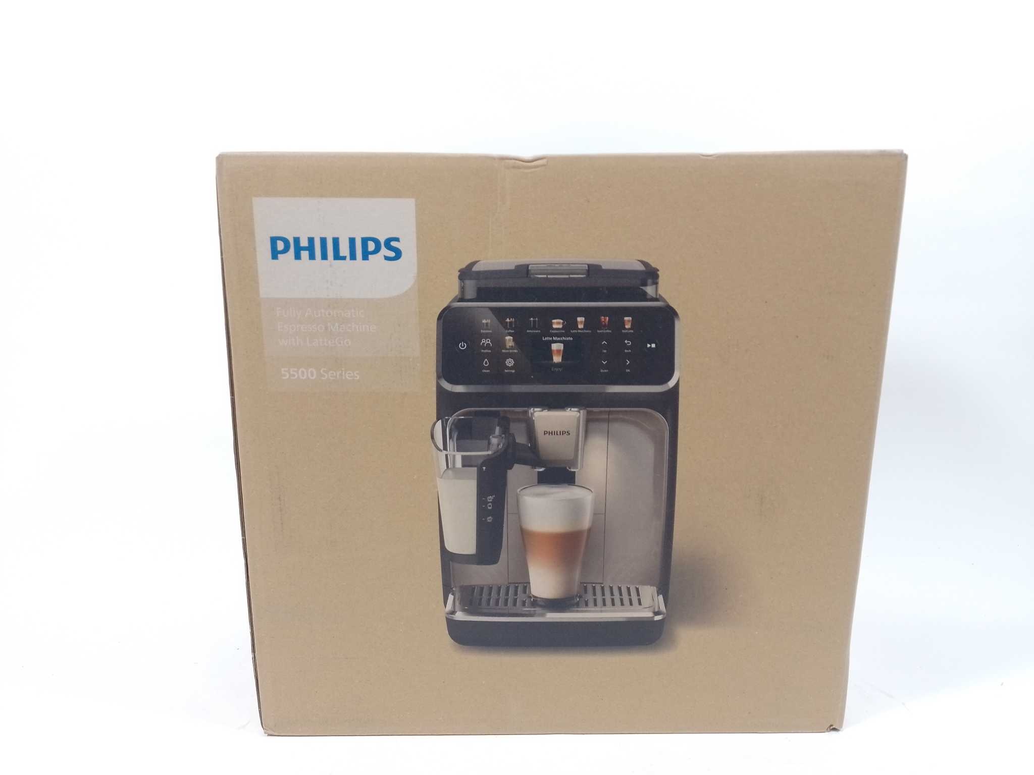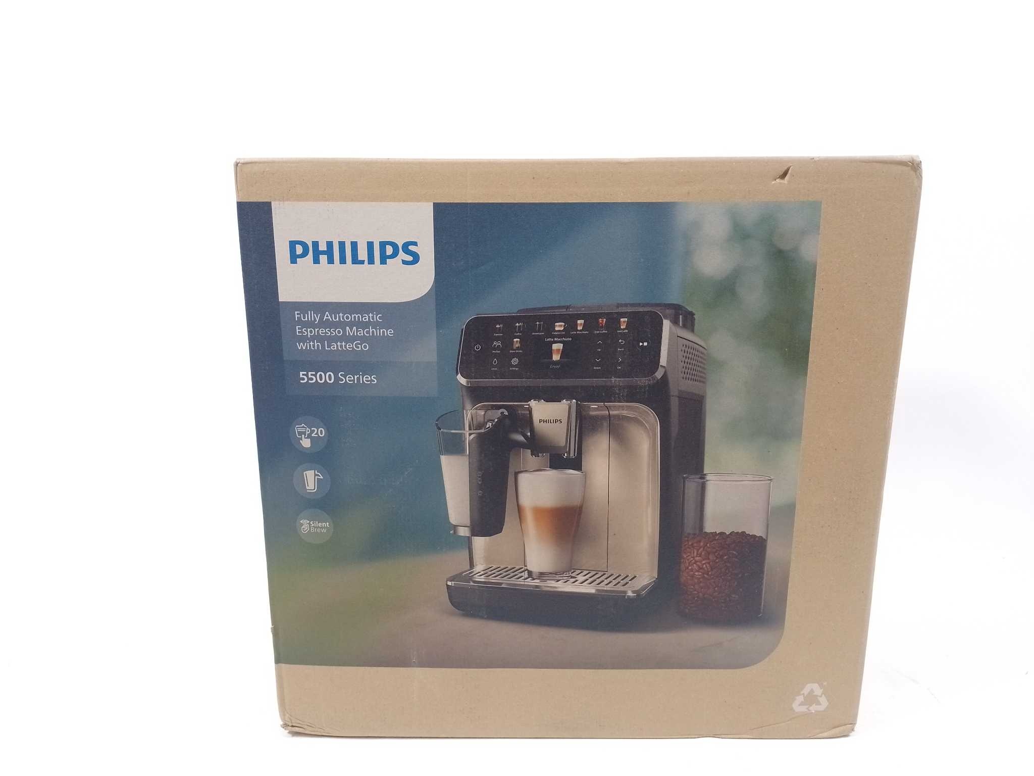 Philips Espressomachine Series 5500 - EP5541/50. De Philips 5500 Series volautomatisch espressoapparaat in glanzend zwart biedt ultiem koffiegenot met keuze uit 12 verschillende dranken, waaronder espresso, cappuccino en latte macchiato. Dankzij het gebruiksvriendelijke kleurendisplay, de AquaClean-filtertechnologie en het geïntegreerde LatteGo melksysteem geniet je moeiteloos van baristakwaliteit thuis. Stijlvol, stil en volledig afgestemd op jouw koffiewensen! Type product: Espressomachine, Koffiezet apparaat type: Volledig automatisch, Capaciteit watertank: 1,8 l, Koffie invoertype: Koffiebonen, Reservoir voor gezette koffie: Beker, Capaciteit in kopjes: 2 kopjes, Ingebouwde molen. Type beeldscherm: TFT. Vermogen: 230 W. Kleur van het product: Zwart