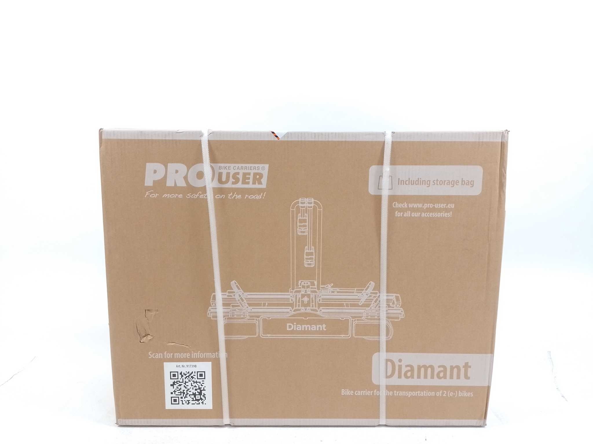 Pro User Fietsendrager Diamant 91739B. De Pro‑User Diamant fietsendrager is een robuuste trekhaakdrager voor 2 fietsen, ontworpen voor vrijwel alle trekhaken en geschikt voor e‑bikes (tot 60 kg totaalgewicht). Dankzij aluminium en stalen constructie is hi