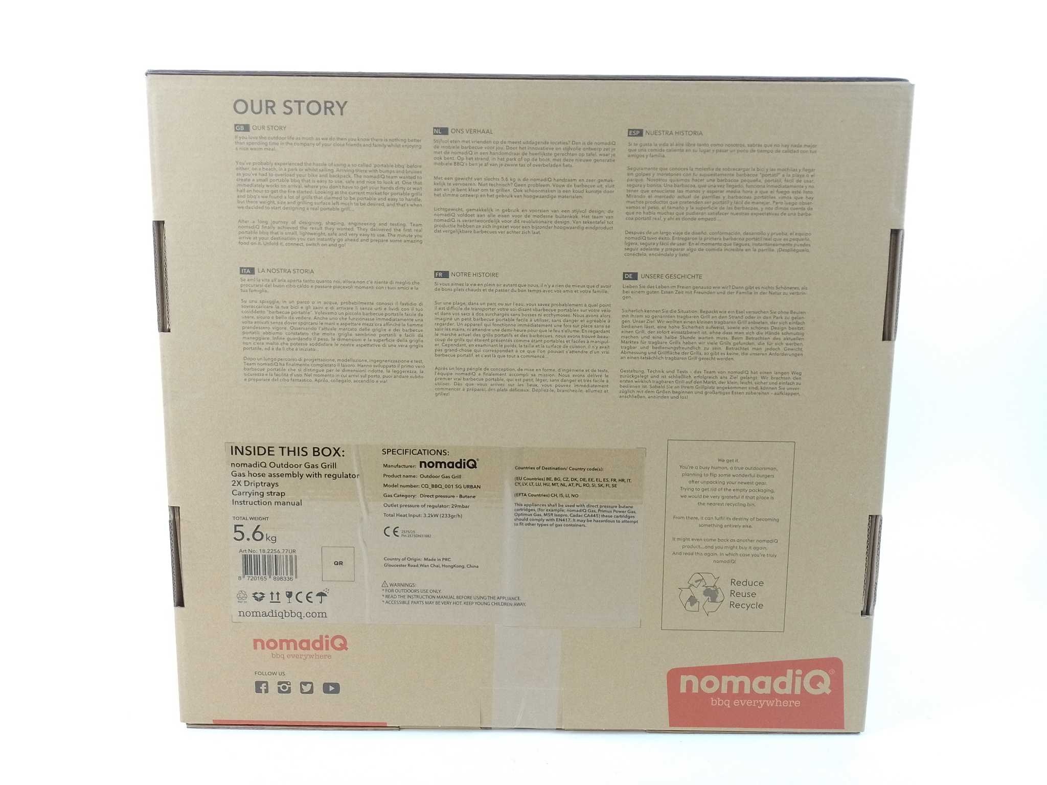 NomadiQ Gasbarbecue Draagbaar 3.0 - Urban Gray. Neem de nomadiQ BBQ 3.0 Urban Grey overal mee: ultralichte, draagbare gasbarbecue met twee aparte temperatuurzones voor snel en gelijkmatig grillen. Klapt compact open, binnen één minuut gebruiksklaar, ideaal voor camping, park, balkon of boot. Werkt op 30 mbar wegwerp gascartouches met schroefventiel. Makkelijk schoon te maken. Meegeleverd: PFAS-vrije grillroosters, gasslang, drukverdeler, lekbakjes, schouderriem en handleiding. Stijlvol aluminium ontwerp, krachtige prestaties en nauwkeurige regeling per zijde voor perfecte steaks, groente en vis. Compact, duurzaam en klaar voor spontane barbecue-momenten overal.