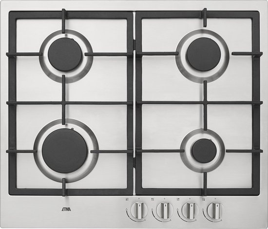 Etna Gaskookplaat 59cm - KG859RVSA_SS. De ETNA KG859RVSA gaskookplaat van 59 cm combineert stijl, veiligheid en kookgemak in een strak RVS ontwerp. Met 4 gasbranders, waaronder een sterkbrander en sudderbrander, bereid je eenvoudig uiteenlopende gerechten