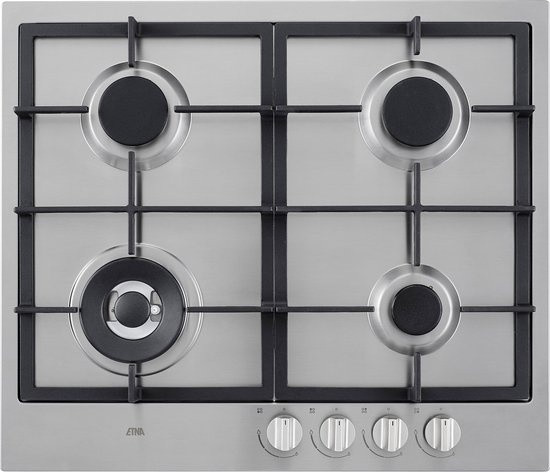 Etna Gaskookplaat Inbouw KG959RVSA. Etna KG959RVSA inbouw gaskookplaat (60 cm) combineert kracht en gebruiksgemak. Vier branders met compacte 3-rings wokbrander leveren snelle hitte. RVS vangschaal, twee gietijzeren pandragers en geïntegreerde vonkontsteking zorgen voor stabiliteit en comfort. Vlambeveiliging verhoogt veiligheid: geen vlam = geen gas. Voorzijde draaiknoppen bieden precieze regeling. Inclusief RVS sudderrooster en installatieset. Past in nagenoeg elke keuken, onderhoudsvriendelijk en strak vormgegeven. Ideaal voor wokken, sudderen en dagelijks koken met betrouwbare prestaties en een luxe, tijdloze roestvrijstalen afwerking. Eenvoudige plaatsing, duurzaam en stil.