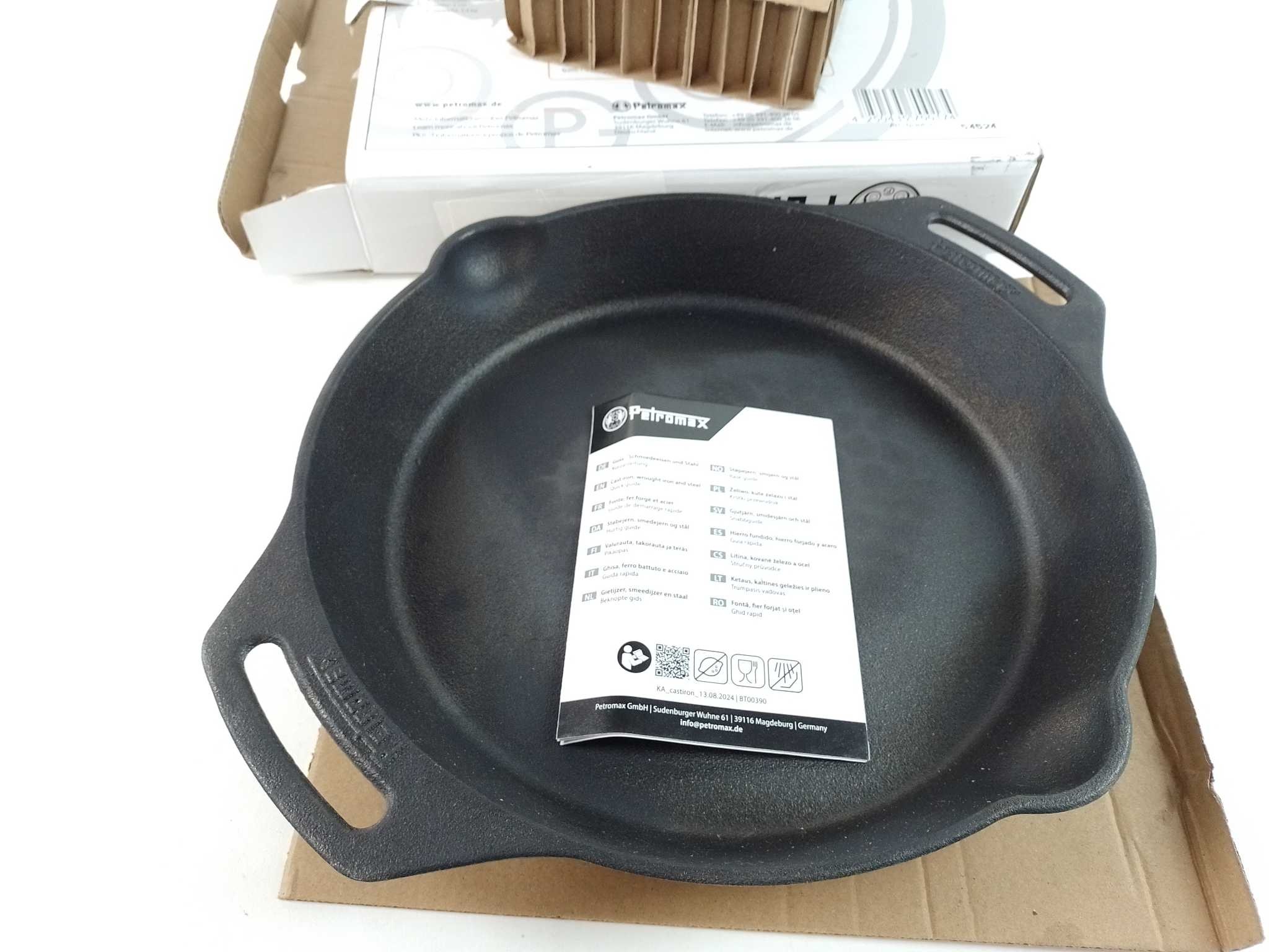 Petromax Gietijzeren Skillet - Ø30 cm. De Petromax gietijzeren skillet met twee handvatten (30 cm) is ideaal voor bakken, braden en grillen op inductie, gas, oven, barbecue of kampvuur. Het voorbehandelde gietijzer verdeelt warmte gelijkmatig en houdt die lang vast voor een krokante korst en sappig resultaat. De dubbele grepen geven veilige controle, ook met ovenwanten. Perfect voor steaks, groenten en éénpansgerechten. Natuurlijk PFAS-vrij, oersterk en gemaakt om jarenlang mee te gaan. Inhoud: 1 skillet en handleiding. Makkelijk te onderhouden: reinigen, drogen en invetten na gebruik.