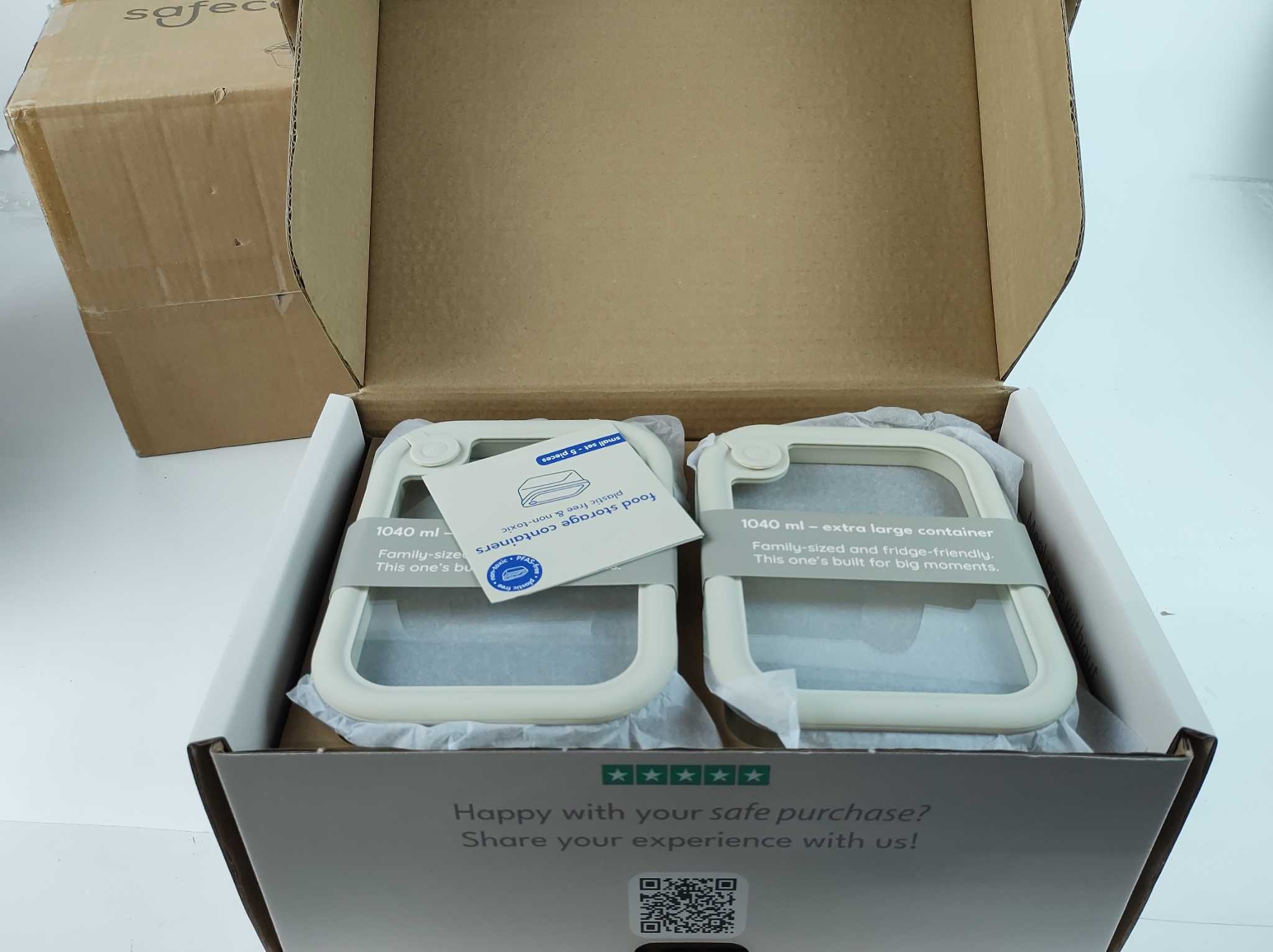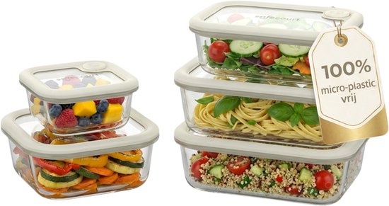 Safecourt Kitchen Glazen Vershoudbakjes - 5-delig. Bewaar en mealprep zonder microplastics met de Safecourt Kitchen glazen vershoudbakjes starterset (5-delig). Elke bewaardoos én het deksel zijn van borosilicaatglas, met een PFAS-vrije siliconen sluitring voor 100% lekvrij en luchtdicht bewaren. Geschikt voor oven en magnetron tot 200 °C, vriezer tot -20 °C en vaatwasser. Inhoud: 2x 1040 ml, 1x 800 ml, 1x 630 ml en 1x 320 ml. Stapelbaar, geurloos en krasvast. Ideaal voor restjes, lunch onderweg en ovengerechten. Transparant design houdt je koelkast overzichtelijk en voorkomt verkleuring.