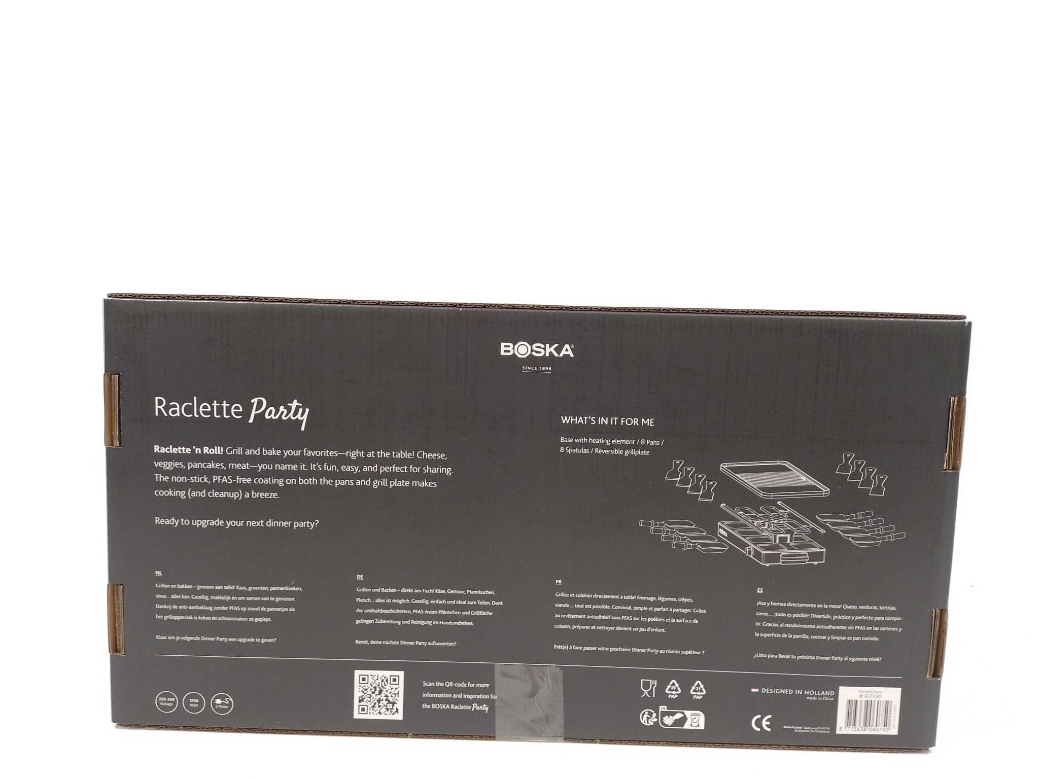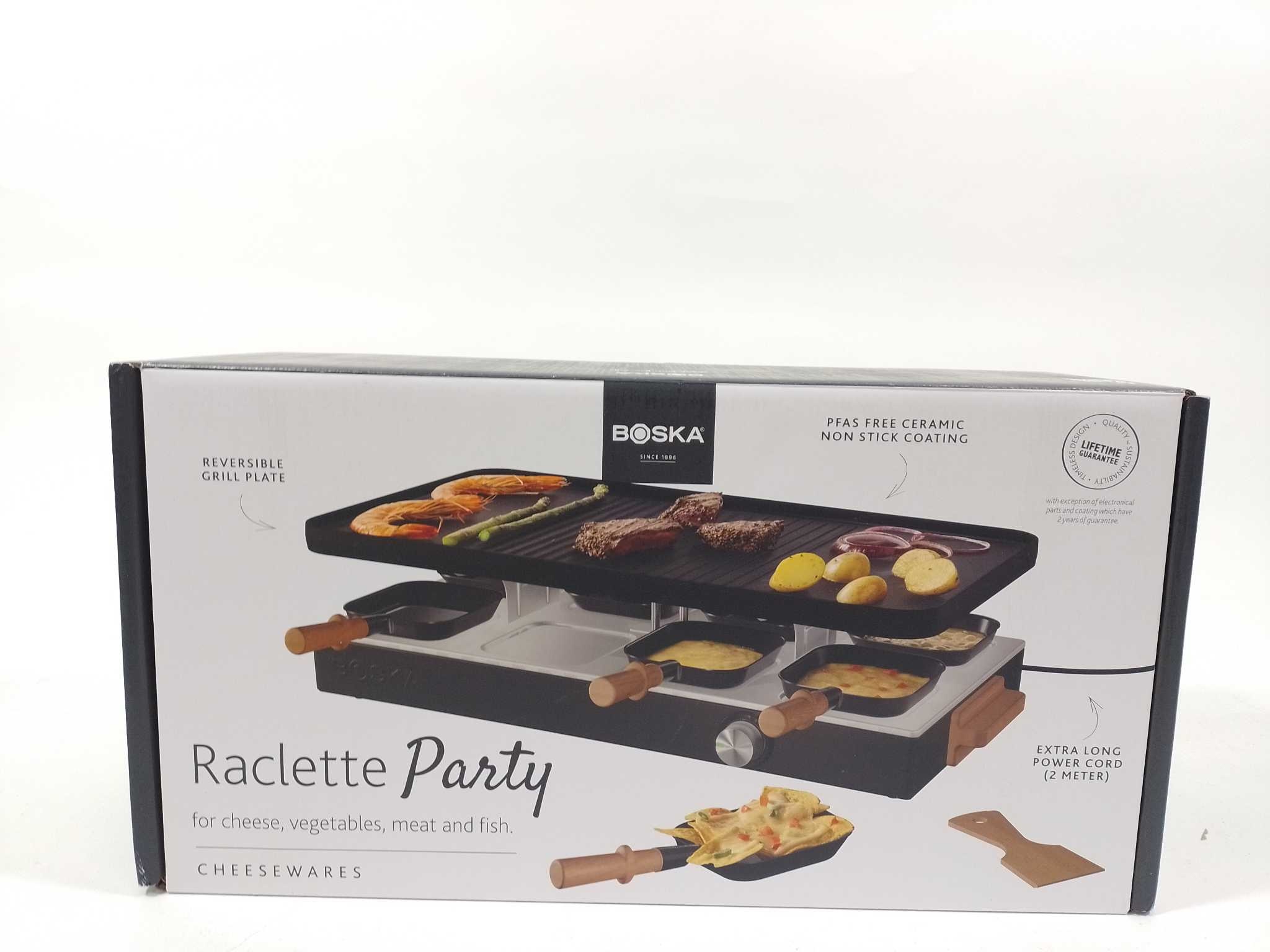 Boska Gourmetstel Gourmet Party - 8 personen. Organiseer een gezellige gourmetavond met de Boska Raclette Gourmet Party voor 8 personen. De stalen behuizing met massief beukenhout oogt luxe en staat stevig op tafel. De omkeerbare gegoten aluminium grillplaat heeft een vlakke kant en een ribbelzone voor vlees, groente en brood. Keramische anti-aanbaklaag en PFAS-vrije pannetjes bakken soepel en zijn snel schoon. Met 1700W en indicatielampje is hij snel klaar. Inclusief 8 pannetjes met houten handvat. Ideaal voor raclette, tapas en kleine gerechtjes, zonder gedoe, met gelijkmatige warmteverdeling.