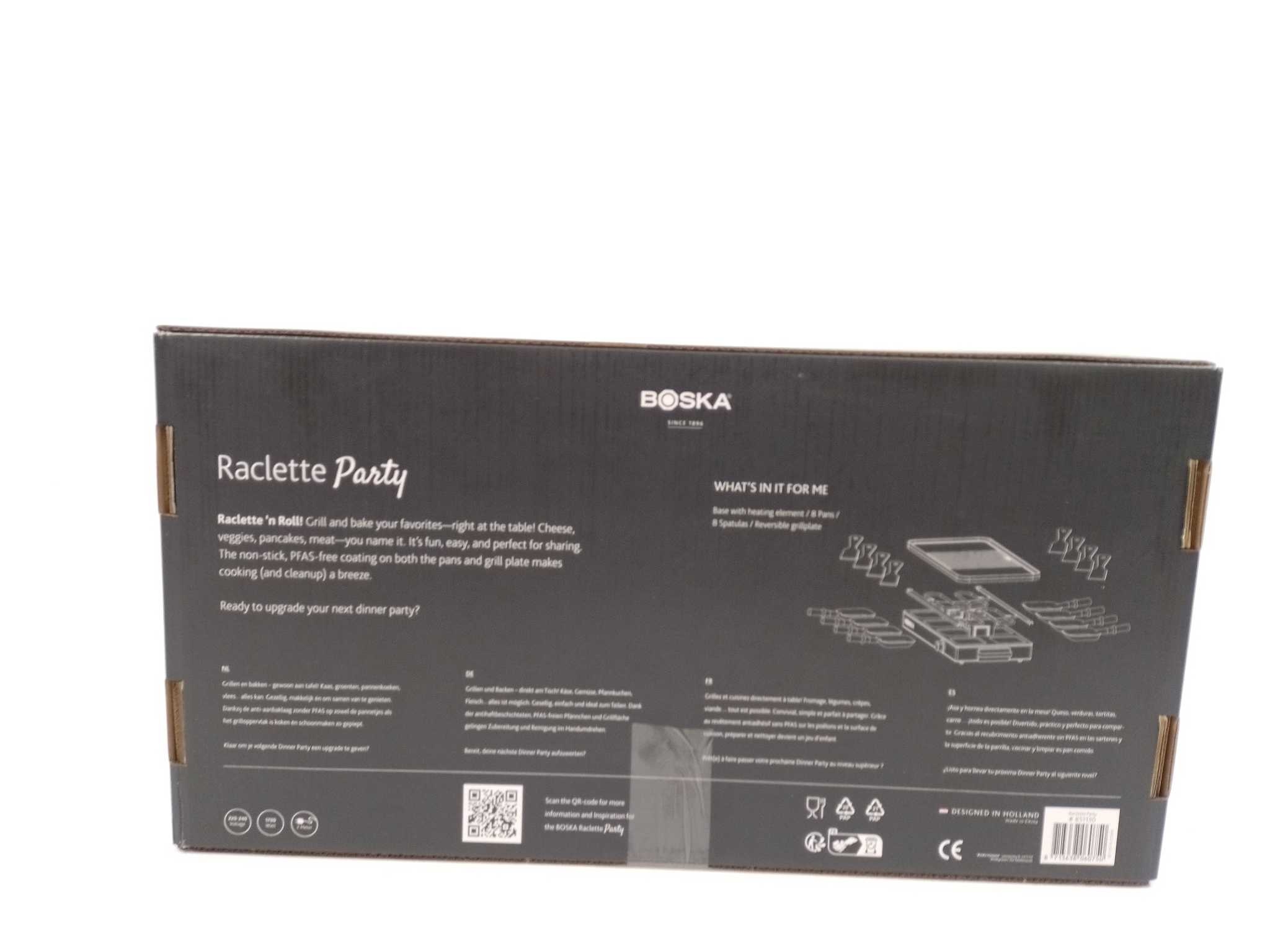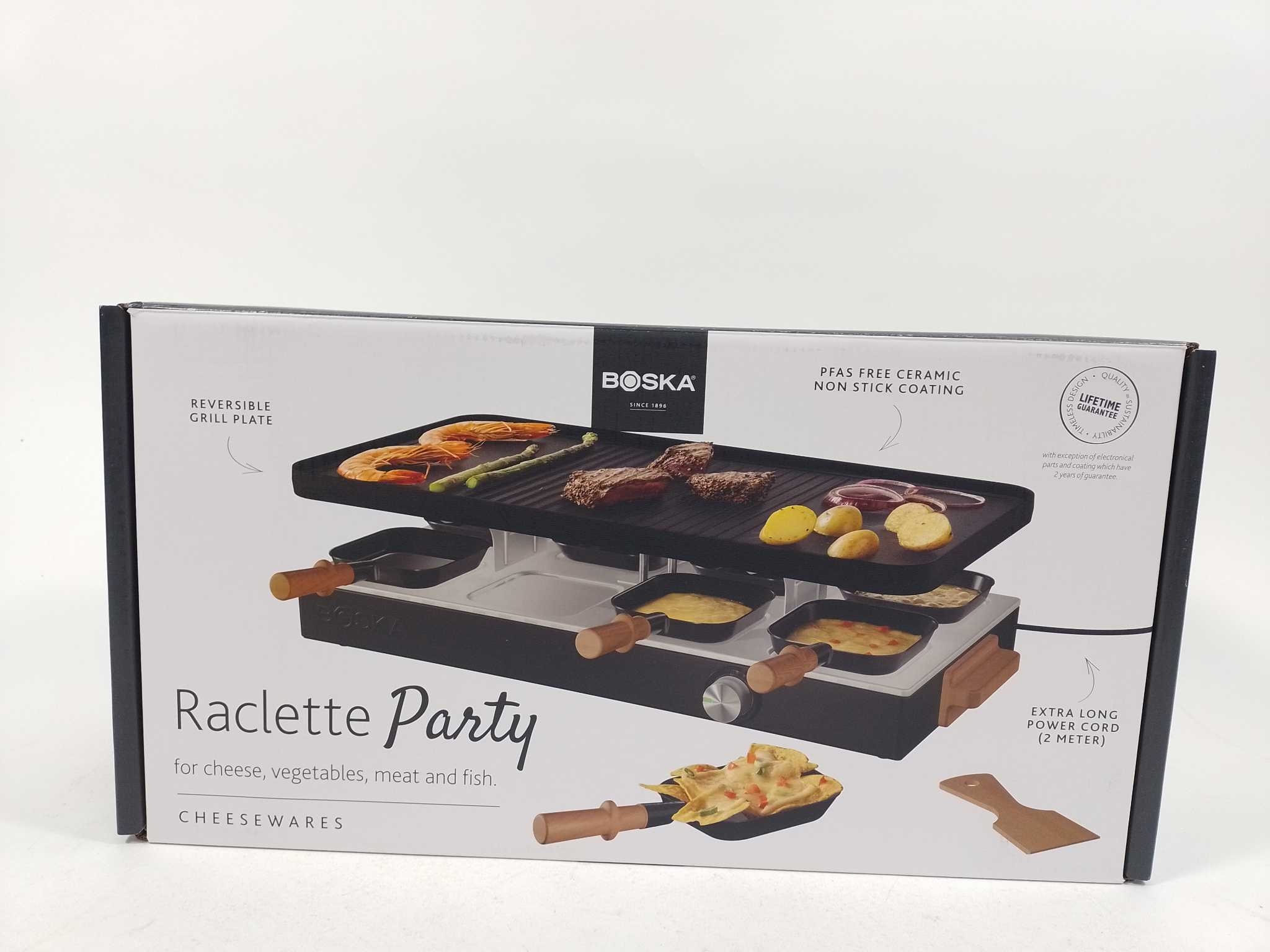 Boska Gourmetstel Gourmet Party - 8 personen. Organiseer een gezellige gourmetavond met de Boska Raclette Gourmet Party voor 8 personen. De stalen behuizing met massief beukenhout oogt luxe en staat stevig op tafel. De omkeerbare gegoten aluminium grillplaat heeft een vlakke kant en een ribbelzone voor vlees, groente en brood. Keramische anti-aanbaklaag en PFAS-vrije pannetjes bakken soepel en zijn snel schoon. Met 1700W en indicatielampje is hij snel klaar. Inclusief 8 pannetjes met houten handvat. Ideaal voor raclette, tapas en kleine gerechtjes, zonder gedoe, met gelijkmatige warmteverdeling.
