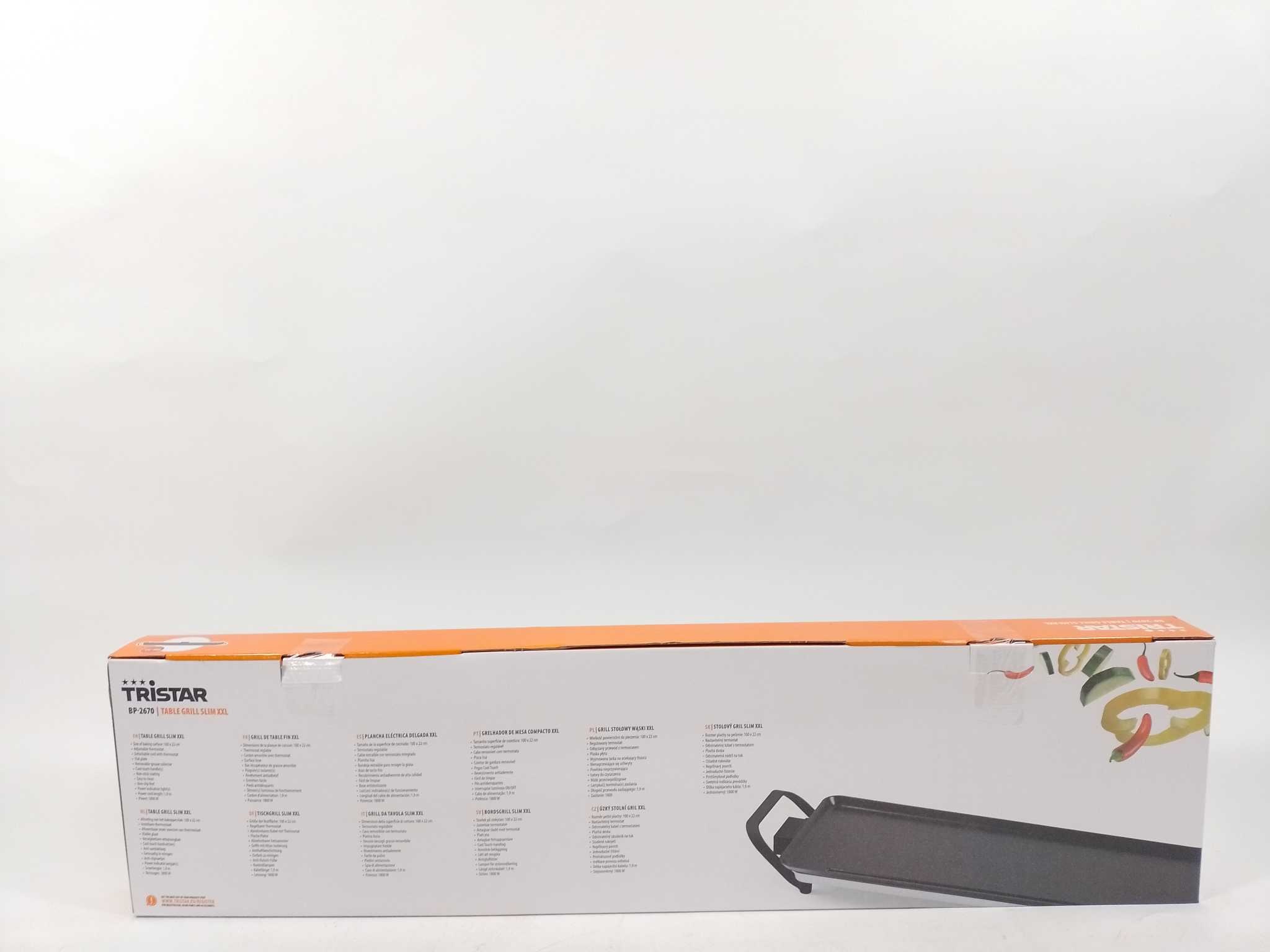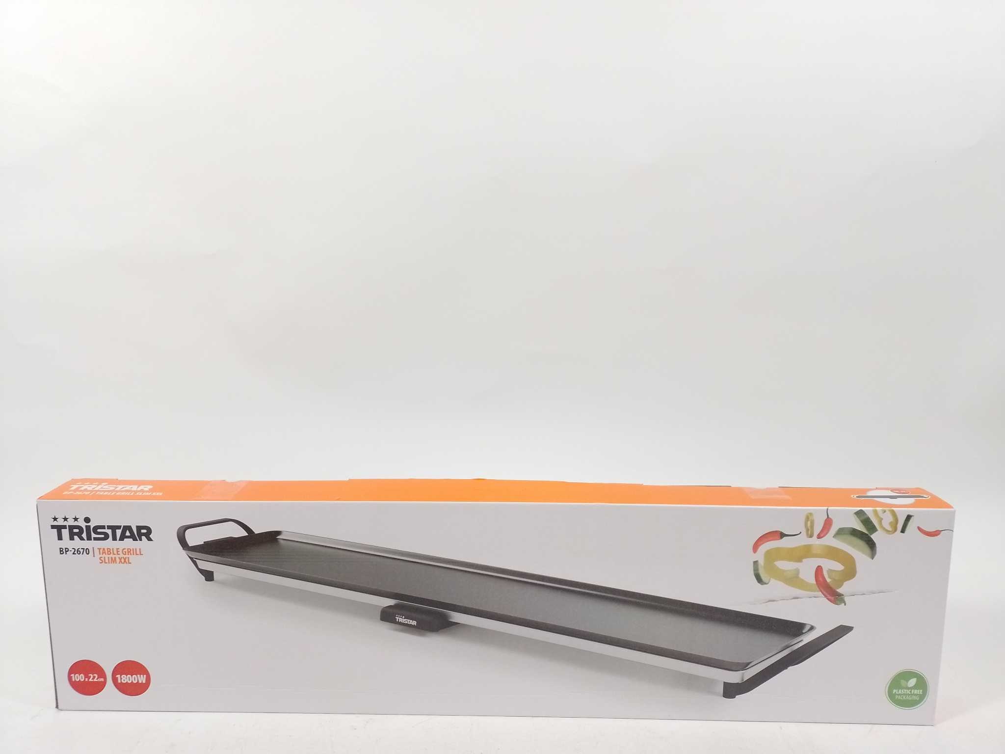 Smartwares Grillplaat BP-2670 - 12 personen. De Tristar BP-2670 Slim XXL is een elektrische tafelgrill met extra groot bakoppervlak van 100×22 cm en 1800W vermogen. De regelbare thermostaat en antiaanbaklaag zorgen voor gelijkmatige, vetarme bereidingen v
