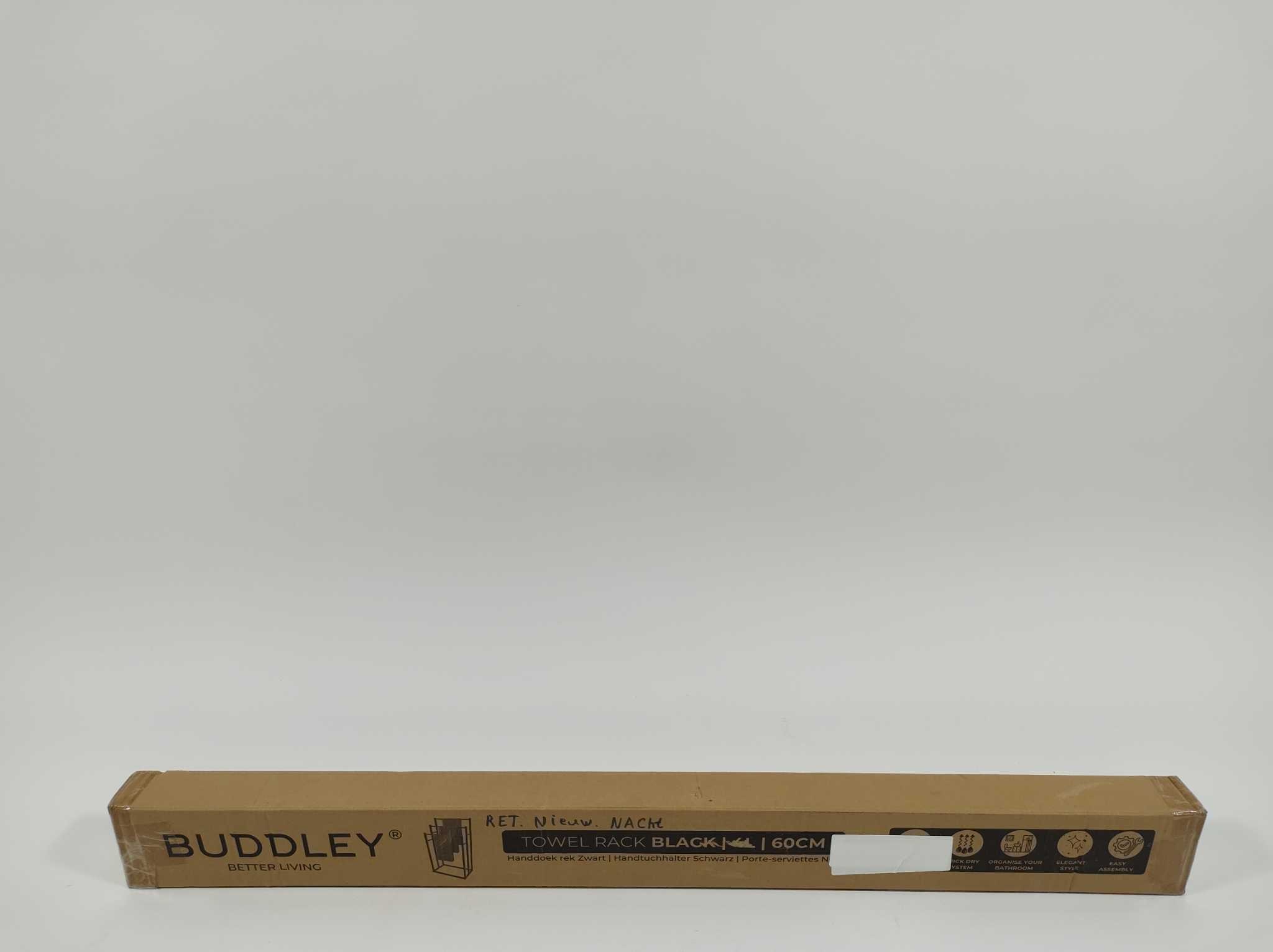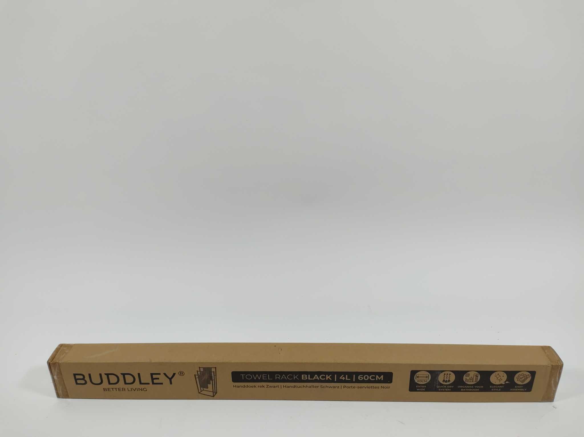 Buddley Handdoekrek - 30x60x94 cm - Zwart. Het Buddley handdoekrek extra breed is een stijlvol vrijstaand handdoekrek voor de badkamer, ontworpen voor brede handdoeken en dagelijks gebruik. Met vier armen en een breedte van 60 cm hang je meerdere handdoeken overzichtelijk op zonder overlap. Dankzij de stabiele tussenstukken en antislip poten staat het rek stevig, zonder boren in de muur. Inclusief bevestigingsmateriaal, antislip pads, inbussleutel en handleiding. De matzwarte afwerking geeft dit handdoekrek een moderne uitstraling in badkamer, slaapkamer of wasruimte voor een opgeruimd en luxe gevoel.