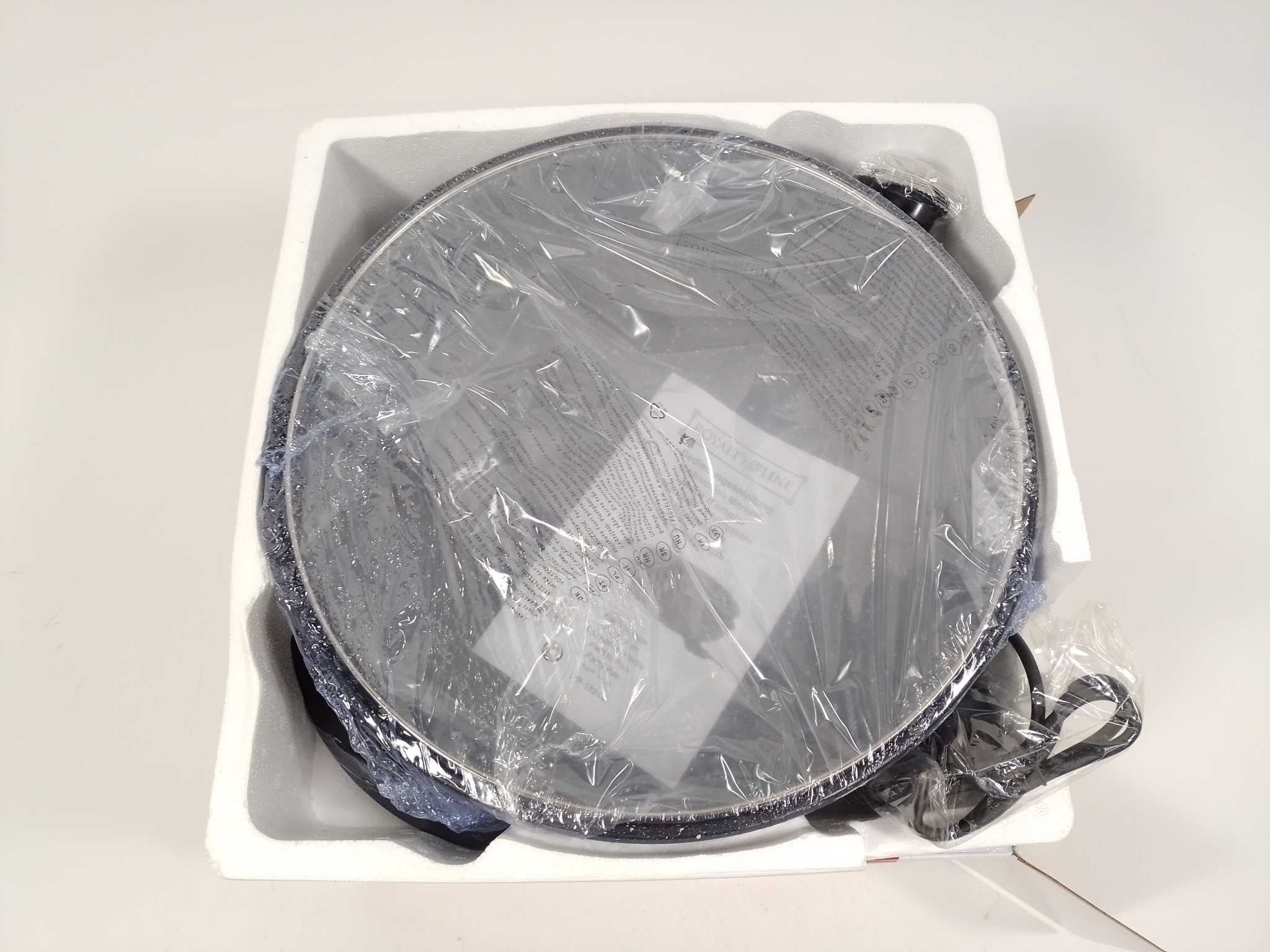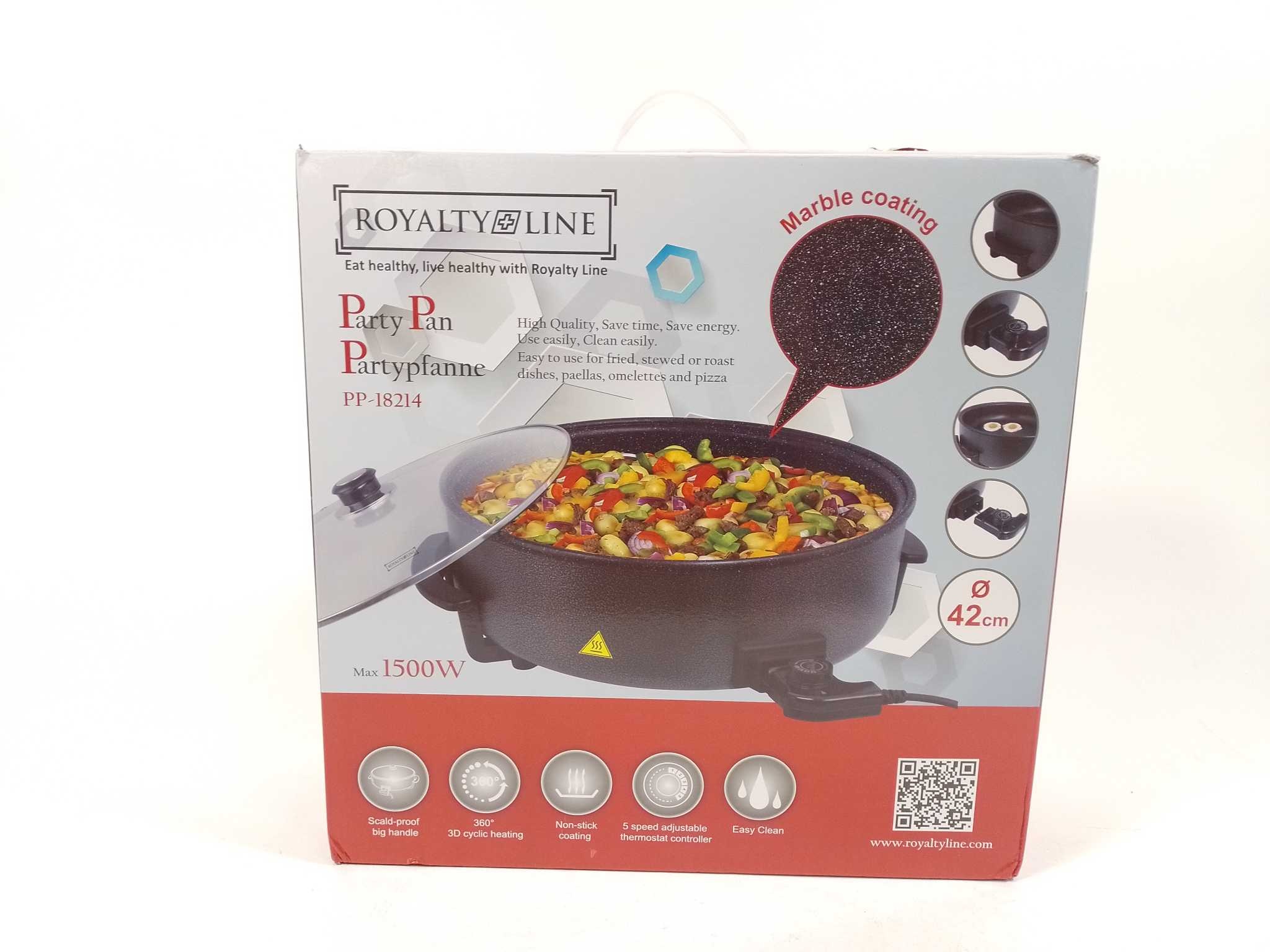 Royalty Line Hapjespan XXL - Ø42cm - PP18214. Met de Royalty Line elektrische hapjespan XXL Ø42 cm kook je grote porties in één keer. De 1500W verwarming en 5 regelbare warmtestanden geven snelle, precieze controle voor paella, stoofschotels, pizza of roerbak. Dankzij de anti-aanbaklaag glijdt eten los en is schoonmaken simpel. Het geharde glazen deksel met stoomuitlaat houdt warmte vast. De diepe pan van 9 cm met antislip bodem blijft stabiel op tafel. Handig: afneembaar snoer met regelbare thermostaat, en een vakverdeling-accessoire voor meerdere gerechten tegelijk. Inclusief handleiding.