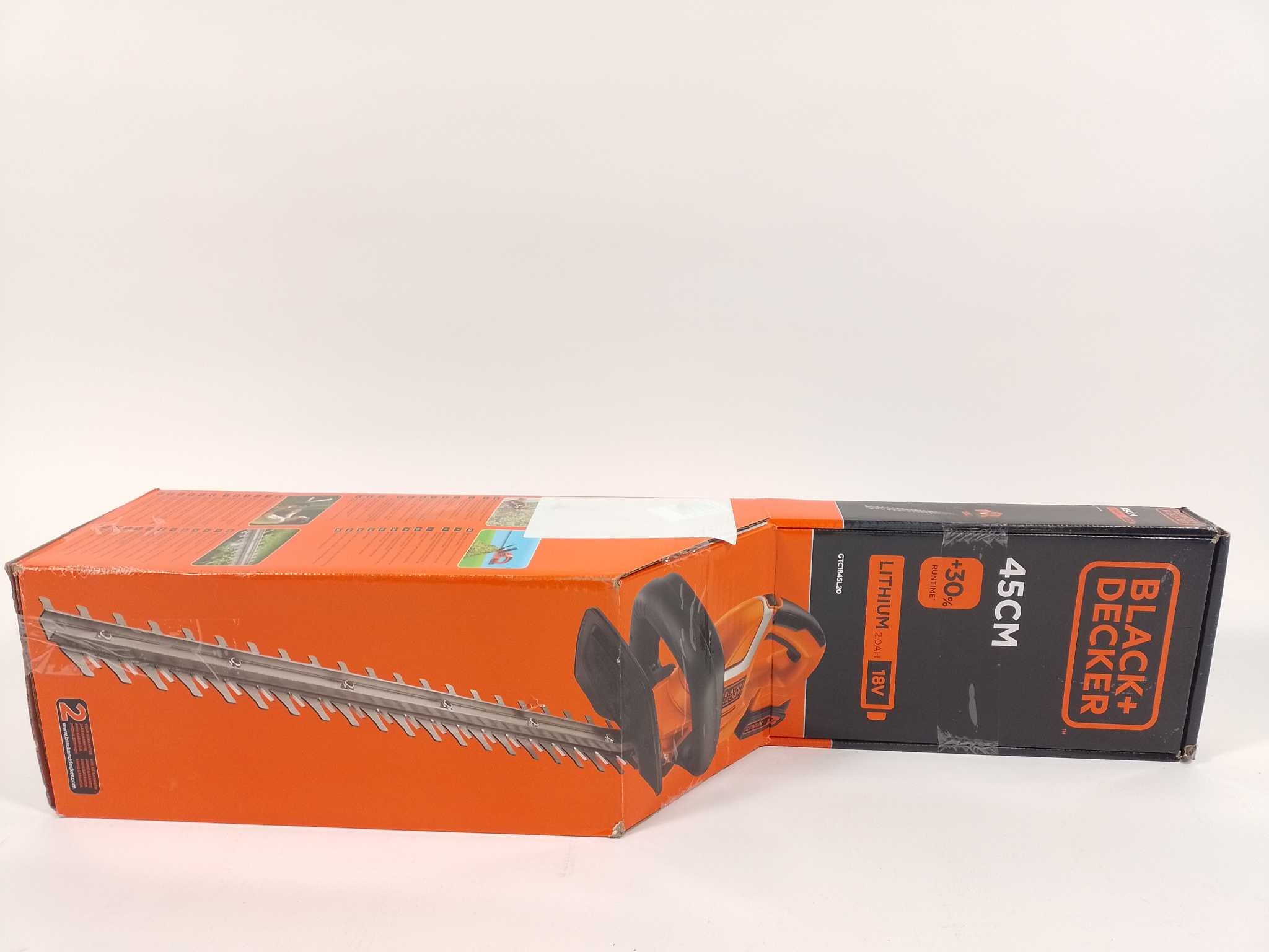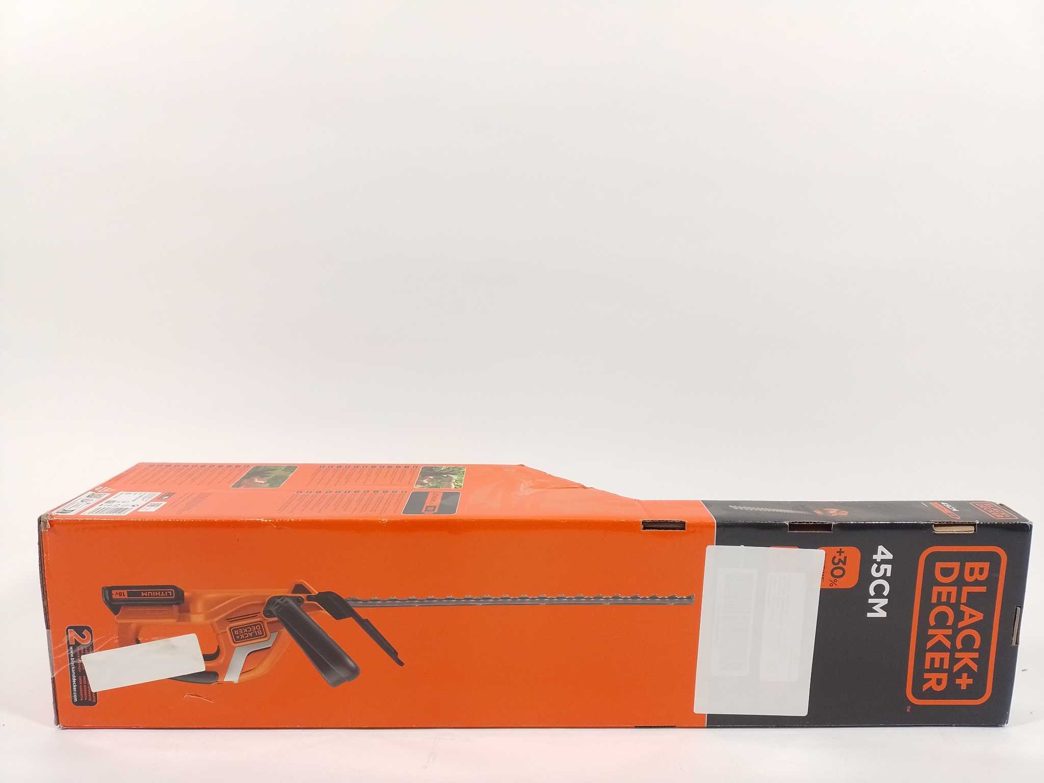 Black + Decker Heggenschaar GTC1845L20-QW. De Black+Decker GTC1845L20-QW heggenschaar is een krachtige 18V accuheggenschaar met een 45 cm meslengte, ideaal voor het snoeien van heggen en struiken. Inclusief accu en oplader, biedt deze heggenschaar uitstekende mobiliteit zonder stroomkabel. Het ergonomische ontwerp zorgt voor comfortabel gebruik, terwijl de krachtige motor een efficiënte snoeiervaring garandeert. Perfect voor zowel lichte als middelzware tuinklussen. Soort: Batterij-aangedreven heggenschaar. Inclusief accu en lader. Lemmetlengte: 45 cm, Bladtype: Dubbel blad. Energie-opslagtechnologie accu/batterij: Lithium, Capaciteit van de accu/batterij: 2000 mAh, Accu/Batterij voltage: 18 V. Gewicht: 2,6 kg. Geluidssterkte (max.): 73,8dB. Kleur: Oranje.