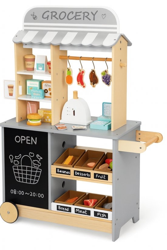 OOOK Houten Speelgoed Supermarkt. Laat kinderen winkeltje spelen met deze houten speelgoed supermarkt in grijs/hout. De stevige winkelkraam heeft schappen, hangrek, mandjes en een krijtbord voor aanbiedingen. Met de speelgoedkassa en weegschaal kunnen ze