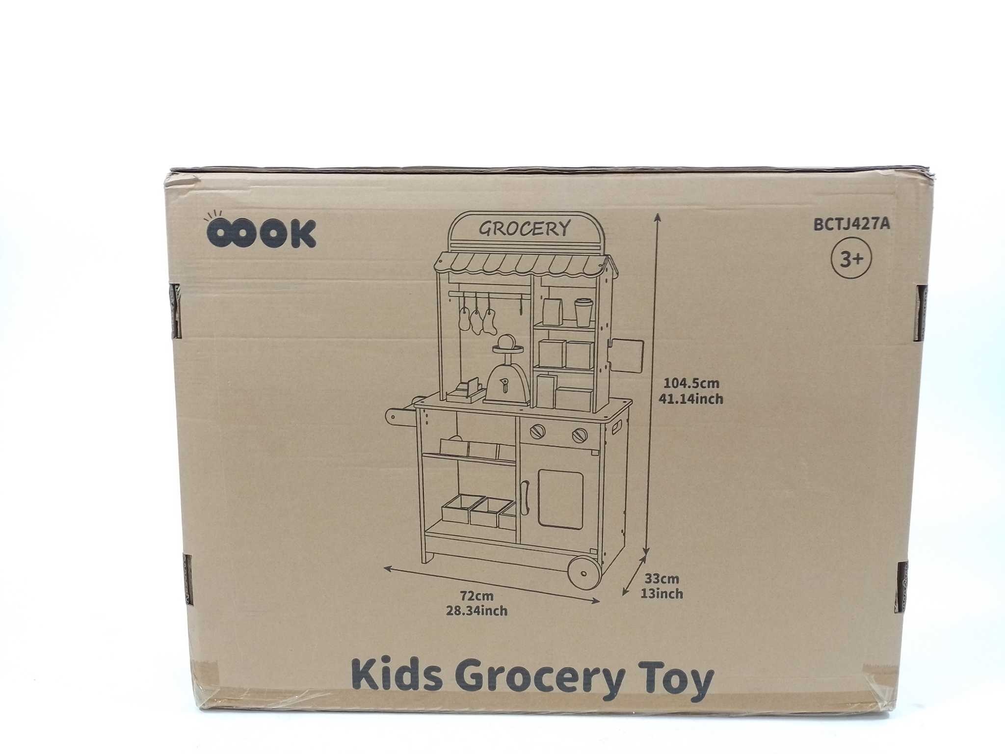 OOOK Houten Speelgoed Supermarkt. Laat kinderen winkeltje spelen met deze houten speelgoed supermarkt in grijs/hout. De stevige winkelkraam heeft schappen, hangrek, mandjes en een krijtbord voor aanbiedingen. Met de speelgoedkassa en weegschaal kunnen ze scannen, wegen en afrekenen zoals in het echt. Neutrale kleuren passen in elke speelkamer en blijven jarenlang mooi. Meer dan veertig accessoires zorgen voor eindeloos rollenspel: speelgeld, betaalkaarten, fruit, groenten, brood, zuivel, vleeswaren, snacks, mini verpakkingen en vier metalen S-haakjes. Stimuleert fantasie, taal, tellen en sociale vaardigheden vanaf 2 jaar.