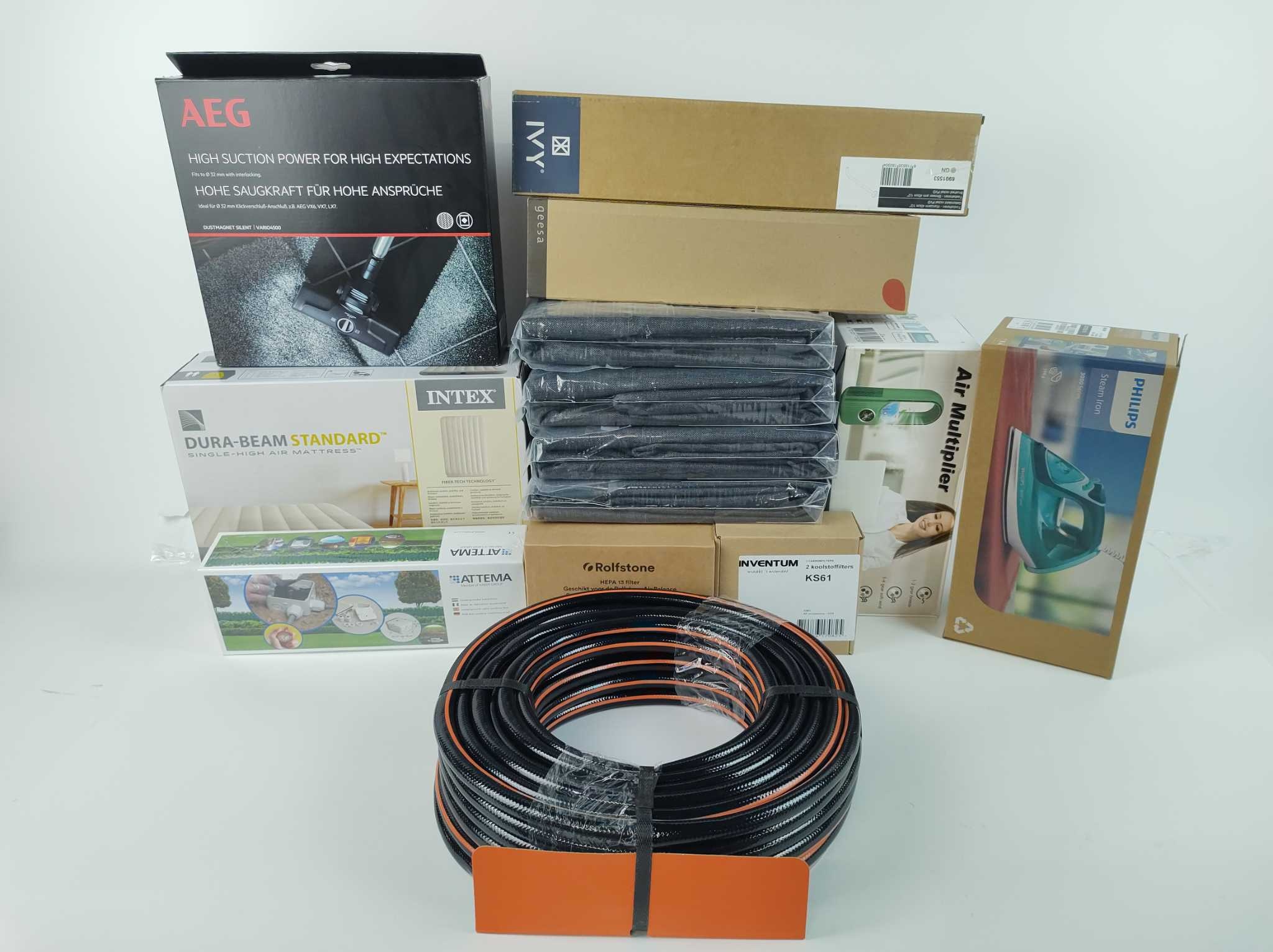 Voordeelbox Huishoudartikelen #1. Deze voordeelbox Huishoudartikelen bevat: 14 artikelen (11 uniek) met o.a. Vertylo mini airco 4-in-1 (koeler/bevochtiger/ventilator/nachtlamp), Philips 3000 Series stoomstrijkijzer, BLACK+DECKER tuinslang (25m), Geesa Nemox toiletborstelset (brushed metal black) en een IVY wandarm (geborsteld nikkel PVD). Verder: 4x kant-en-klaar gordijn (antraciet), Vario4500 combizuigmond, Intex Dura-Beam luchtbed, diverse filters (o.a. HEPA/actief koolstof) en een Attema waterdichte grondkabeldoos. Totale winkelwaarde ca. €623,82, maar bij retourplaza scoor je ’m als scherpe voordeelbox. Ideaal voor doorverkoop of projectinrichting. Op=op—bestel nu!