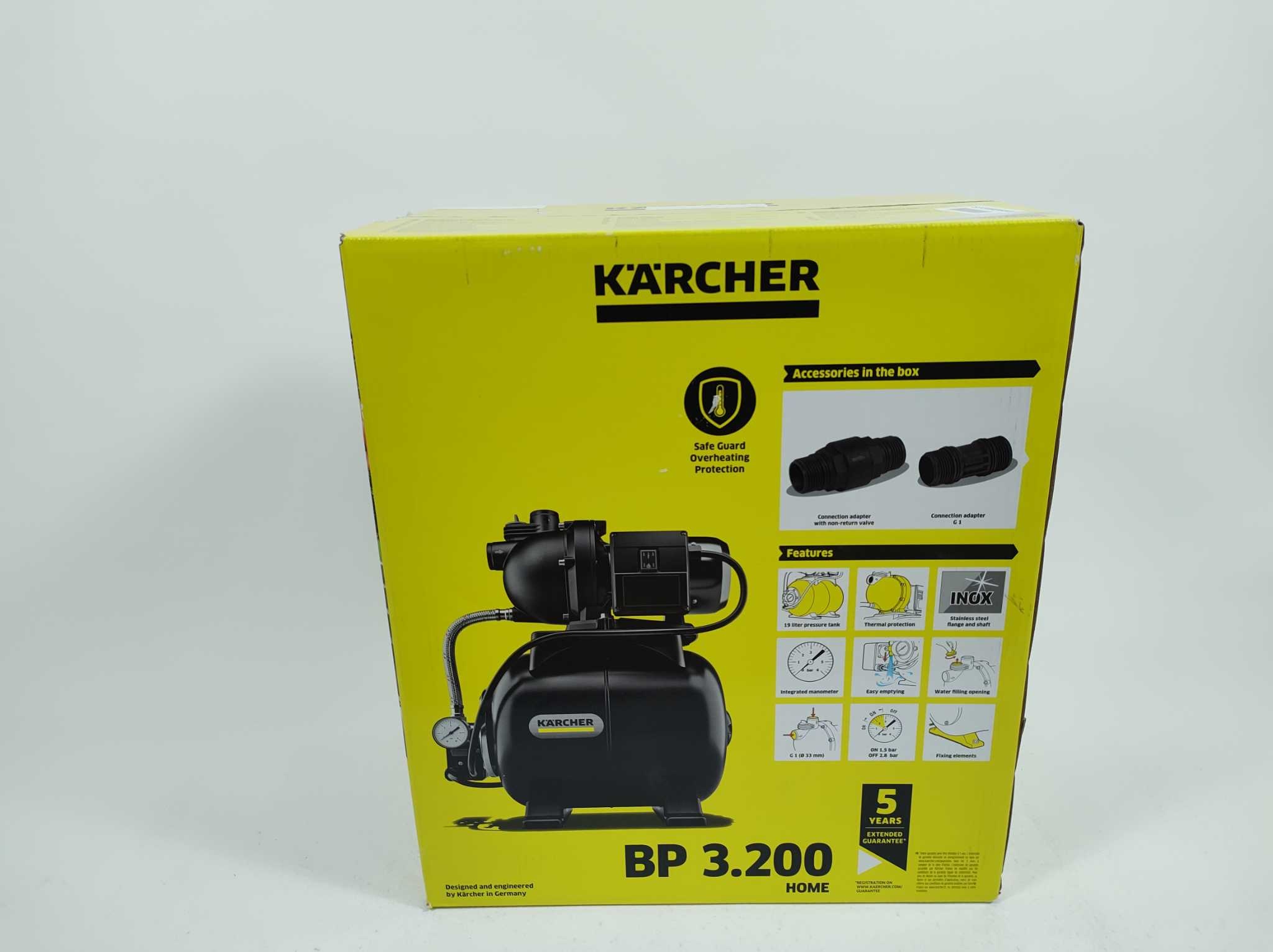 Kärcher Hydrofoorpomp BP 3.200 Home. De Kärcher BP 3.200 Home is een compacte hydrofoorpomp voor huishoudelijk gebruik. Met geïntegreerd 19-liter drukvat, automatische aan/uit-functie en thermische beveiliging levert hij betrouwbaar water voor toilet, wasmachine en tappunten. De drukindicator helpt bij controle, spatwaterdichte schakelaar en stevige pomppoten bieden veilig gebruik. Inclusief geïntegreerd drukvat, drukindicator en netsnoer. Eenvoudig te installeren op G1-aansluiting, geschikt voor regen- en bronwater. Efficiënt, duurzaam en ideaal als huiswatersysteem voor constante waterdruk in het hele huis. Compact ontwerp past stevig en trillingsarm op vloer.